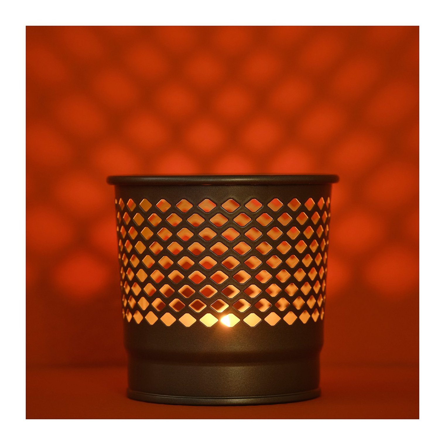 Свет свечей просвечивает сквозь ажурный металл и создает декоративные узоры и приятную атмосферу.