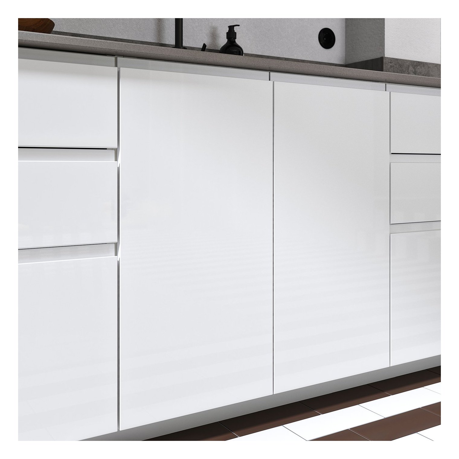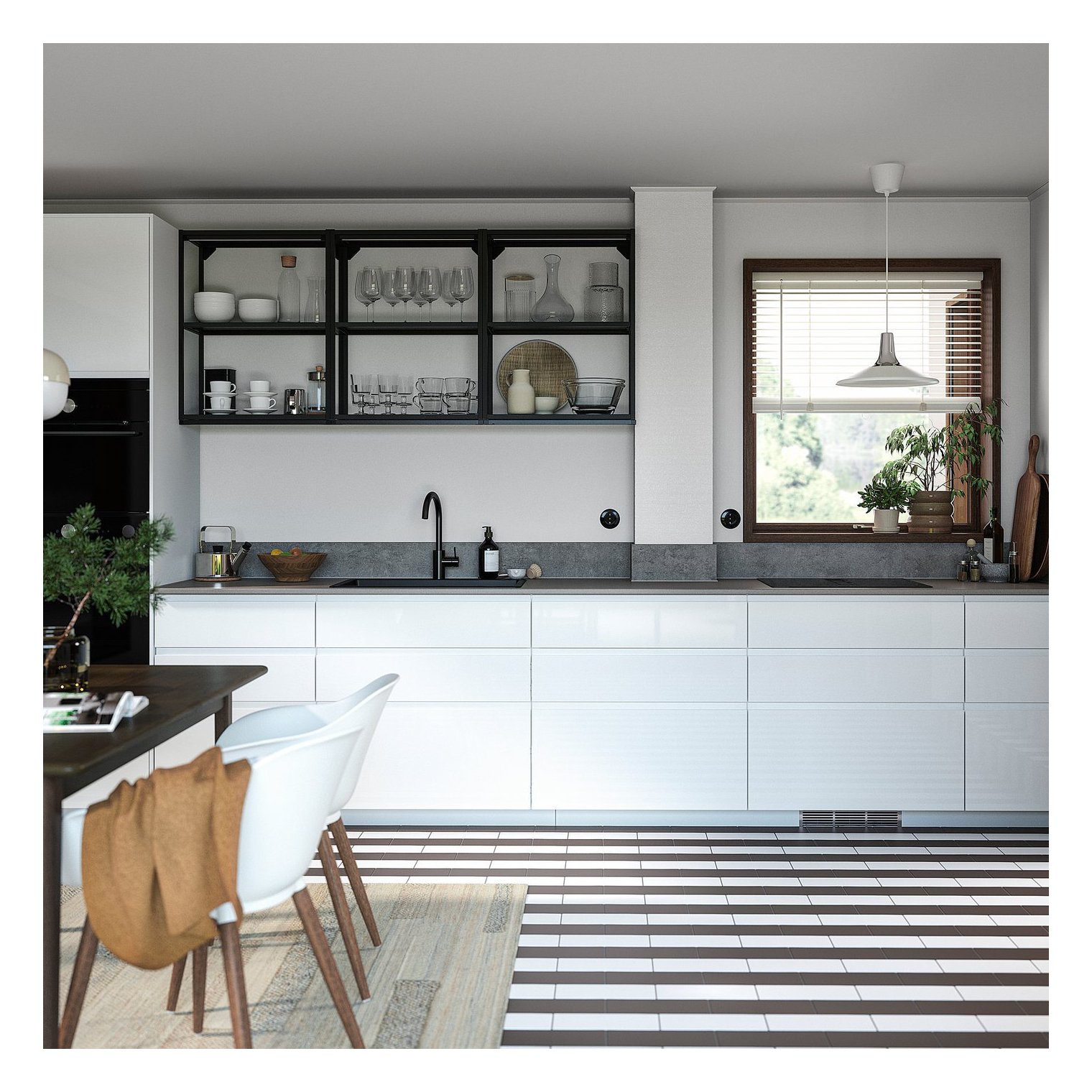 VOXTORP — гладкая, блестящая дверь со встроенными ручками. Они привносят в кухню чистые линии и открытый современный вид.
