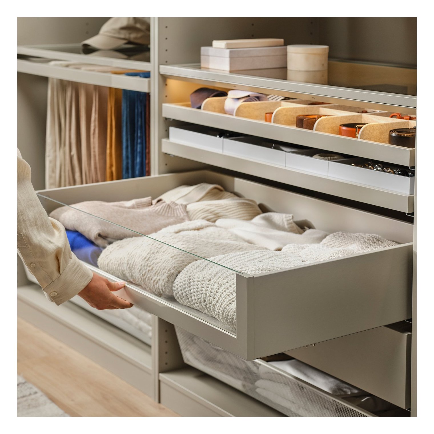 Ящик со стеклянной передней панелью позволяет быстро просмотреть содержимое и дополнительно придает гардеробу легкость.