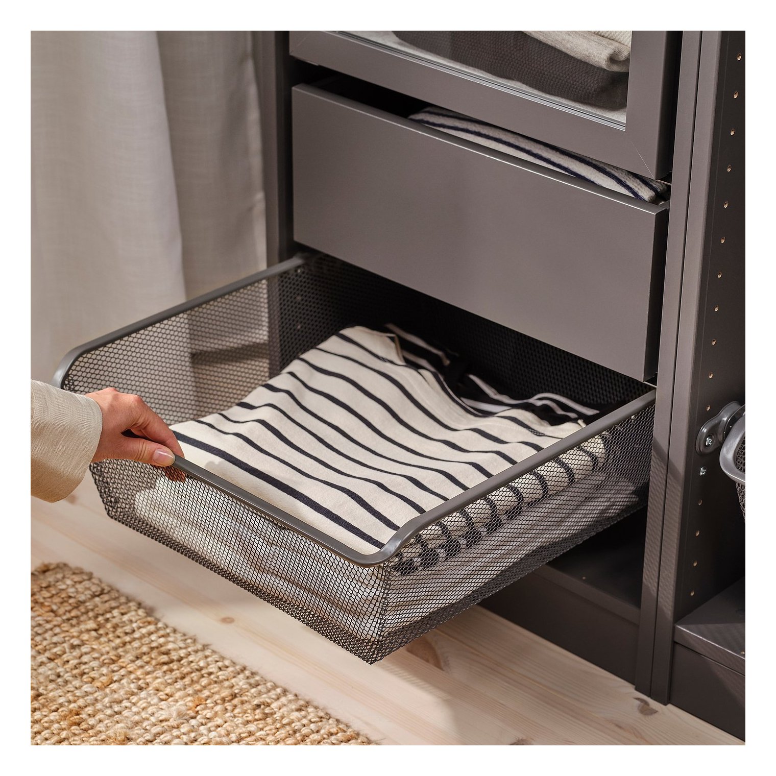 Сетчатая корзина воздухопроницаема и идеально подходит для хранения сложенной одежды, носков или аксессуаров.