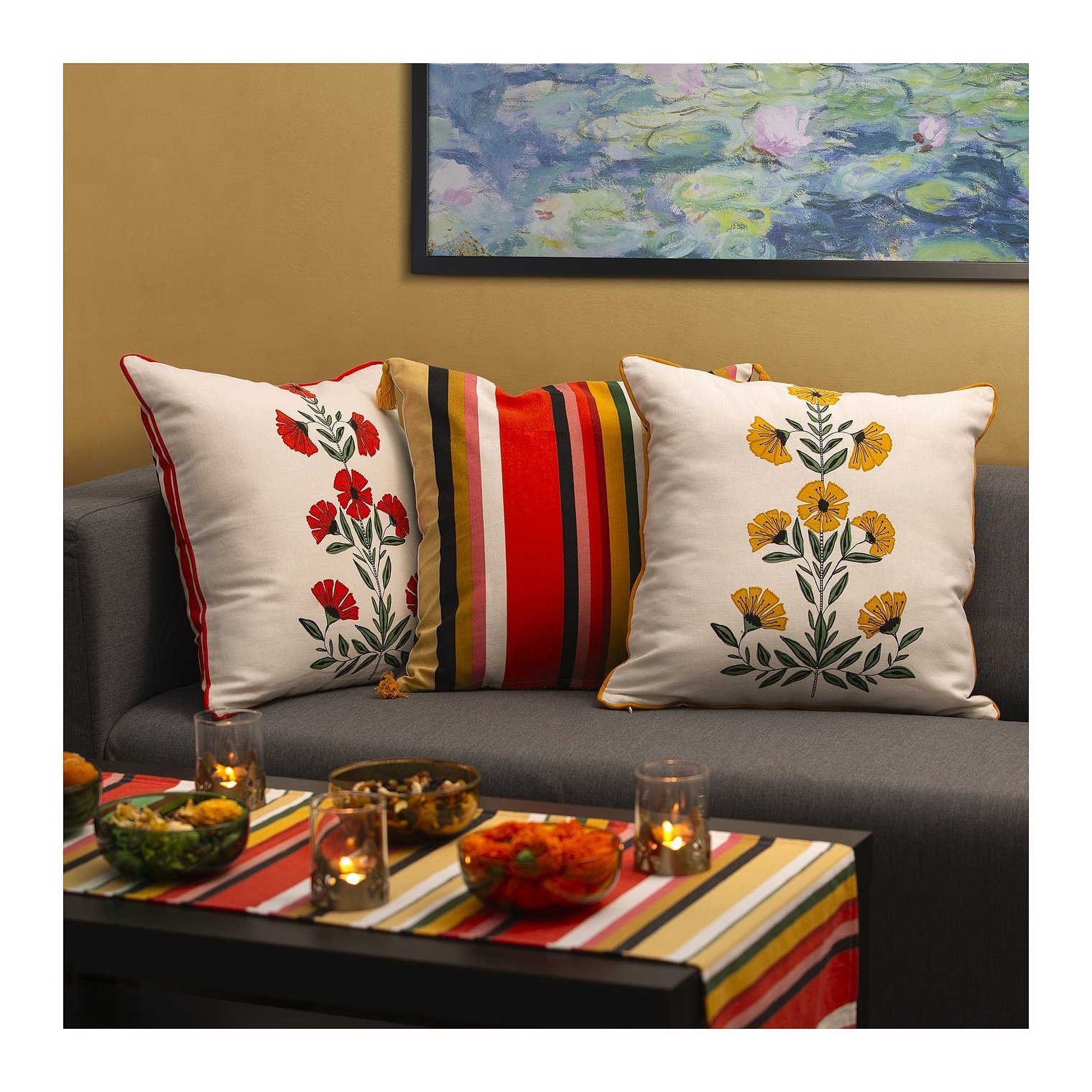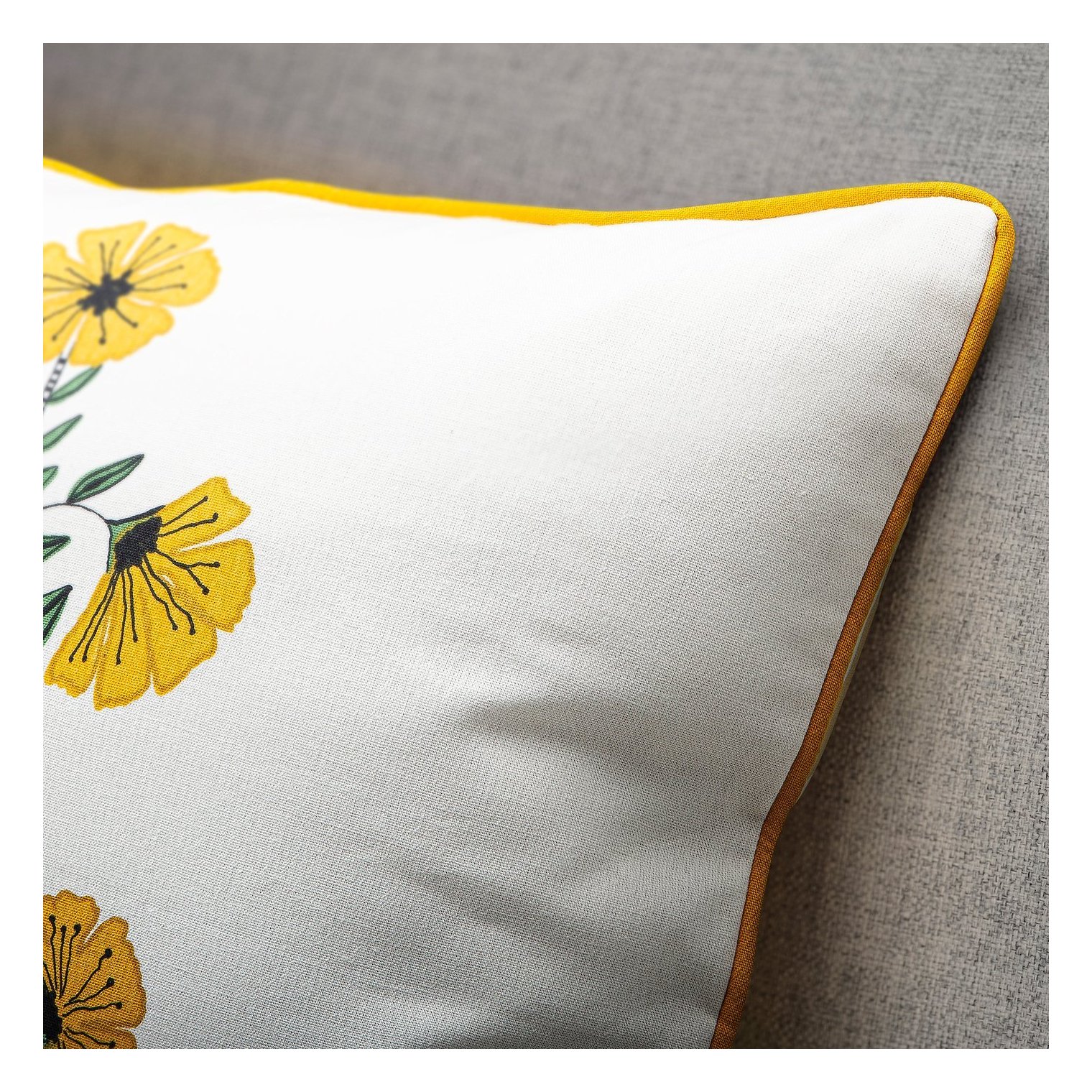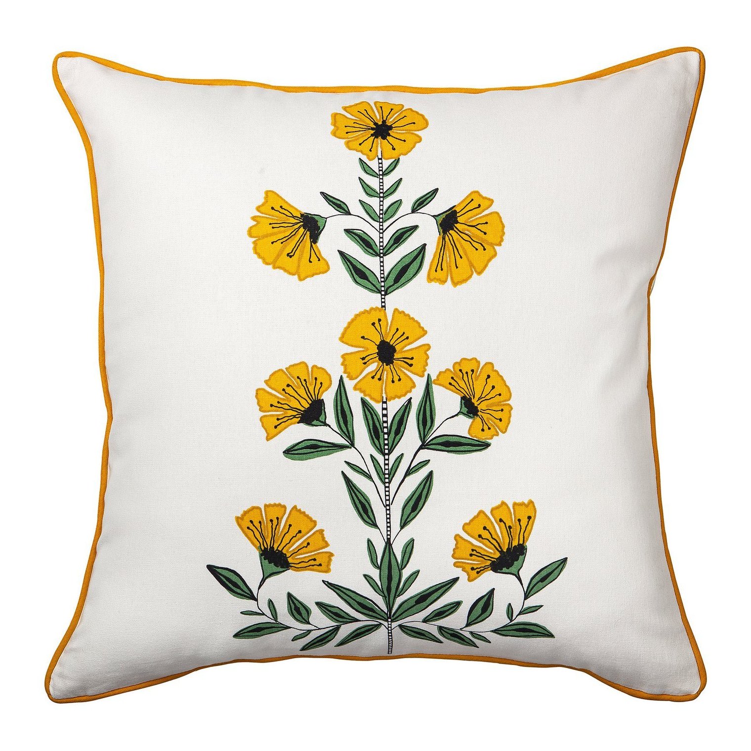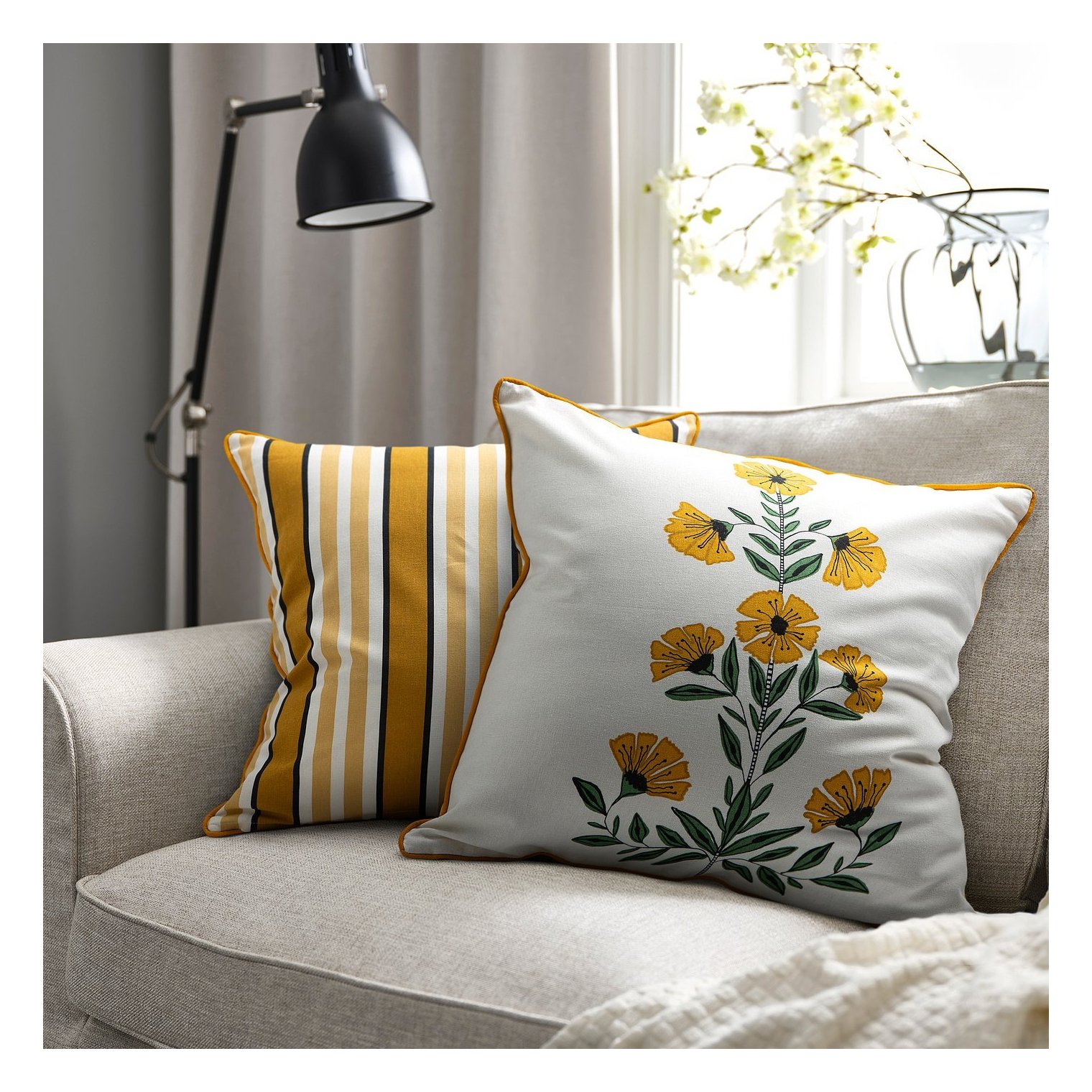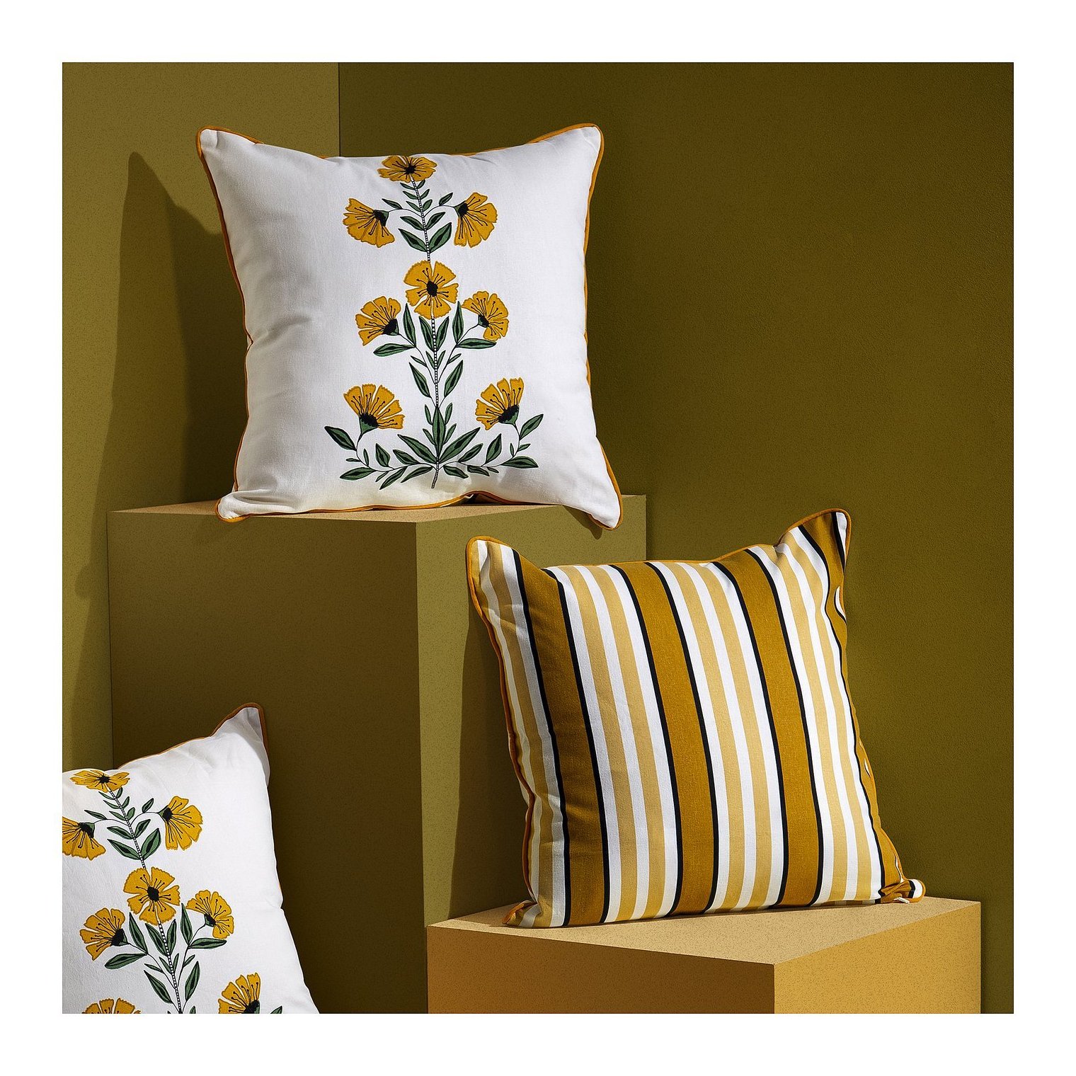 Наволочка украшена двумя разными узорами: одна сторона — с яркими цветами, другая — с вертикальными полосками. Меняйте стороны по настроению.
