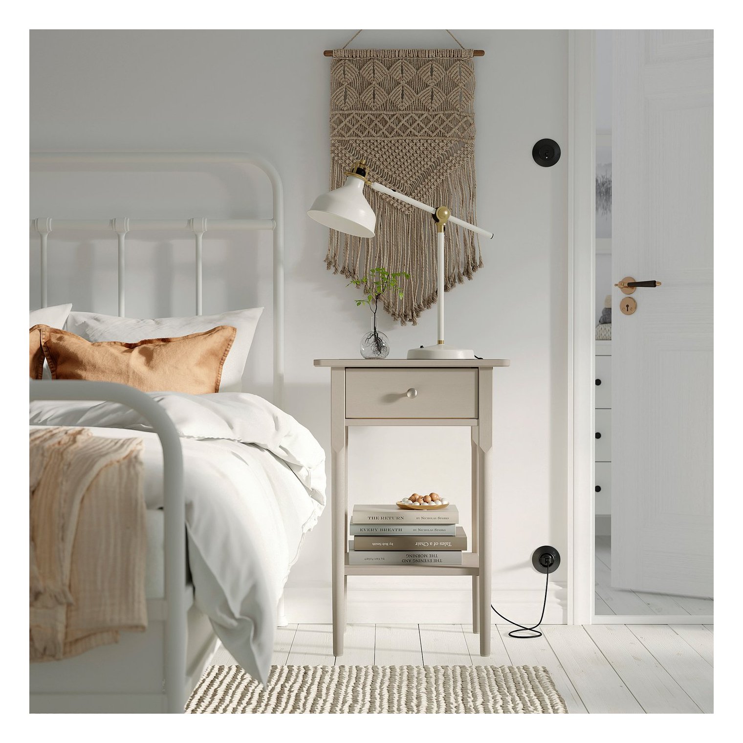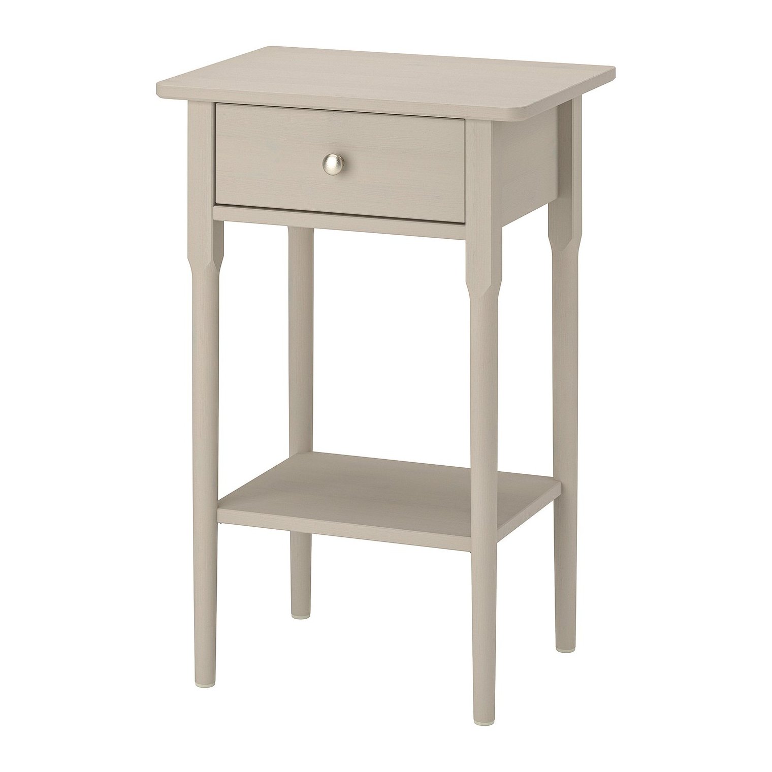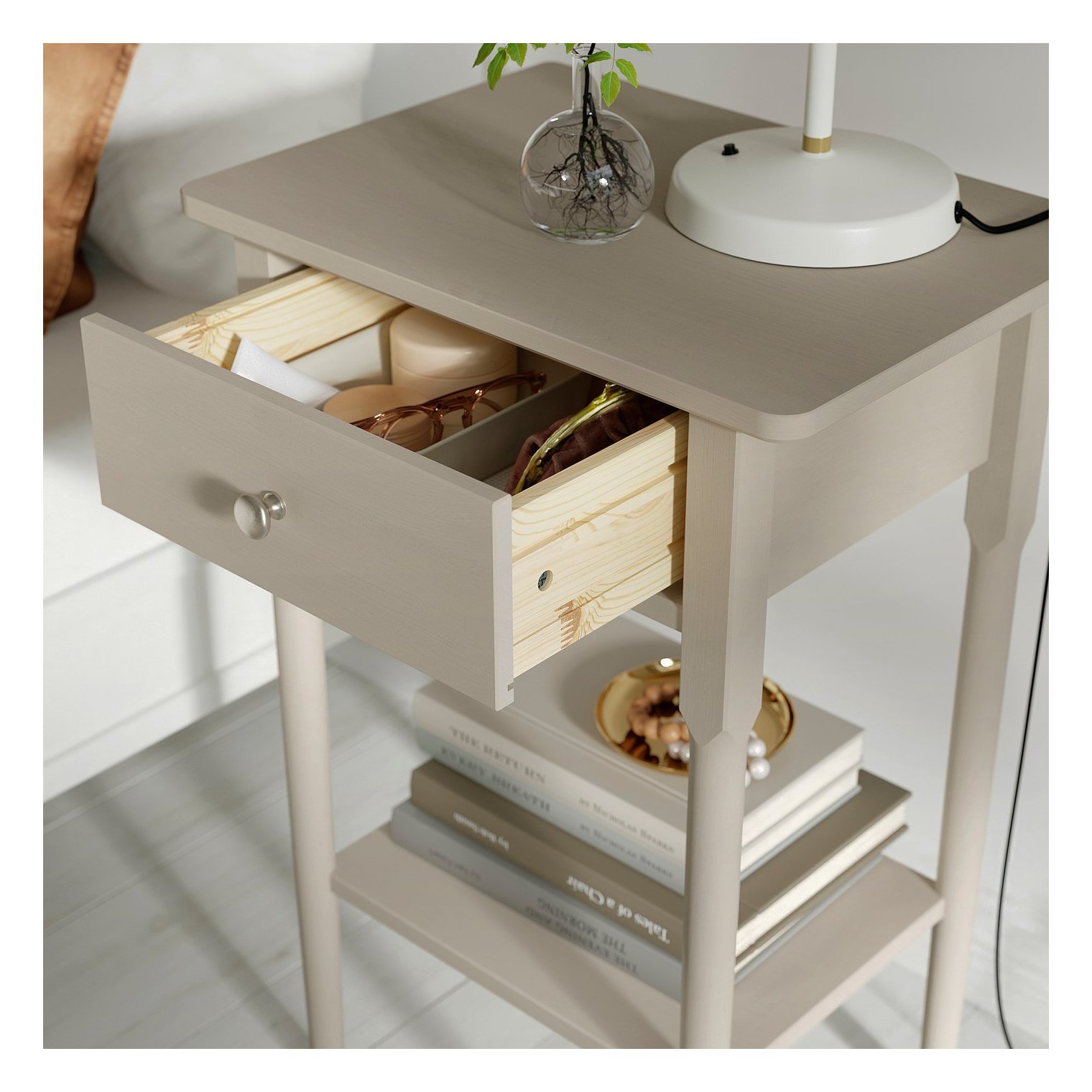 Прикроватная тумбочка с высокими, сужающимися к низу ножками создает ощущение легкости и отлично подходит для высоких кроватей. Кроме того, под ней легче убирать.