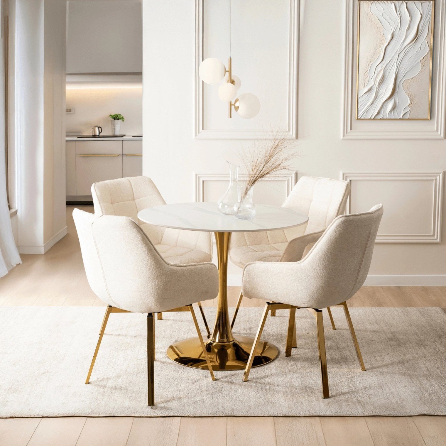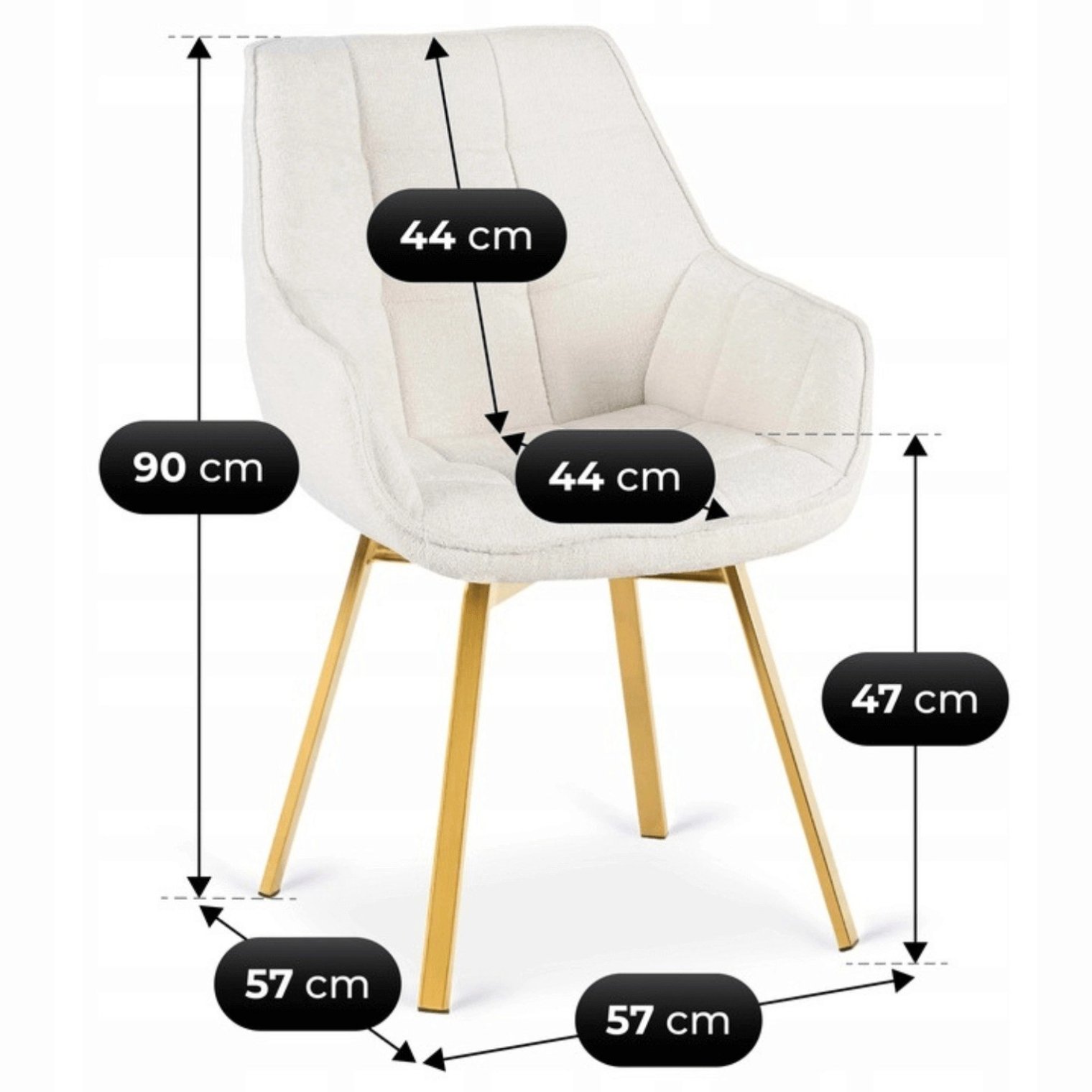 - Золотистые стальные ножки добавляют элегантности, обеспечивая устойчивость и надёжную поддержку, что делает кресло подходящим как для столовых, так и для рабочих столов.