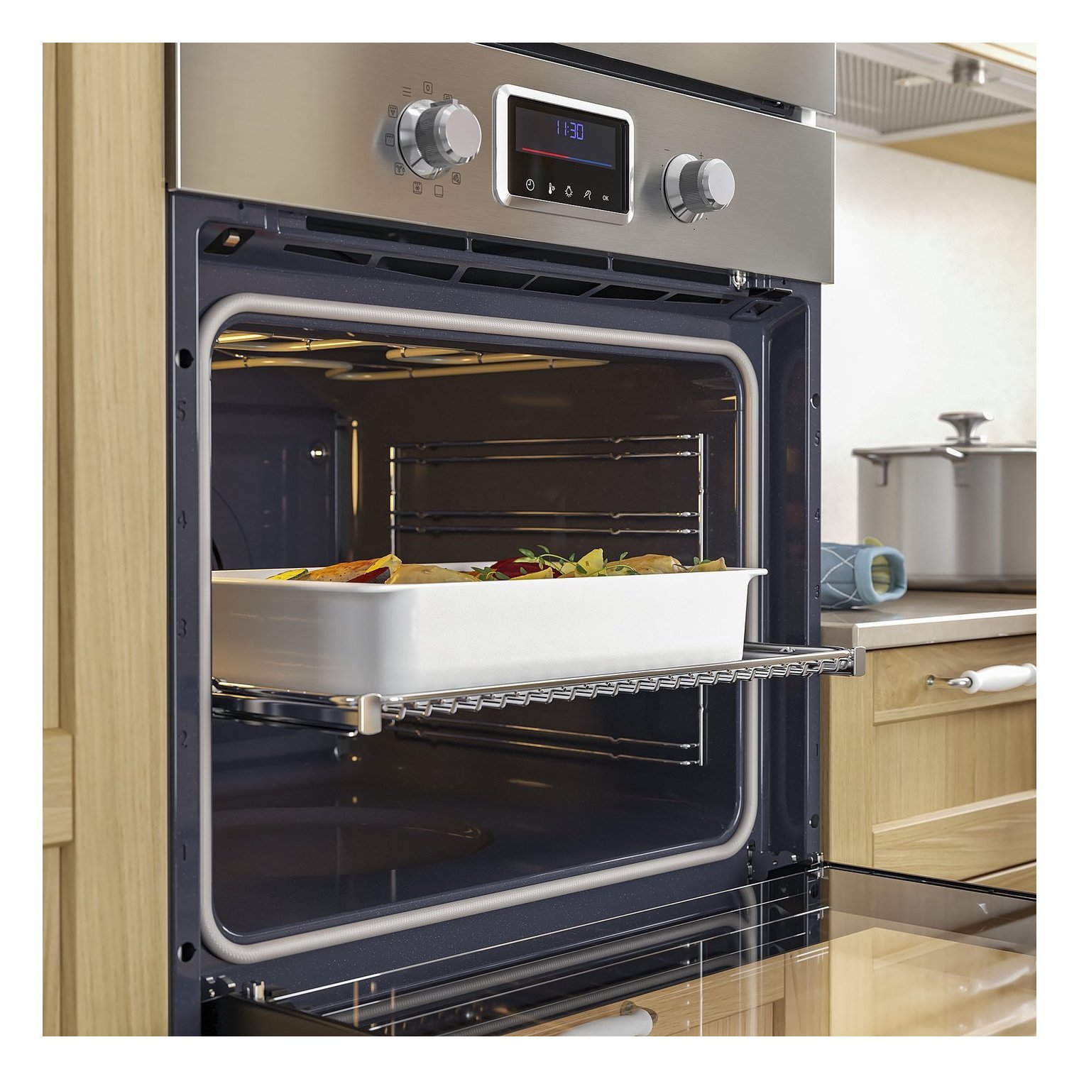 Телескопические направляющие делают загрузку духовки и извлечение горячих блюд проще и безопаснее.