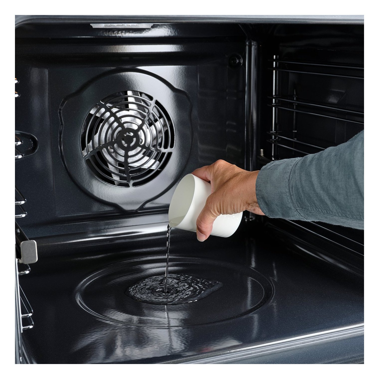 Очистите корпус духовки/микроволновки мягкой тканью, смоченной водой.