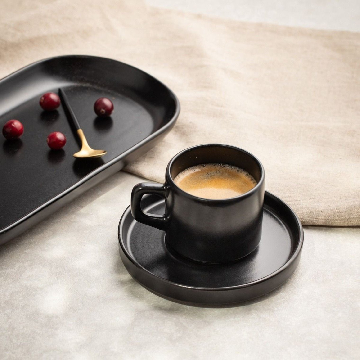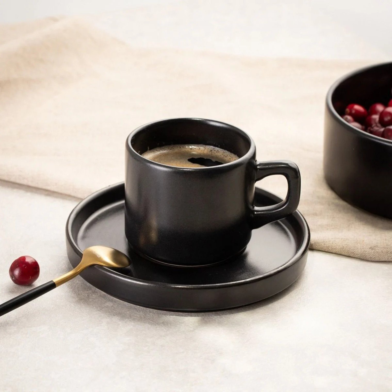 Чашка FAMELIO глубокого черного цвета — это синоним элегантности и современного стиля. Объемом 200 мл, она идеально подходит для подачи вашего любимого кофе или чая, подчеркивая неповторимый характер каждого момента.