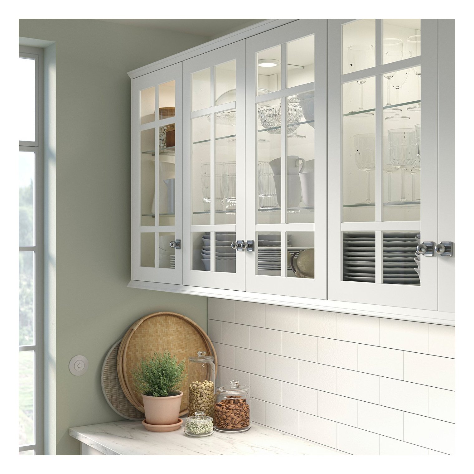 Если вы выбираете стеклянные двери для навесного шкафа, подумайте об использовании стеклянных полок и освещения шкафа. Благодаря этому можно будет продемонстрировать лучший фарфор и придать кухне теплый, уютный характер.