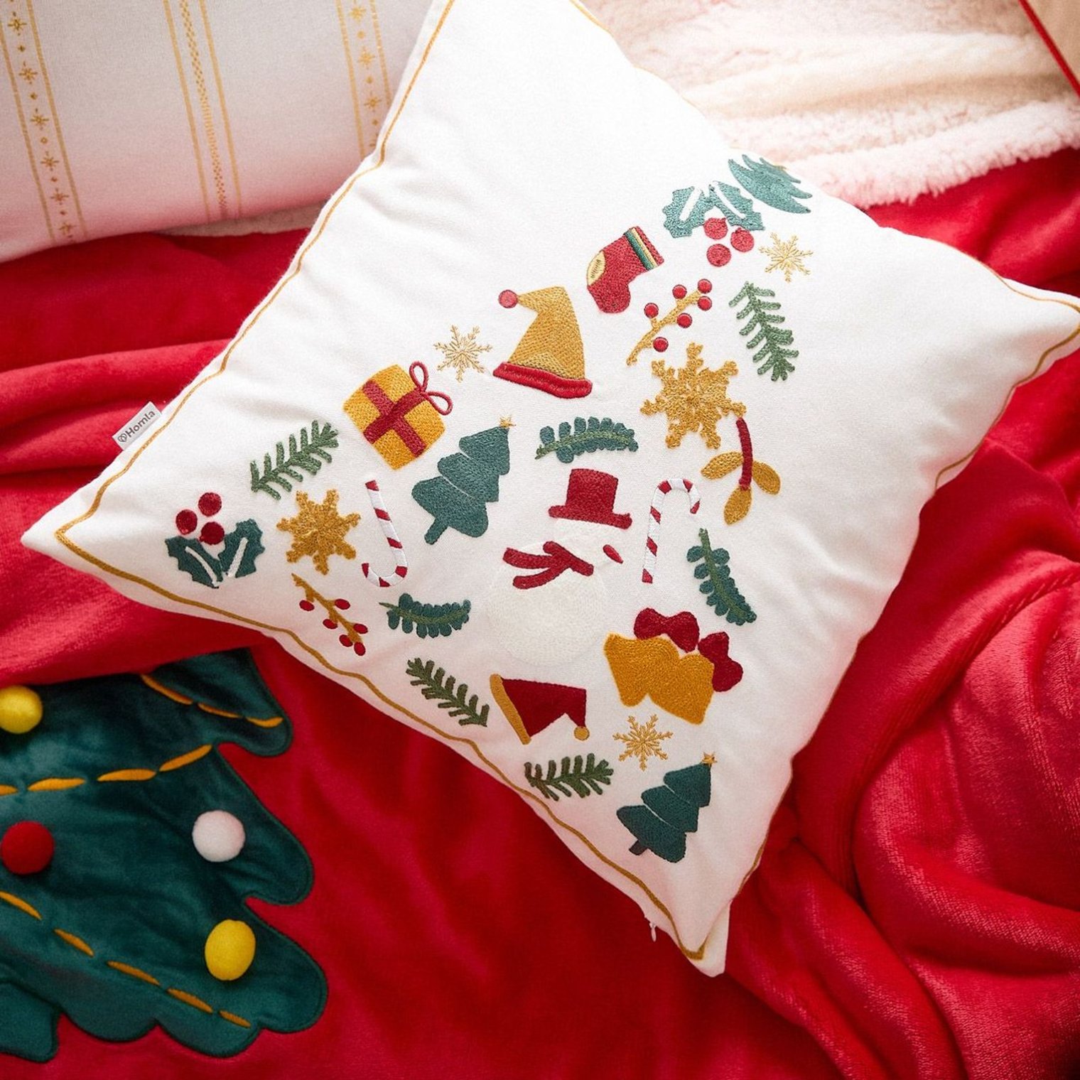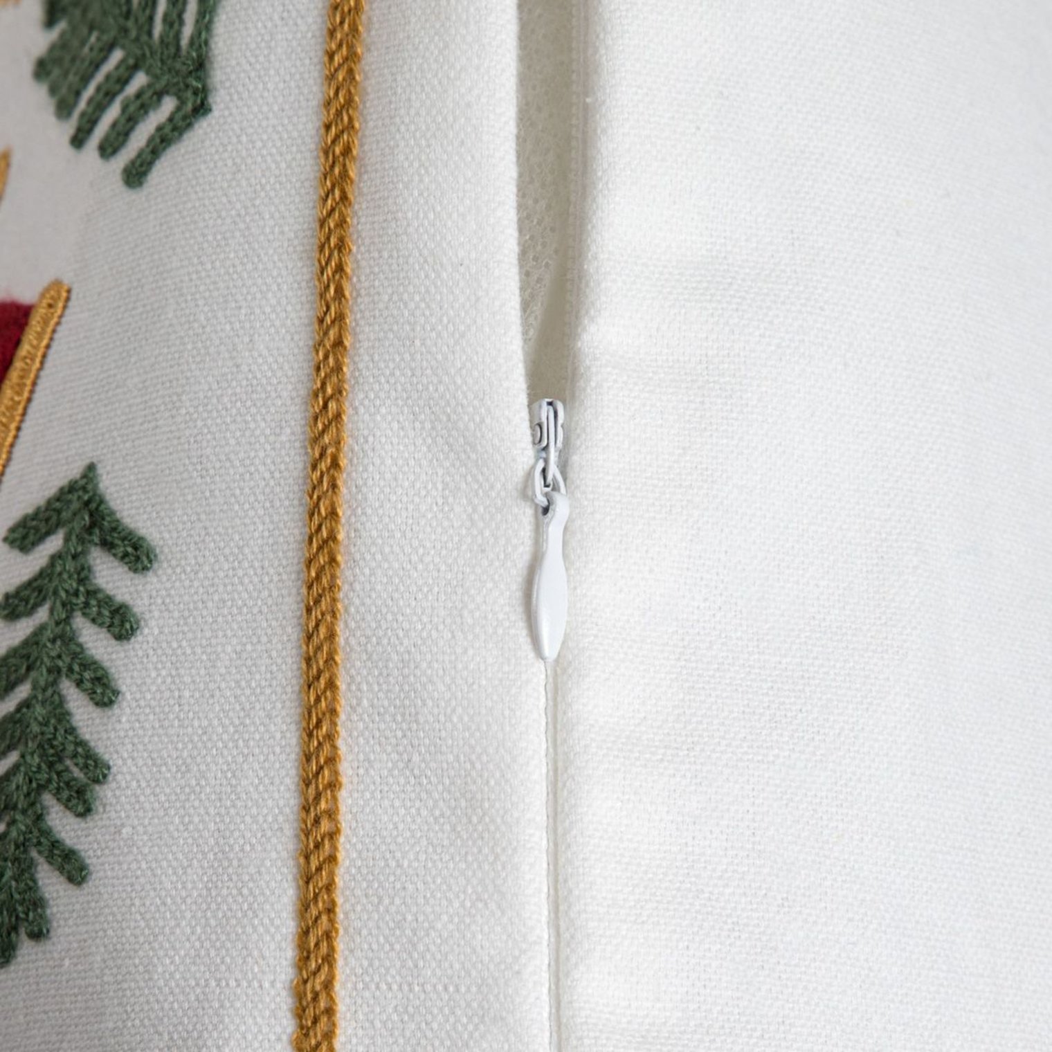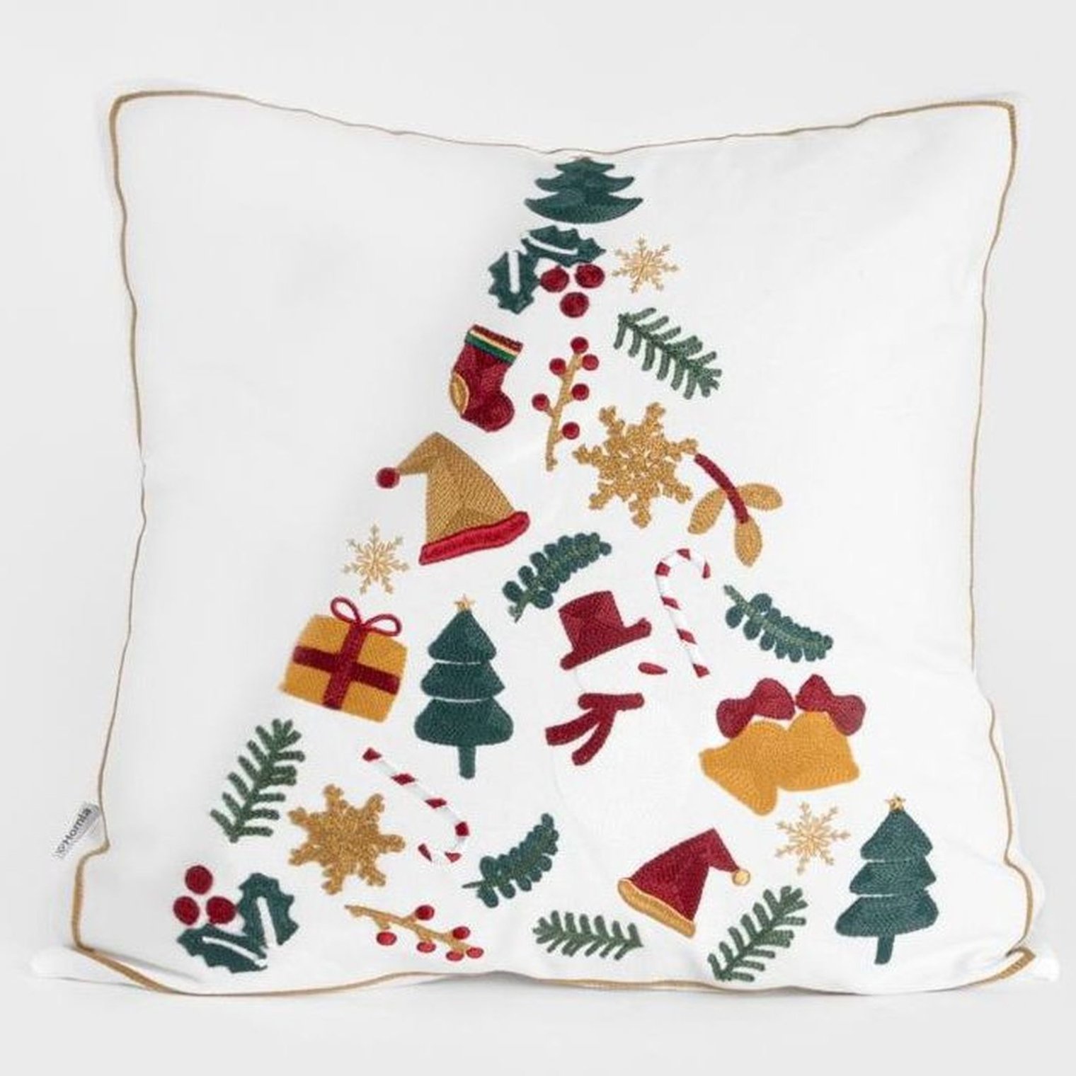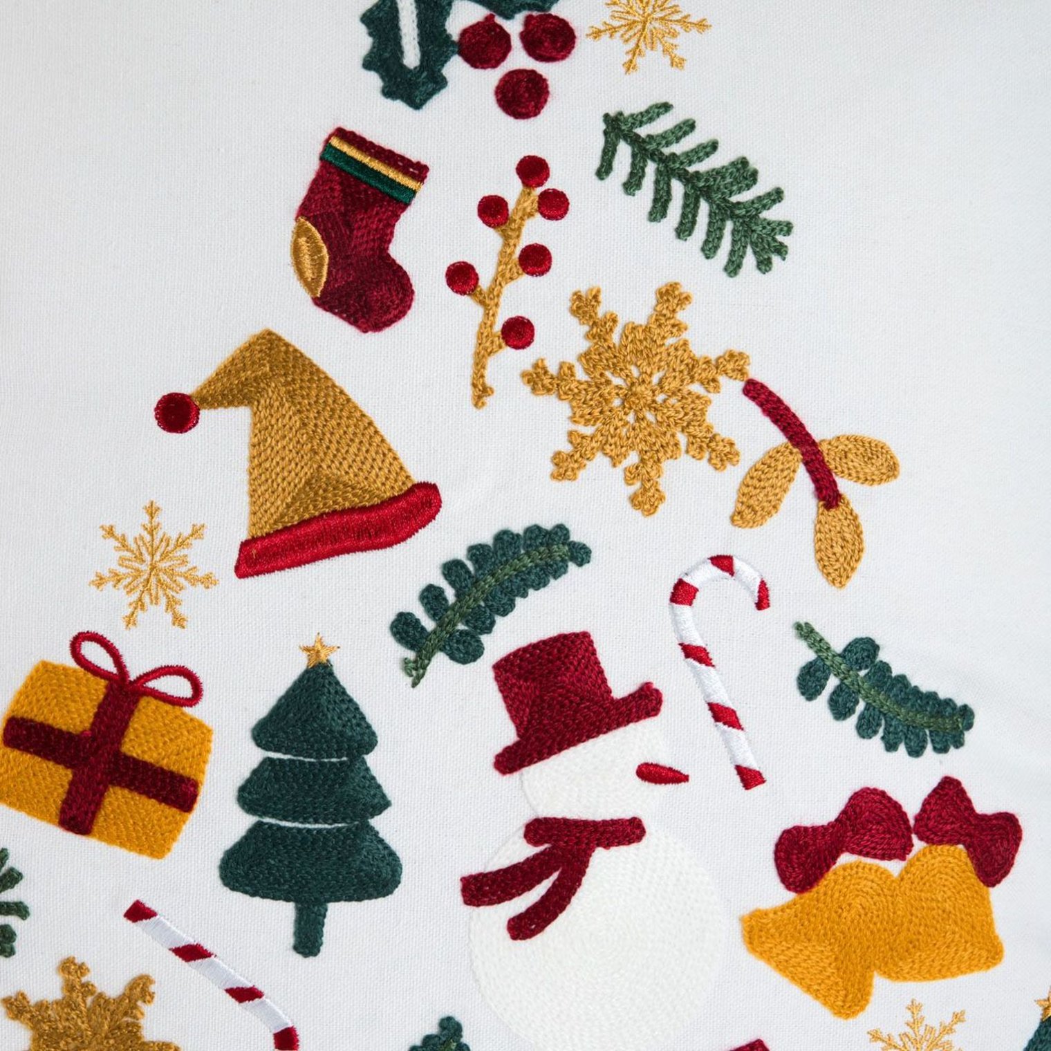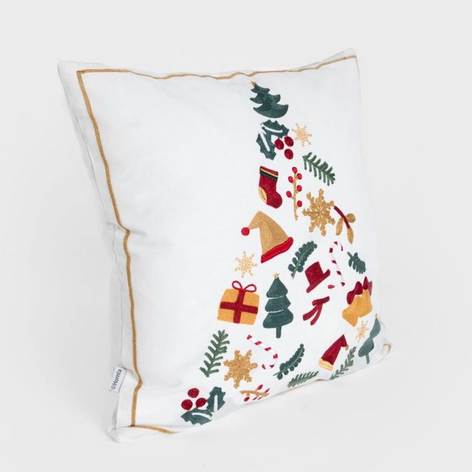 Наволочка ANTRES пробуждает волшебство праздников благодаря богатой вышивке в форме рождественской ёлки. Символичные украшения – от подарков до ёлочных шаров и звёзд – создают уникальный узор, который наполняет любой интерьер атмосферой тепла и радости. Белая наволочка с изящной золотой отделкой идеально дополнит рождественский декор, сочетая традиции с элегантностью.