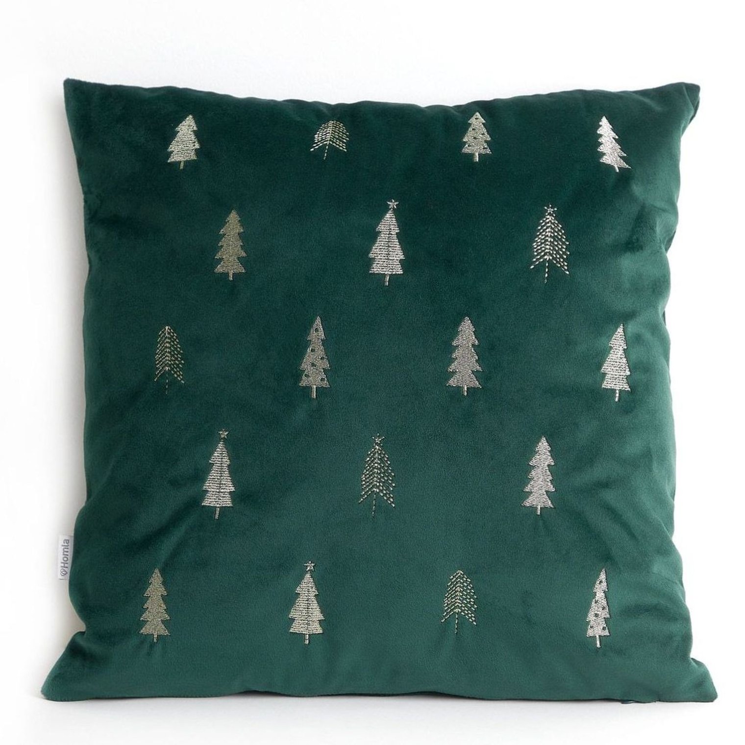Наволочка ARBA выполнена из ткани приглушённого тёмно-зелёного цвета – она прекрасно сочетается как с более яркими цветами (например, горчичным), так и с белым и серым. Наволочка украшена вышитыми золотыми нитями простыми рождественскими ёлками. Наволочка квадратная, размером 45 х 45 см.