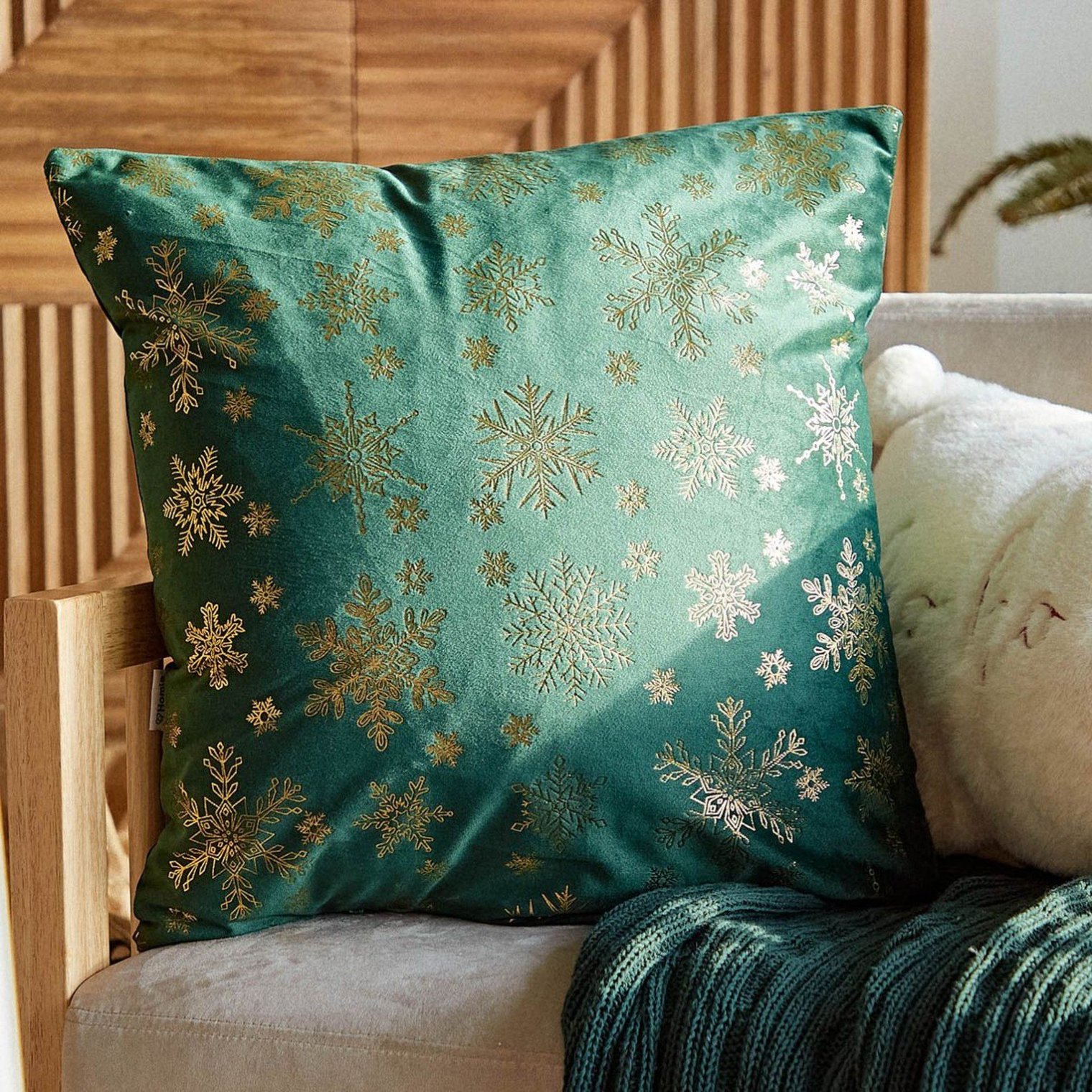 Наволочка TANESI понравится не только любителям рождественских акцентов, но и тем, кто ценит элегантные аксессуары. Глубокий зеленый цвет бархатной ткани сочетается с королевским золотом декоративного узора из снежинок разных форм и размеров. Наволочка квадратной формы, размером 45 см каждая.