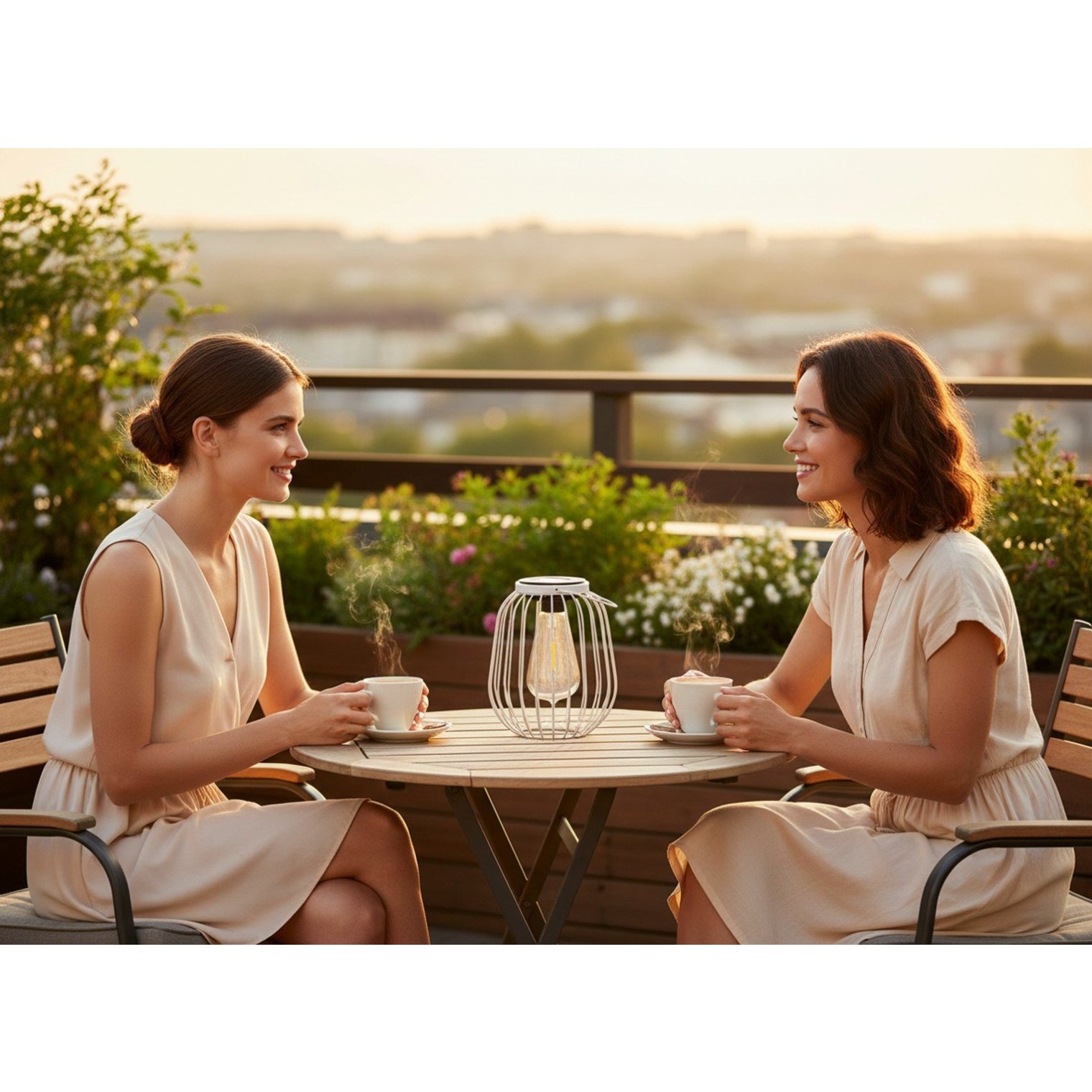 Работает от солнечной панели, которая заряжается в течение дня, чтобы вечером засиять нежным светом. Белый металл красиво сочетается с зеленью и натуральным деревом.