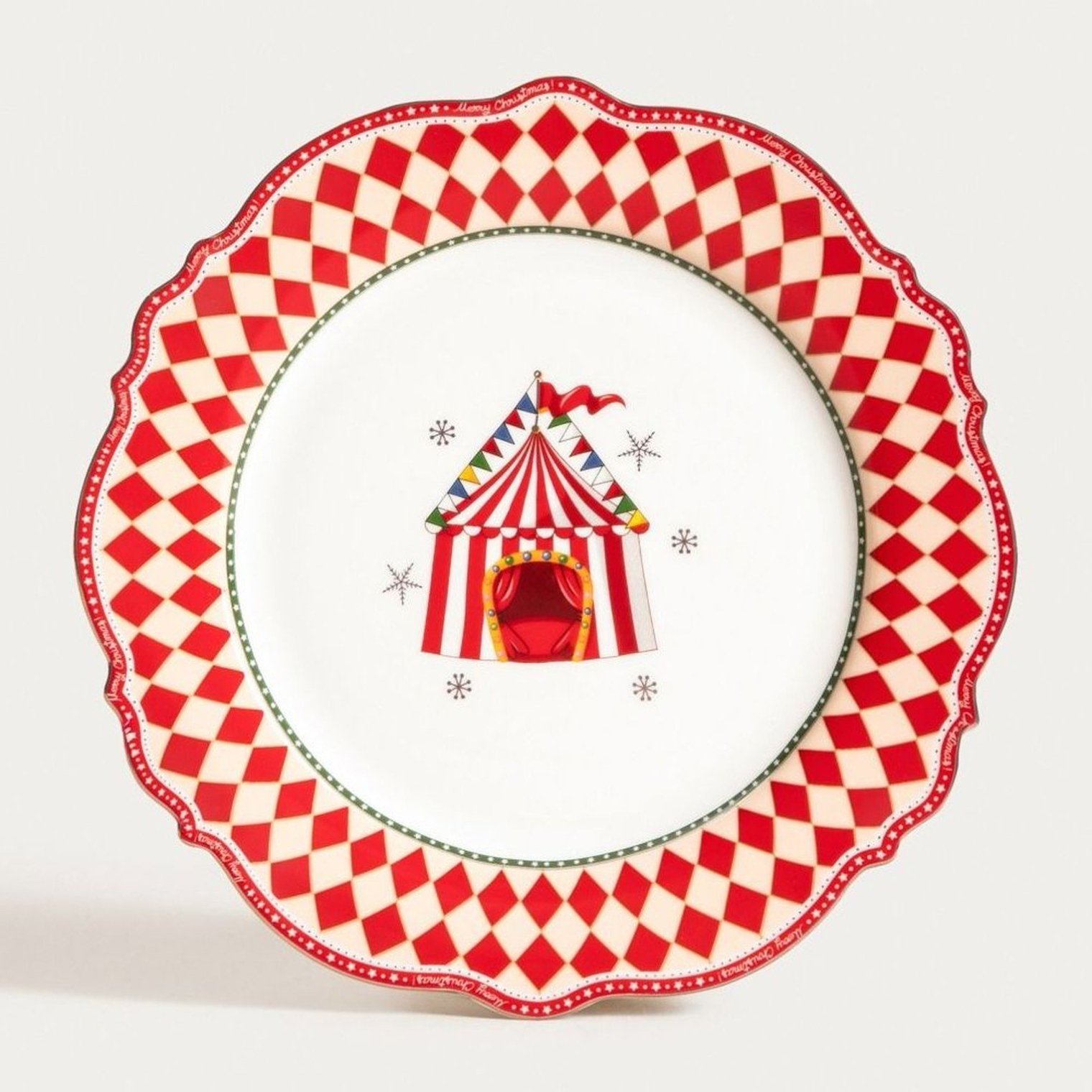 Эта декоративная фарфоровая тарелка станет прекрасным дополнением к вашей сервировке. Тарелка украшена оригинальным изображением циркового шатра и красно-белой клетчатой каймой. Она идеально подходит для подачи праздничных блюд. Она добавит красочности и праздничного настроения вашему рождественскому столу.