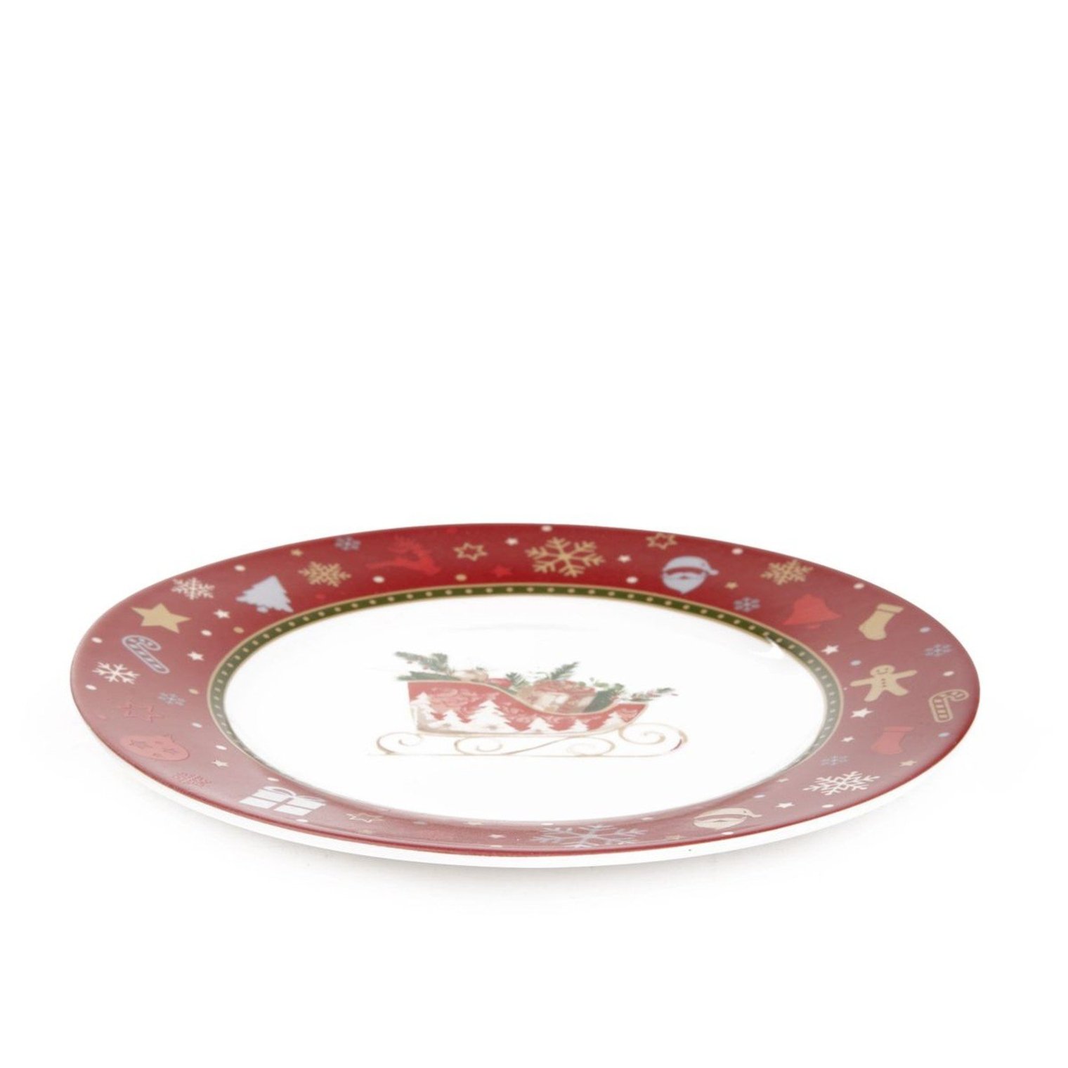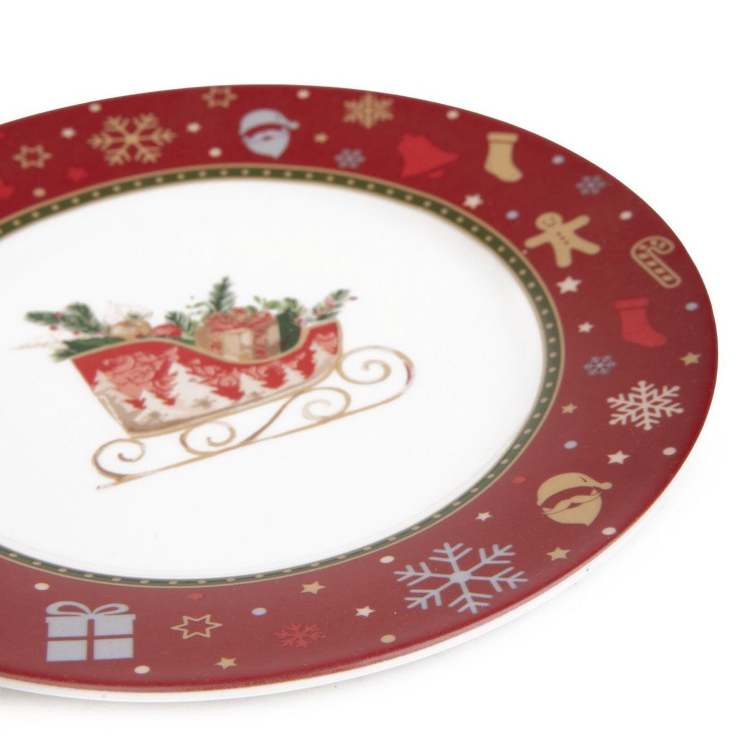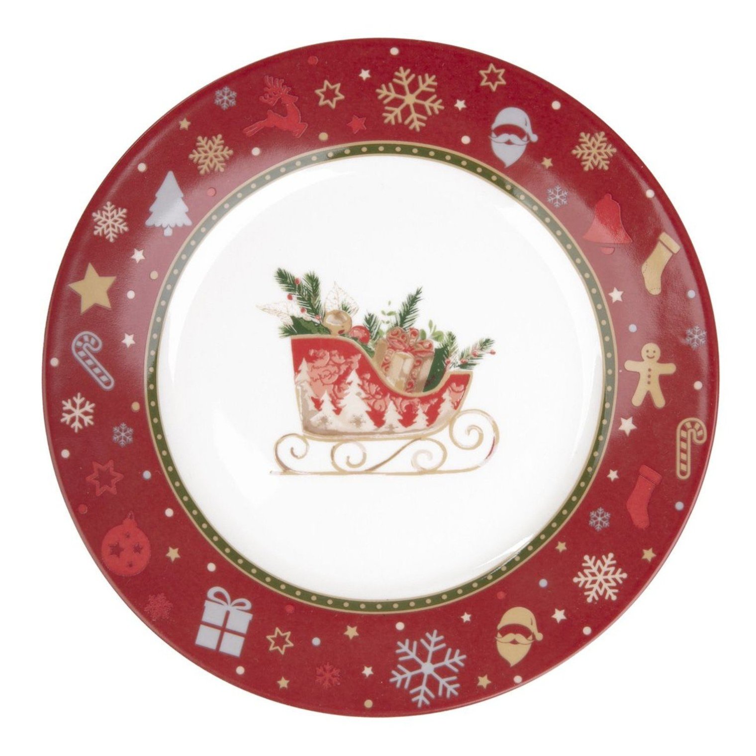 Эта тарелка KALVEN изготовлена из фарфора с красивой глянцевой отделкой. Она украшена рождественским мотивом. Красный ободок тарелки украшен изображениями рождественской елки, Санта-Клауса, оленей, снежинок, подарков, чулок и леденцов. В центре тарелки на белом фоне изображены сани с подарками. Диаметр тарелки 19 см.