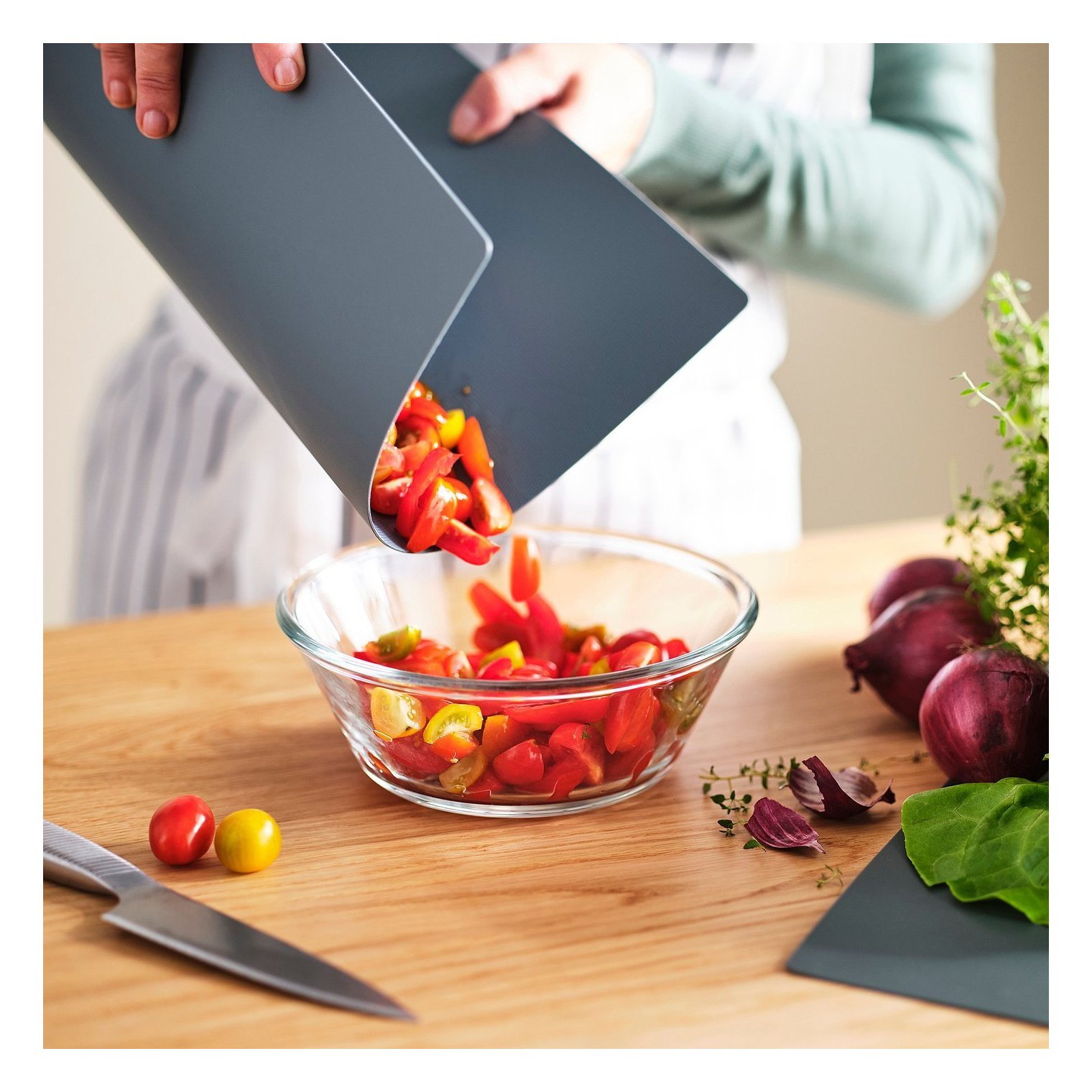 Доска гибкая, что облегчает перемещение нарезанных продуктов, предотвращая их рассыпание.