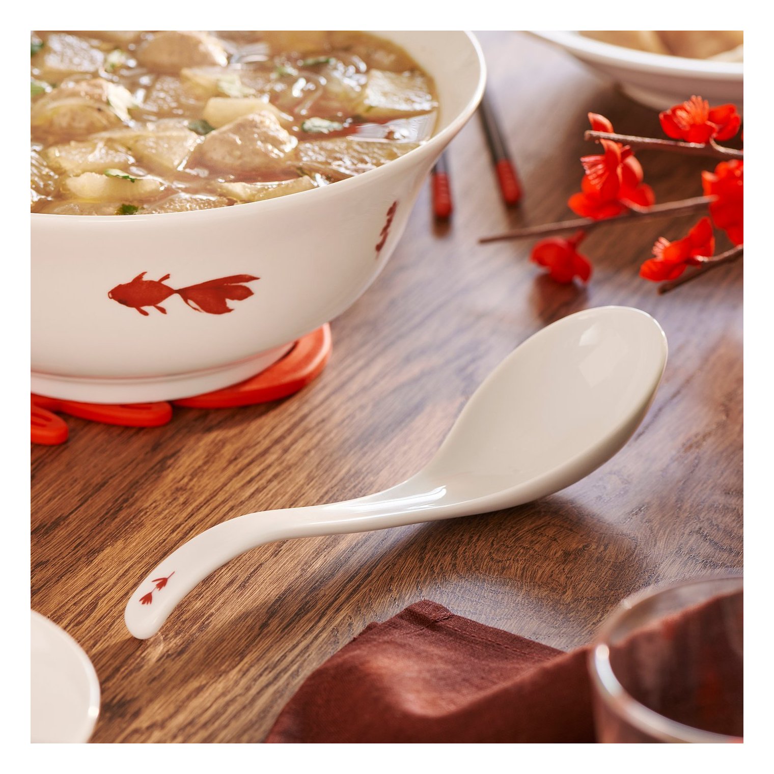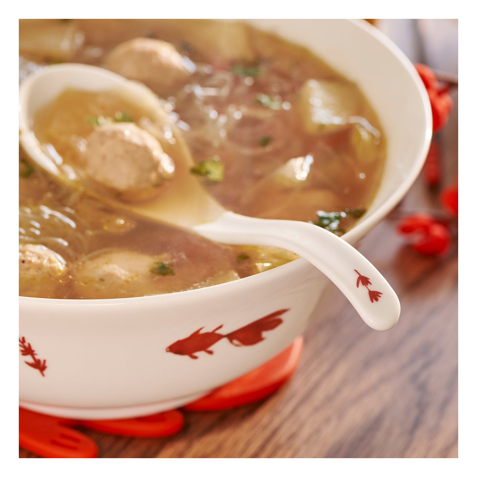 Слегка изогнутая ручка позволяет ложке удобно лежать в руке и оставаться на месте, когда ее кладут на тарелку, пока вы ждете следующую порцию супа.