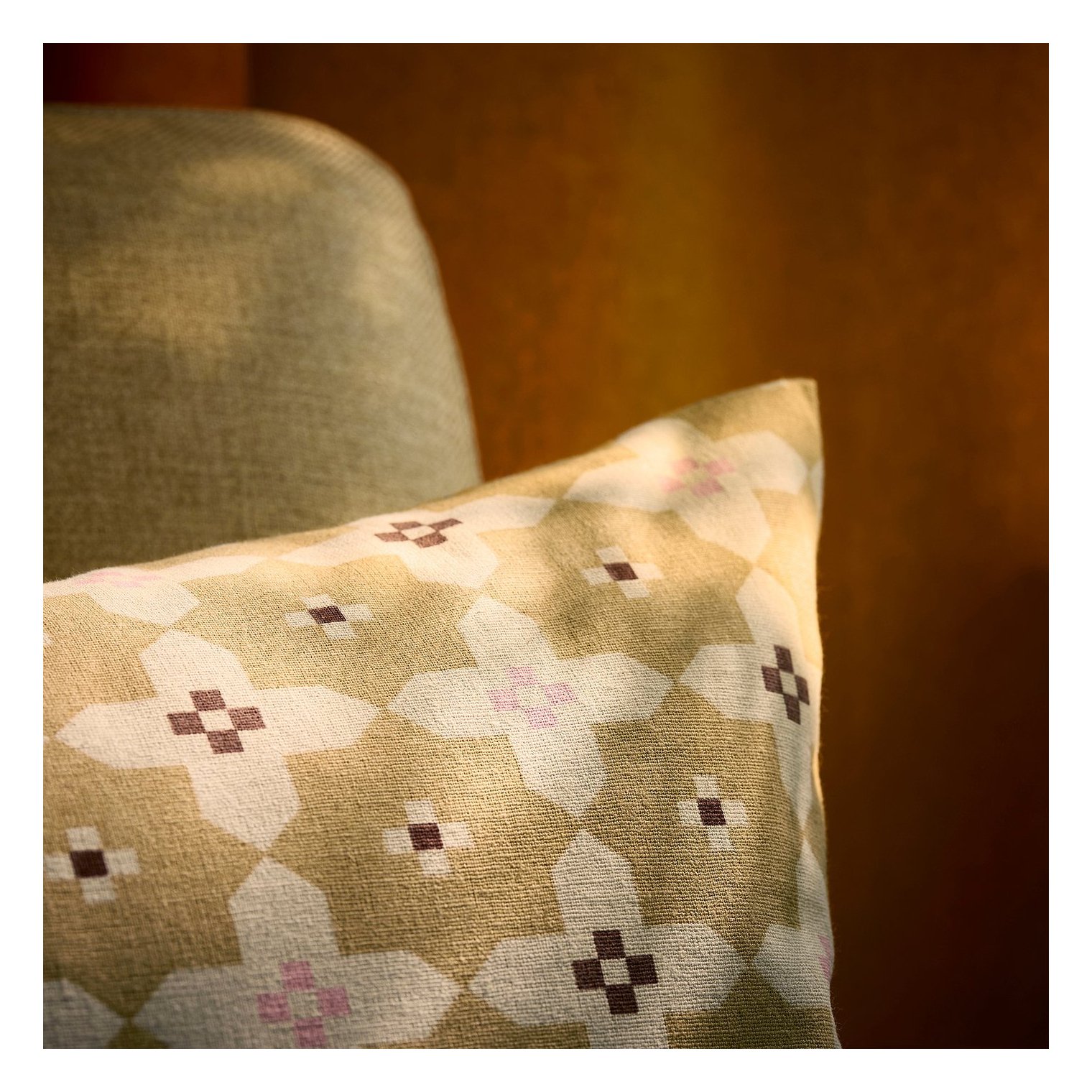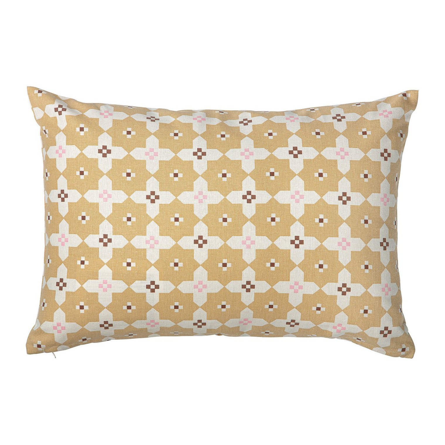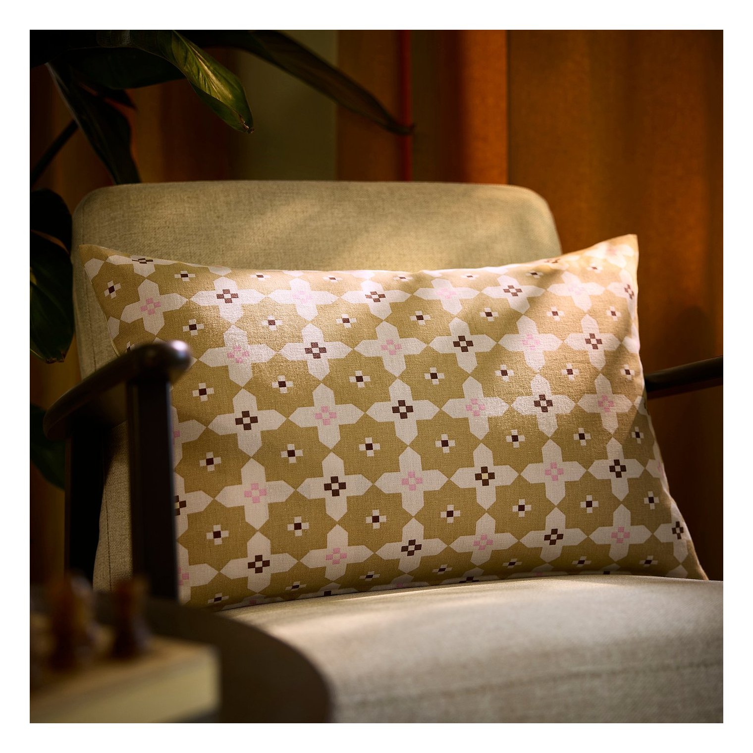 Набивной геометрический узор в ярких цветах напоминает мозаику и придает наволочке современный, свежий вид.