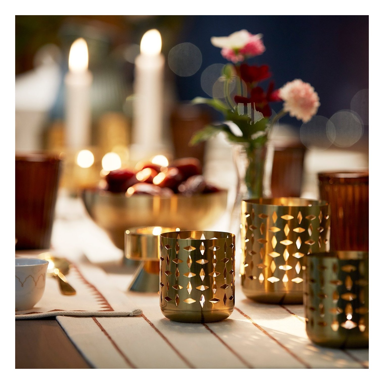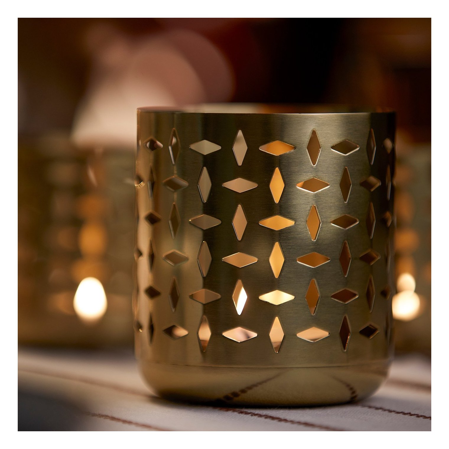 Свет от чайной свечи проникает сквозь отверстия в подсвечнике, создавая удивительные тени на стенах комнаты.