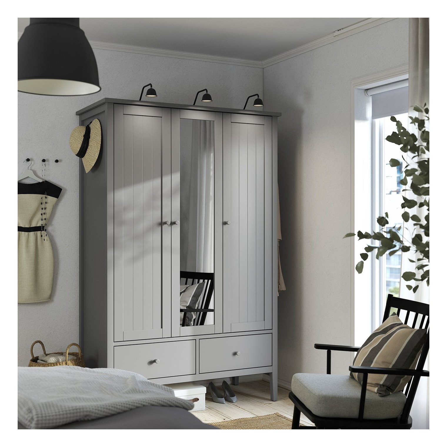Отдельно стоящий трехдверный шкаф с зеркалом в полный рост. Традиционный дизайн с красивыми деталями и практичными функциями.