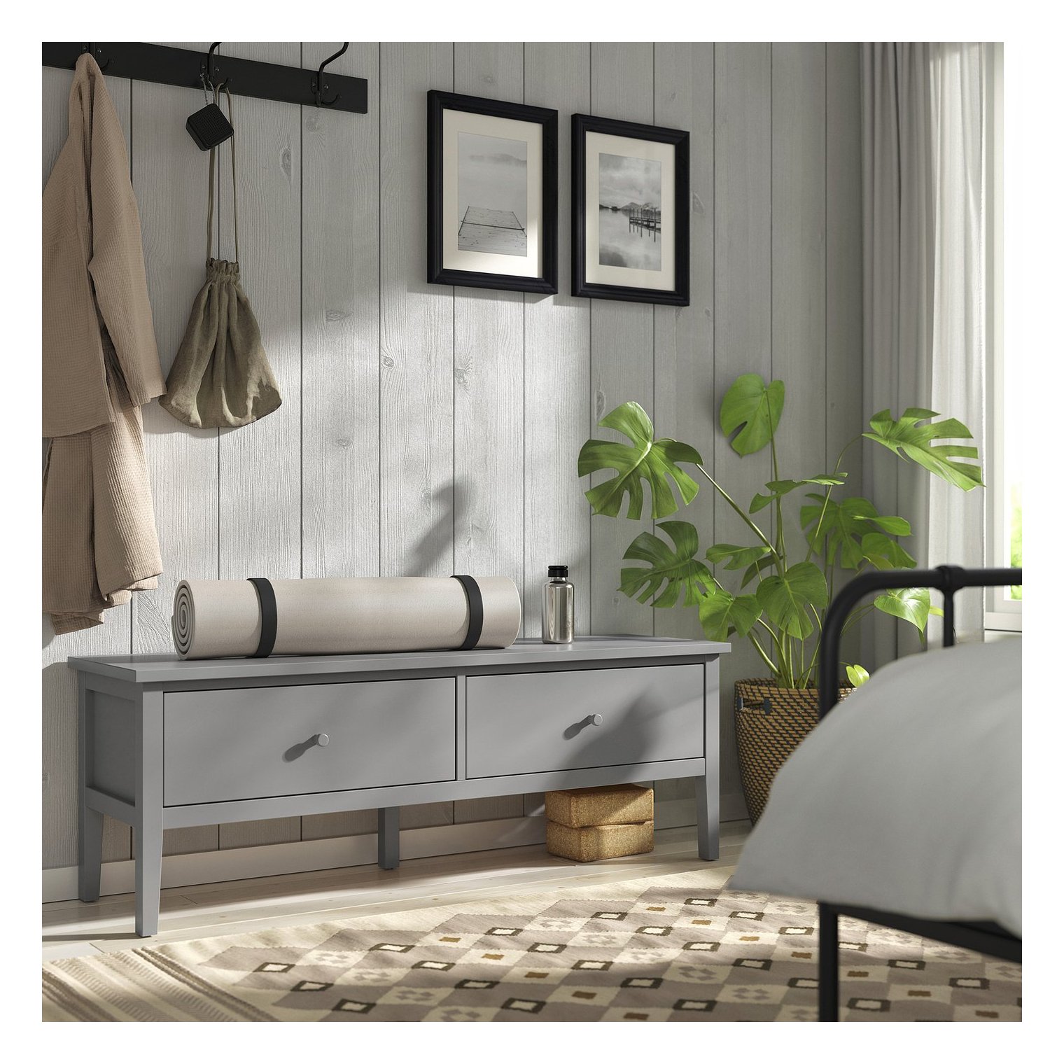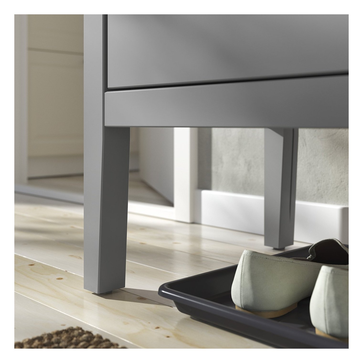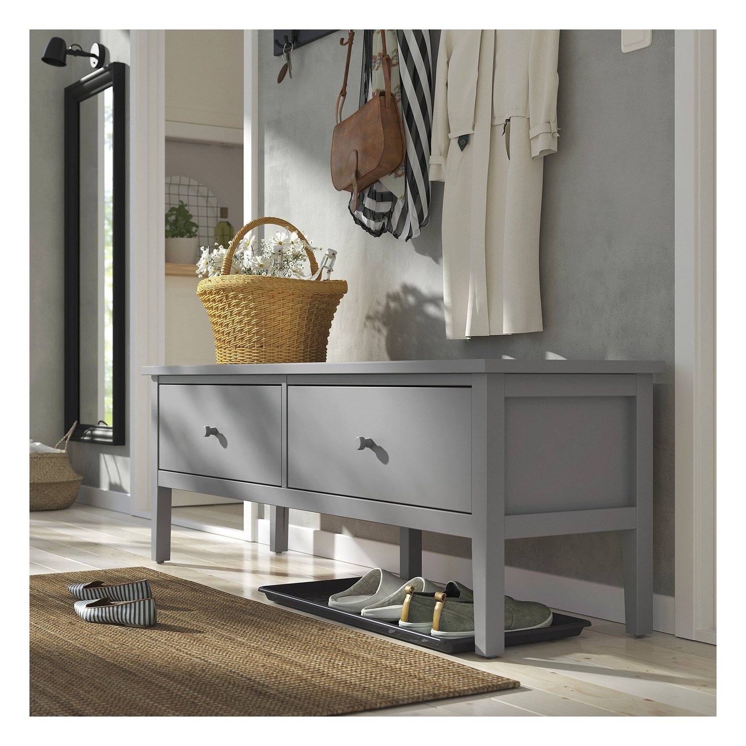 При одевании или надевании обуви можно присесть. Пространство под скамейкой можно использовать для дополнительного хранения вещей.