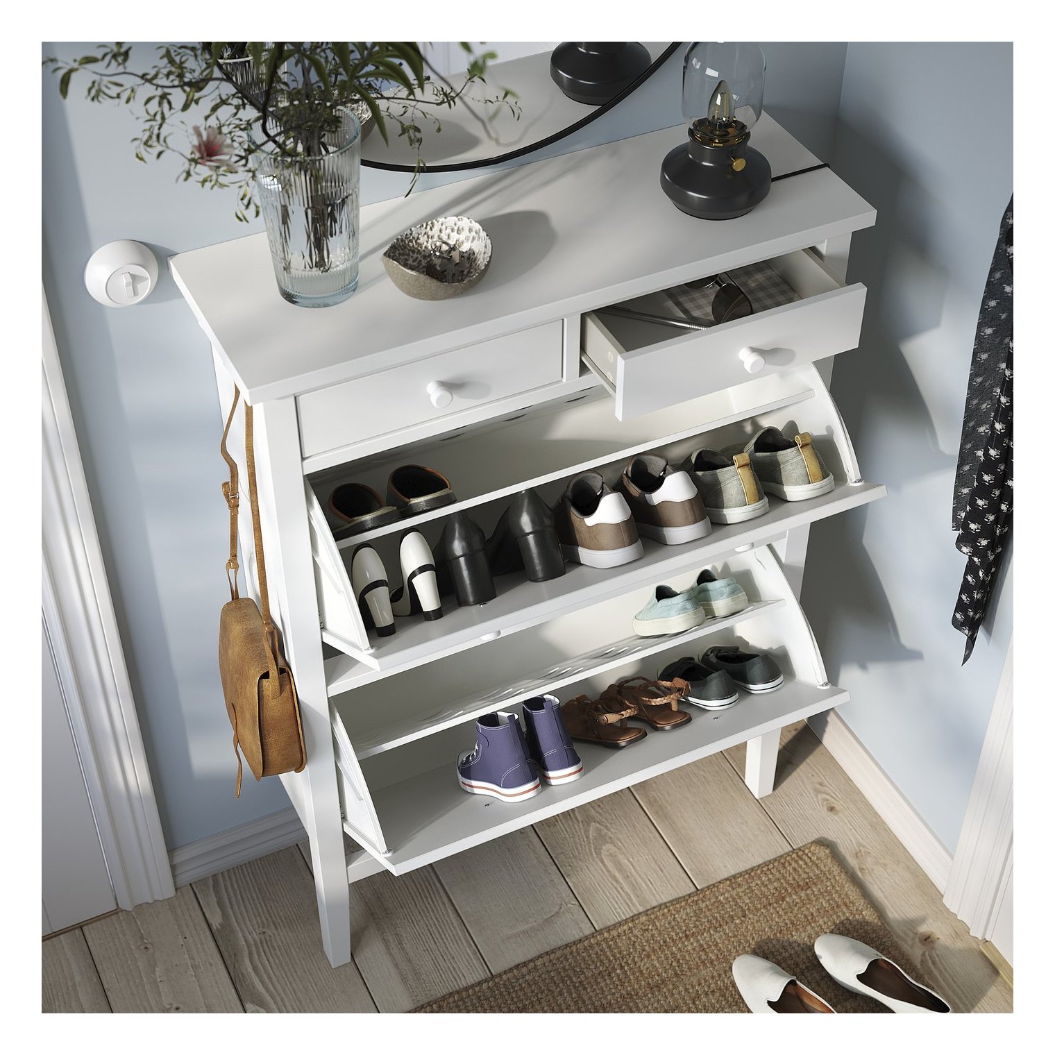 В двух выдвижных ящиках можно хранить важные вещи, которые вы не хотите искать, например, зарядные устройства, письма или ключи.
