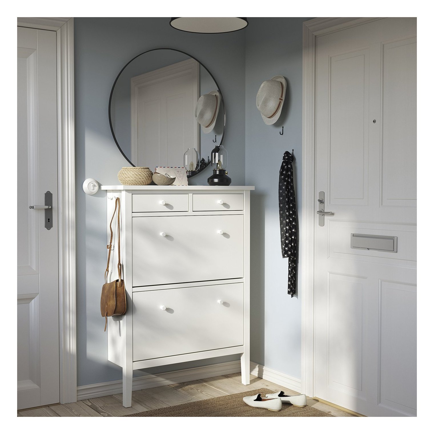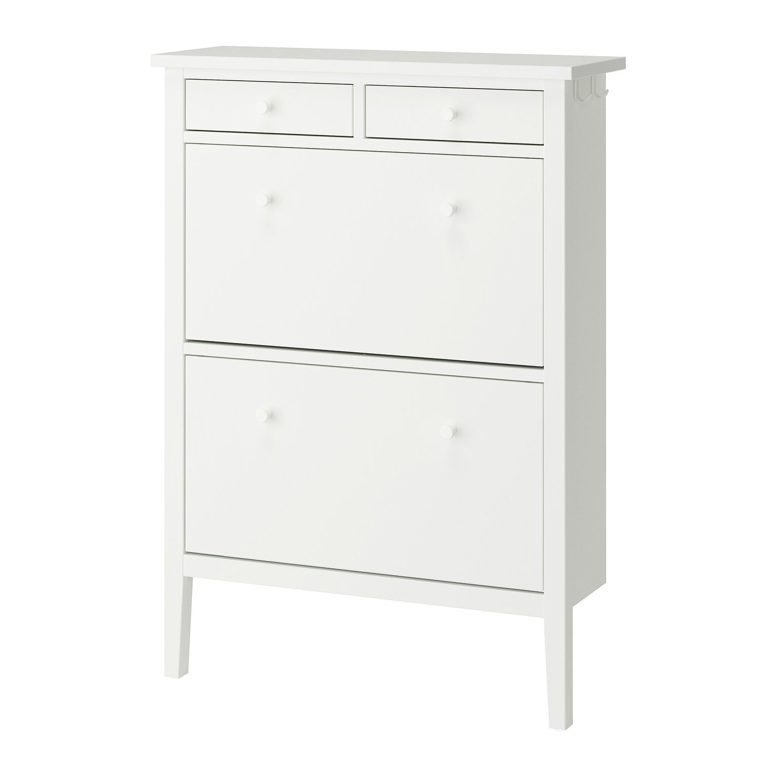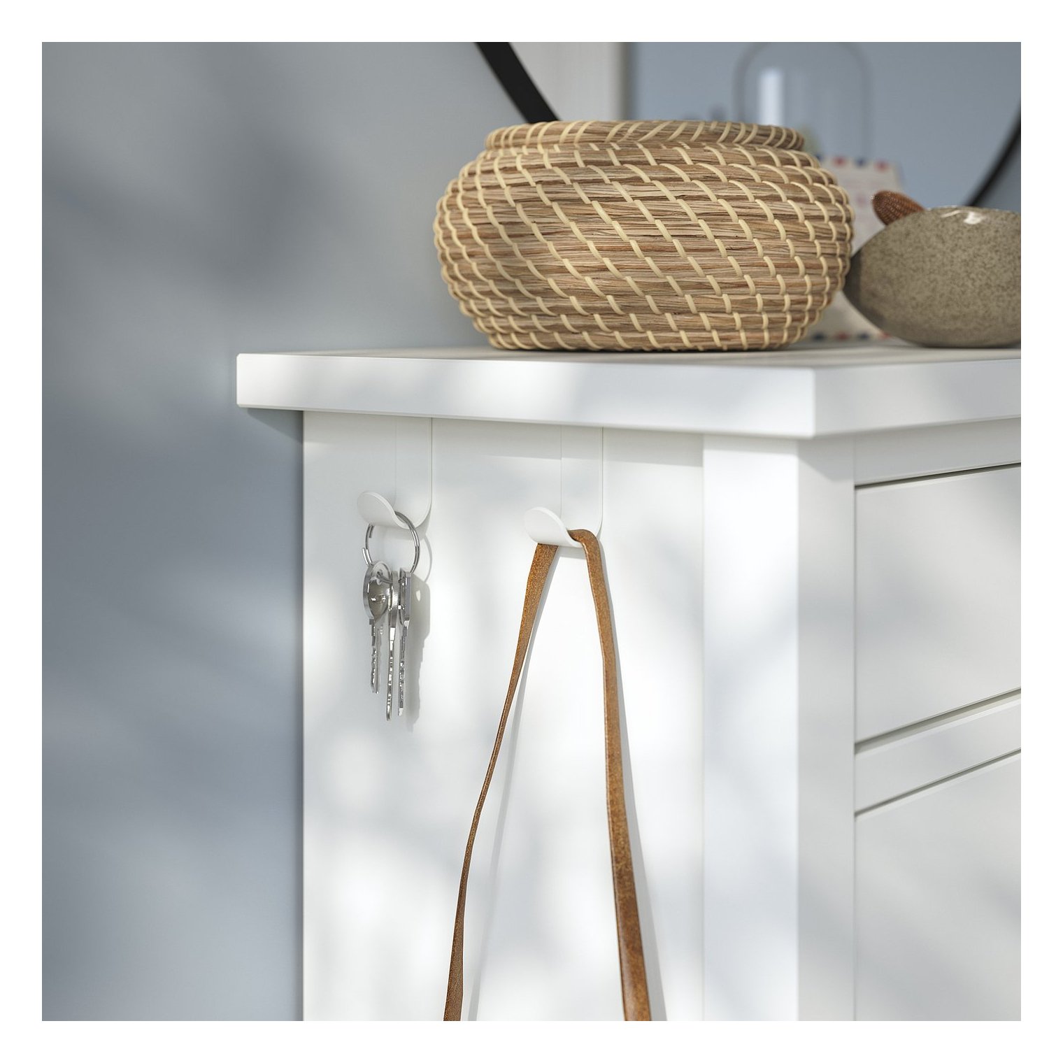 По бокам обувного шкафа расположены крючки, на которые можно повесить куртки или сумки, чтобы максимально эффективно использовать доступное пространство.
