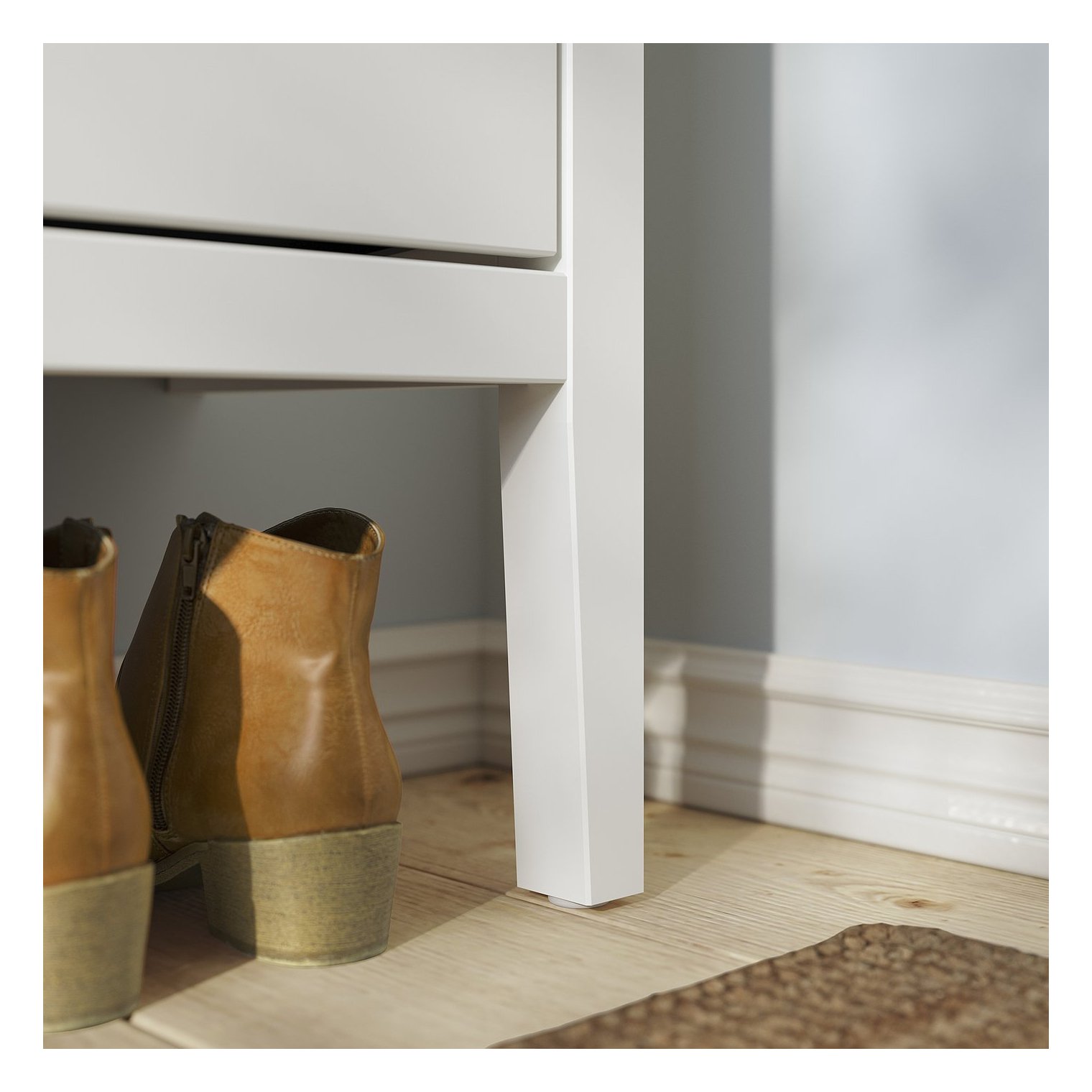 Высокие передние ножки облегчают уборку под шкафом и позволяют максимально придвинуть мебель к стене выше плинтуса.