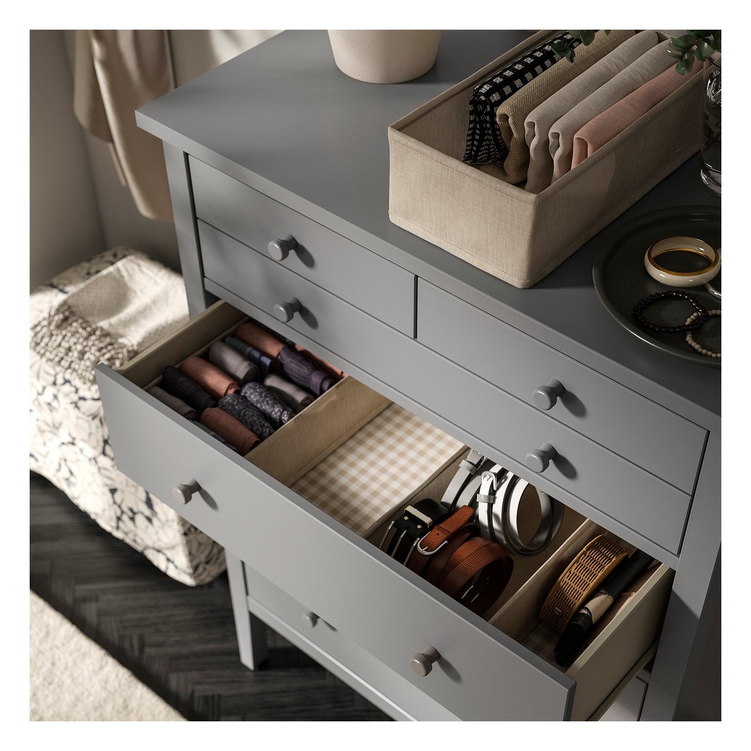 Прикрепив комод к стене, вы активируете функцию безопасности, которая позволяет открыть все ящики одновременно.