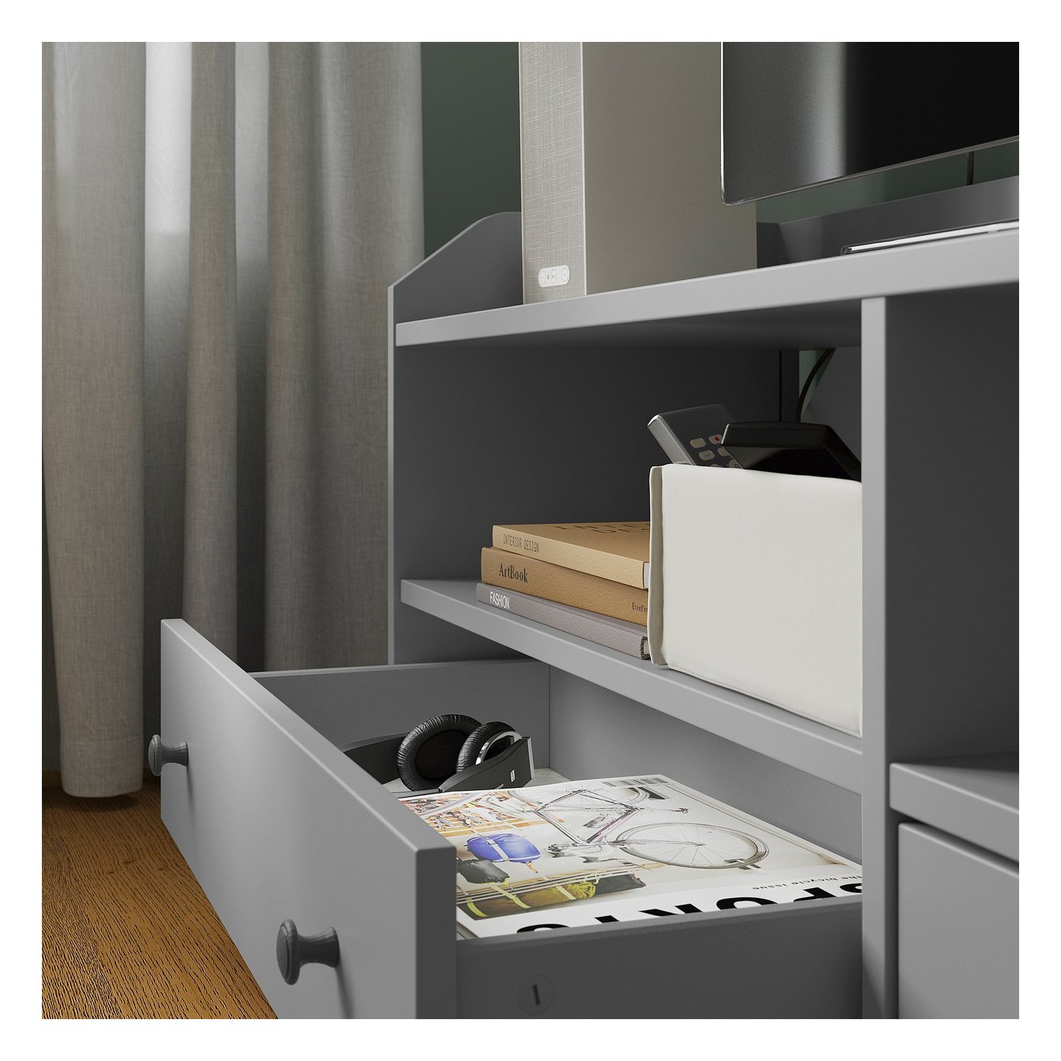 Эта широкая тумба идеально подходит для больших телевизоров. Кроме того, на ней достаточно места для всех аксессуаров, которые вы хотели бы иметь под рукой.