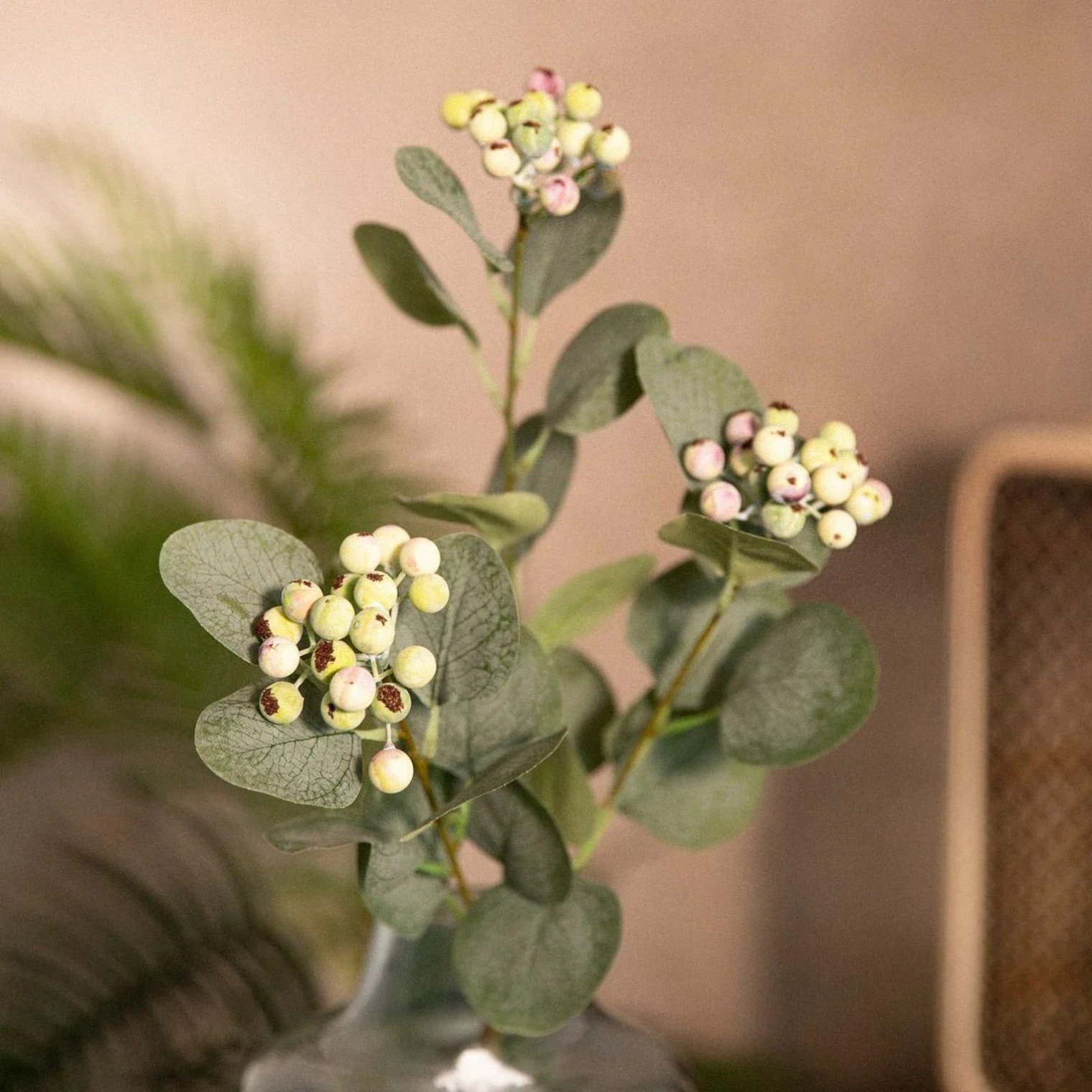 Искусственные цветы становятся все более популярными в домах не только осенью и зимой, но и летом и весной. Искусственная ветка MIRTELO идеально подходит в качестве круглогодичного украшения, которым можно украсить гостиную или любую другую комнату. Ветви, окруженные листьями, увенчаны мелкими созревающими плодами, добавляющими нежный розовый акцент.