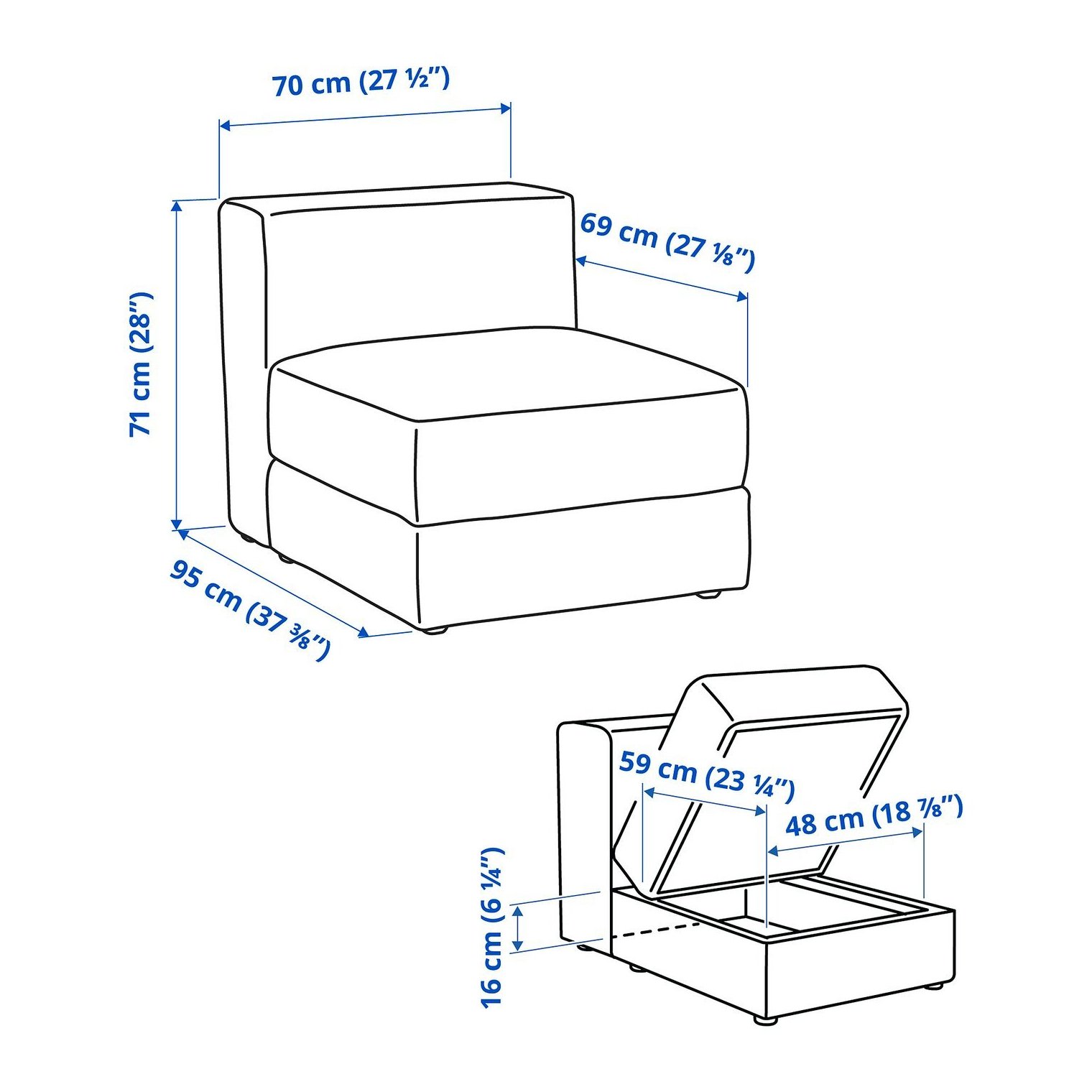 Сочетайте этот модуль сиденья с другими модулями сиденья, модулями шезлонга, подлокотниками и подголовниками. Используйте инструмент планирования, чтобы комбинировать модули различными способами, пока не получите нужную комбинацию.
