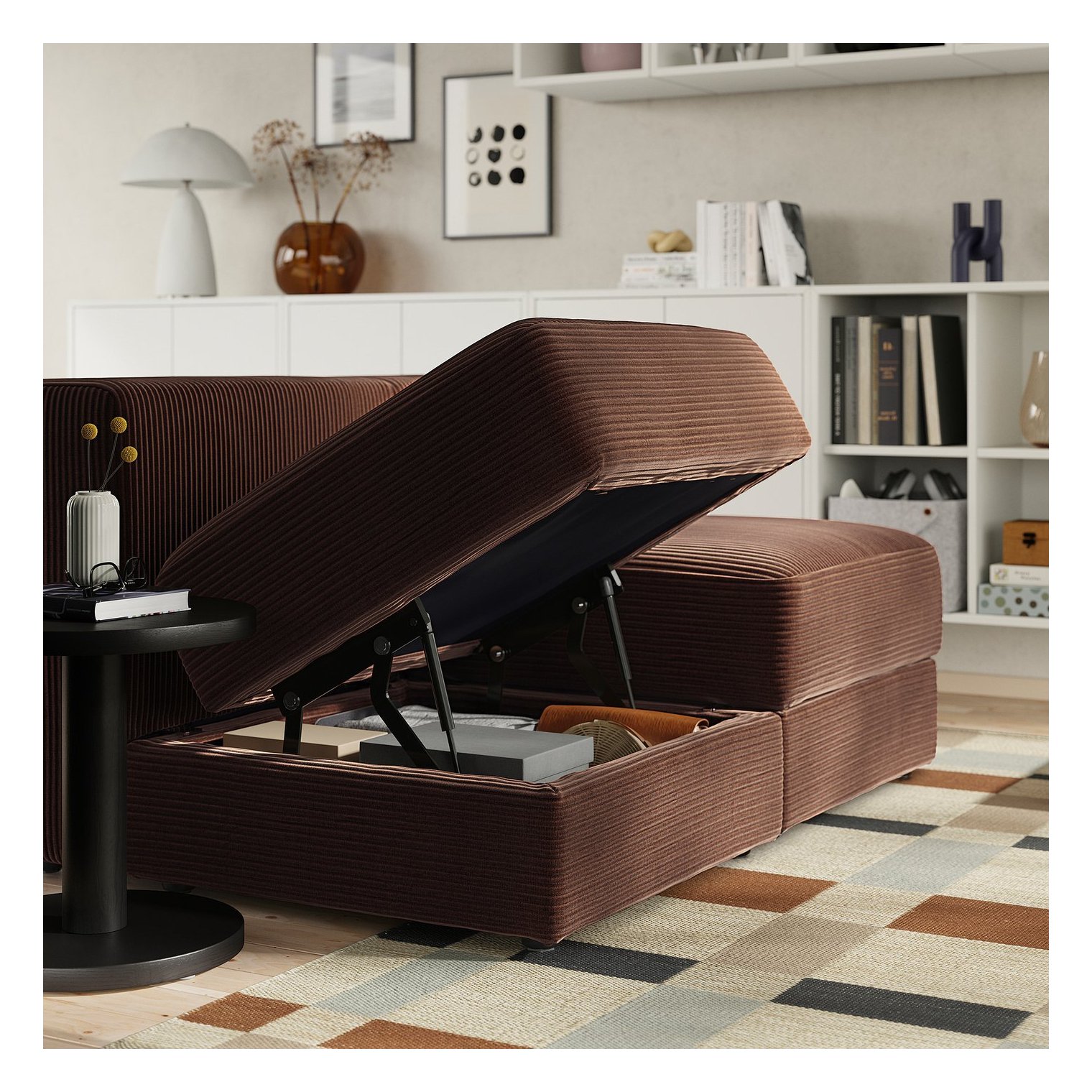 В просторном отделении под сиденьем шезлонга и под сиденьем можно хранить такие вещи, как пледы, игры и коробки с мелкими предметами.