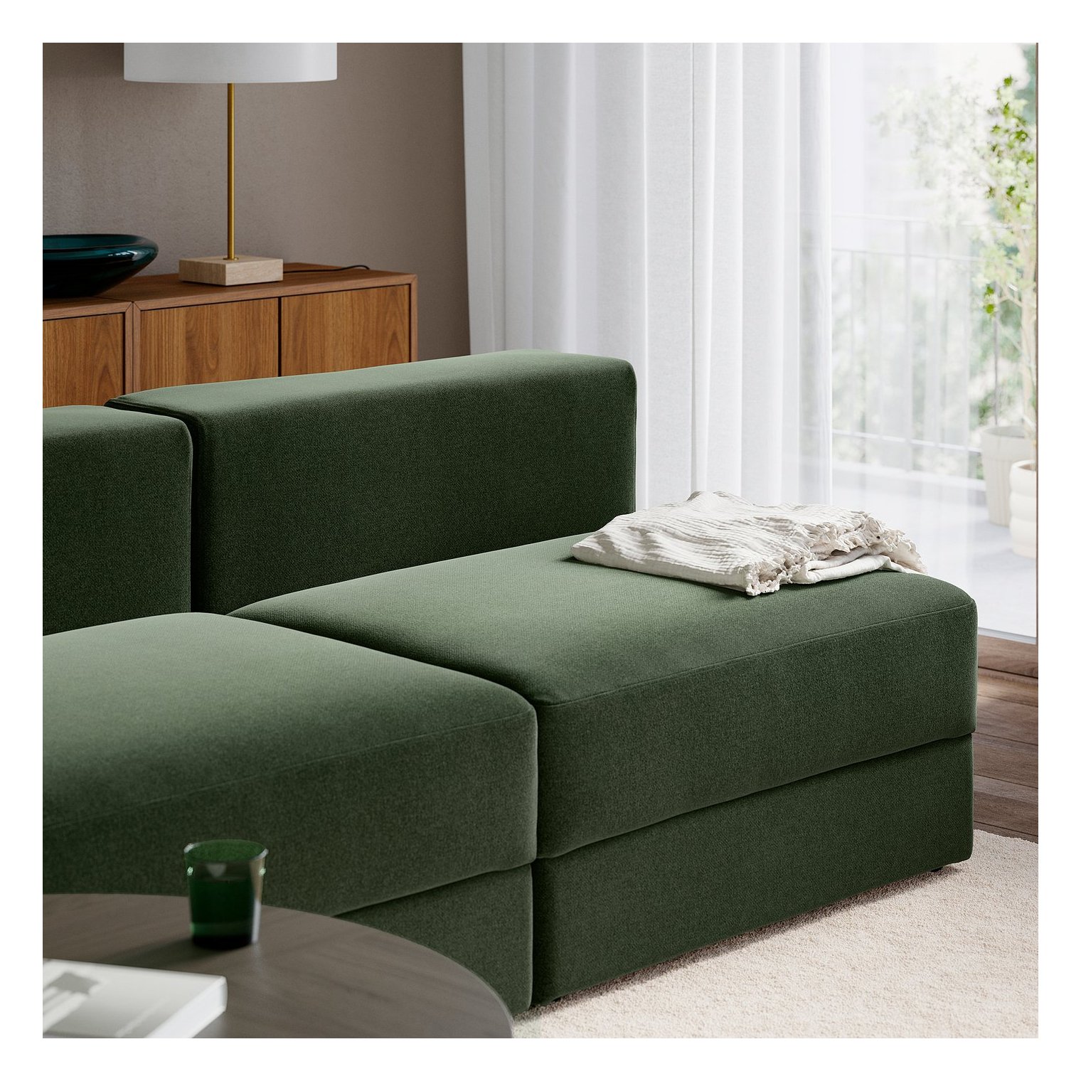 Модульный диван JÄTTEBO отличается простой формой и чистыми линиями, он мягкий, удобный и практичный, с местом для хранения под сиденьем.