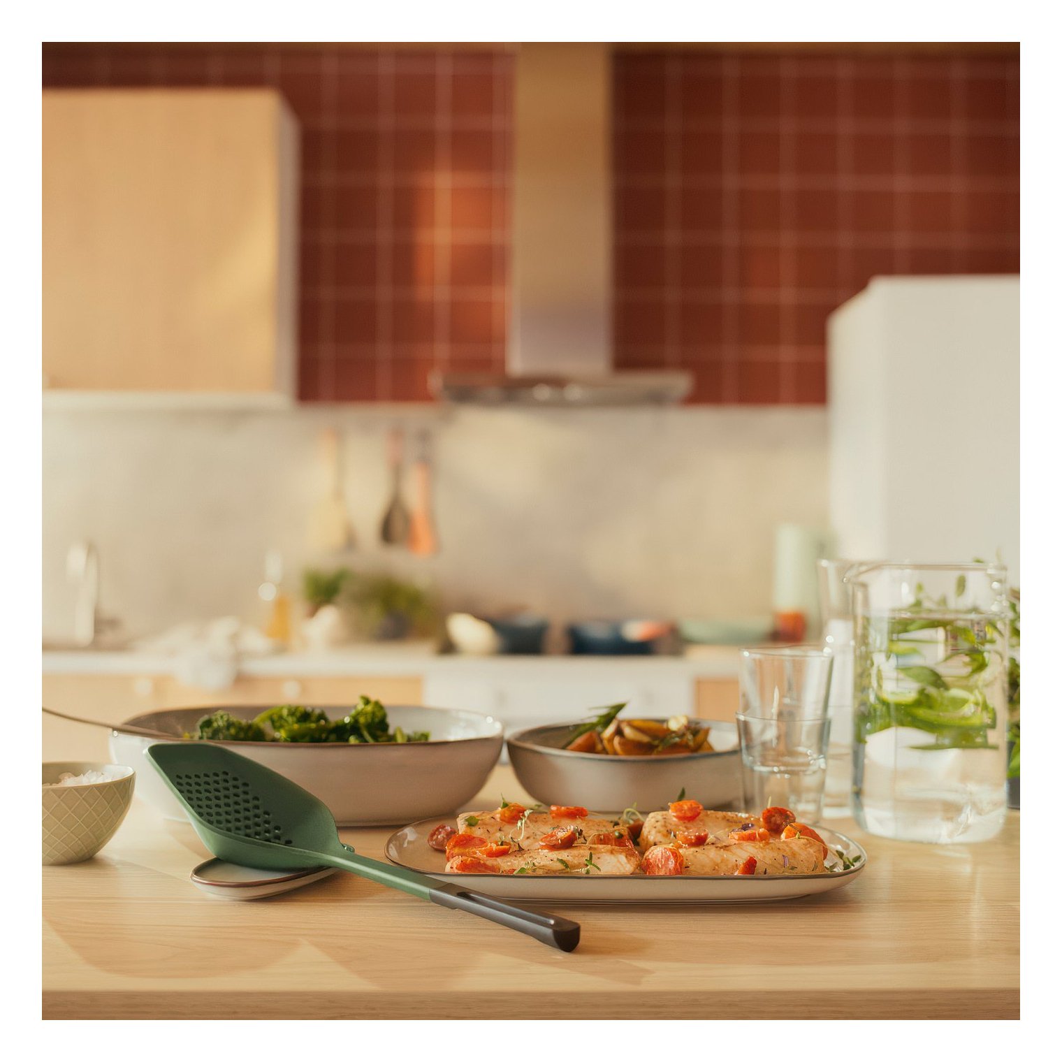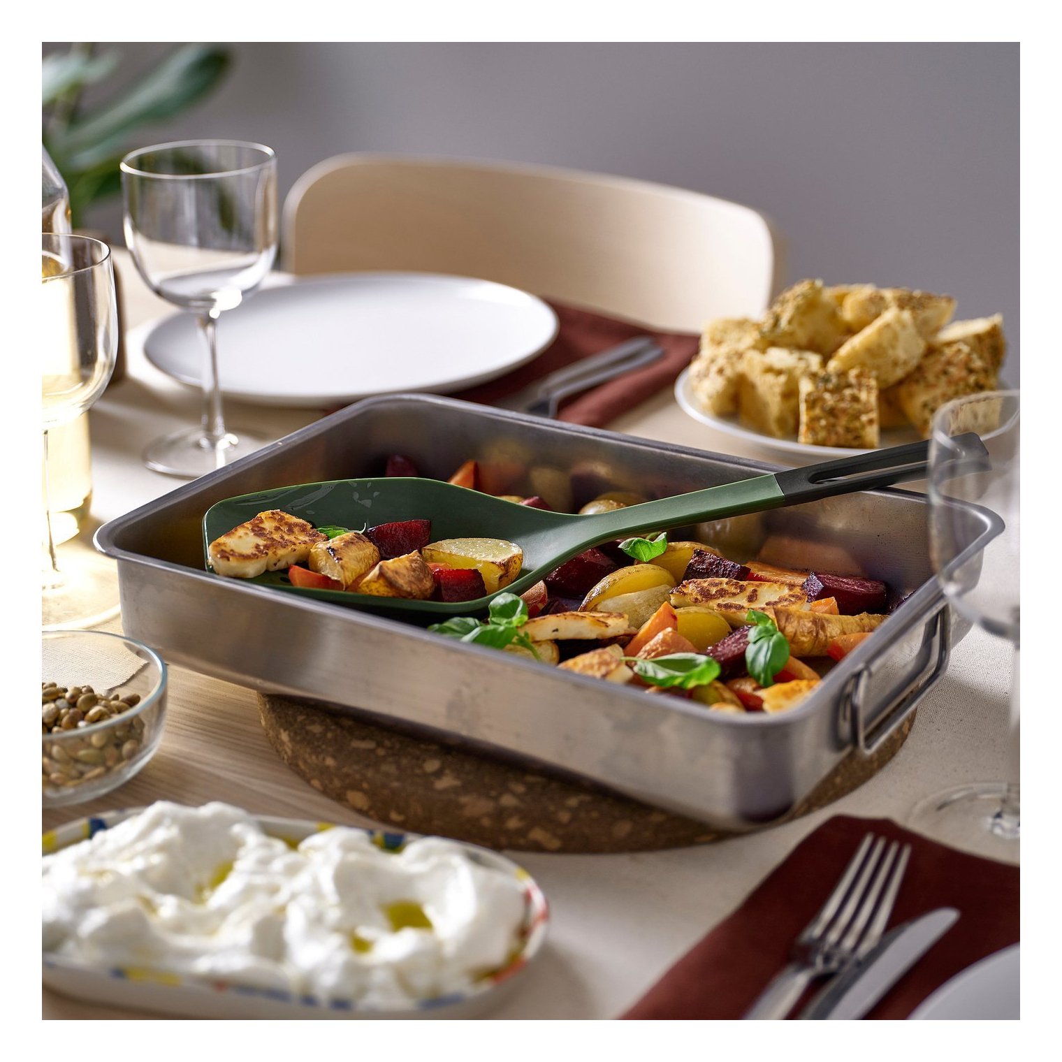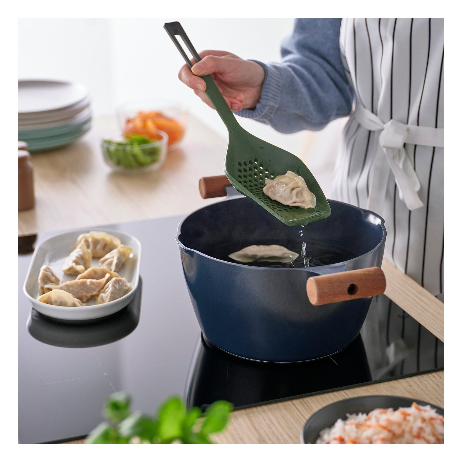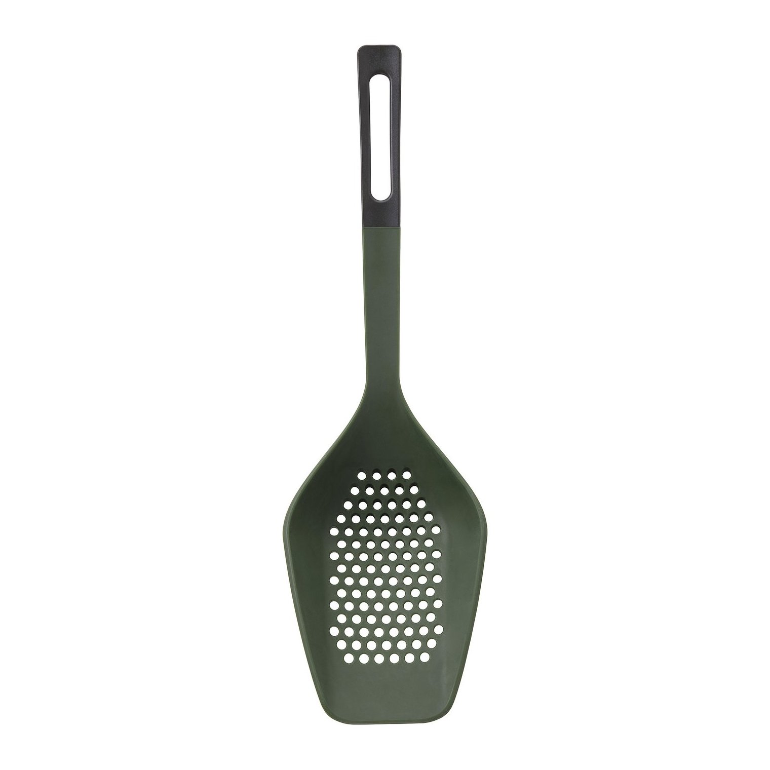 Многофункциональная лопатка — идеально подходит для вычерпывания кипящих овощей и пасты, а также для удаления пережаренных овощей из жаровни. Также её можно использовать в качестве шумовки при жарке во фритюре.