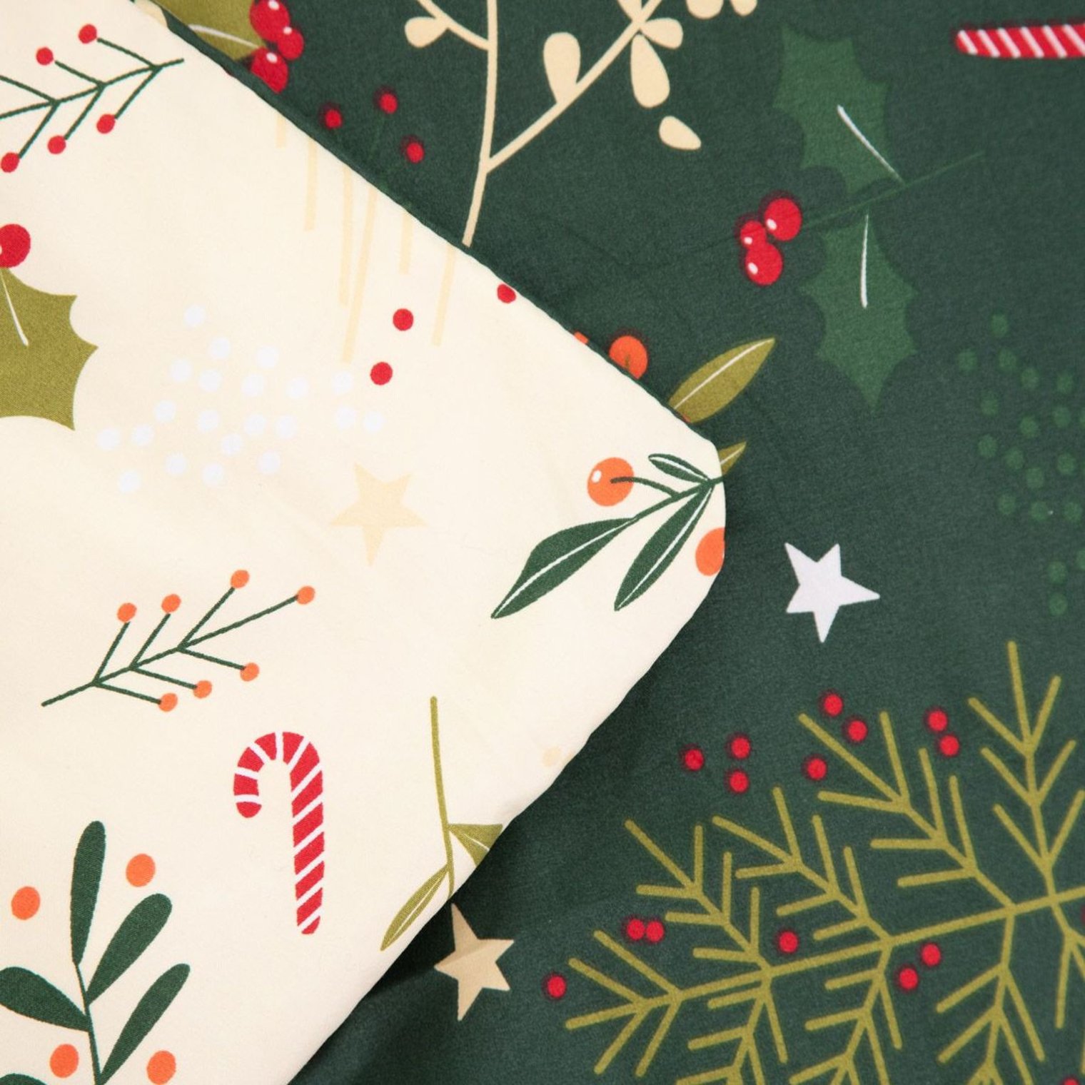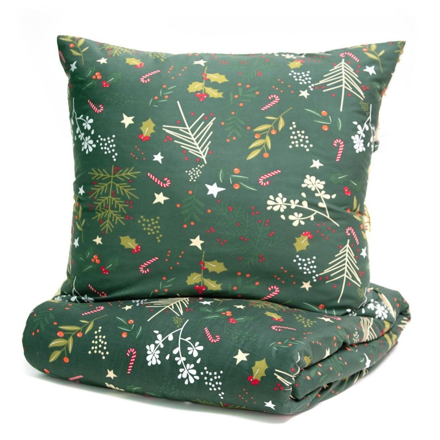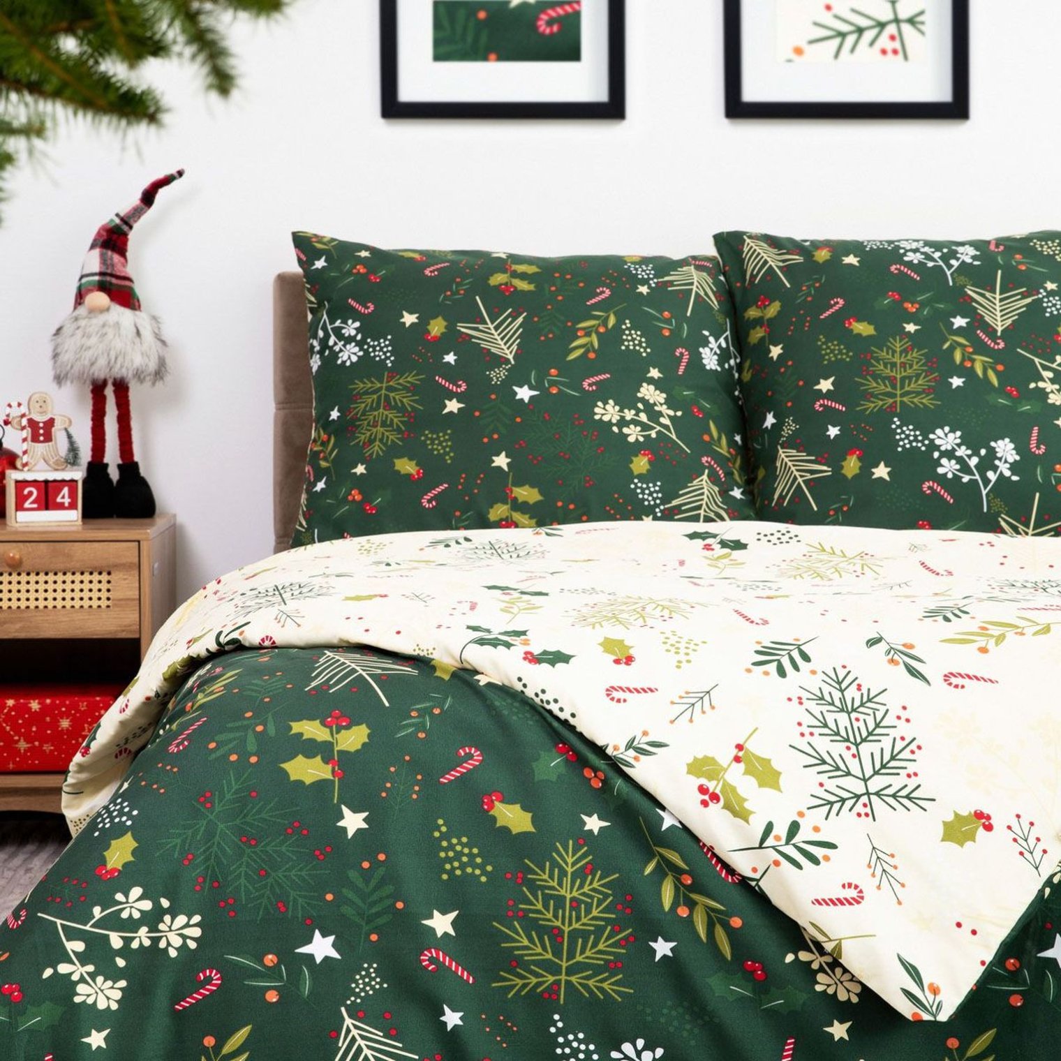 Рождественский комплект постельного белья GODIS состоит из пододеяльника размером 220 х 200 см и двух наволочек размером 70 х 80 см. Красивый рождественский узор с изображением сосновых шишек, листьев падуба и омелы идеально гармонирует с двусторонним фоном: светло-зелёным с одной стороны и тёмно-зелёным с другой.