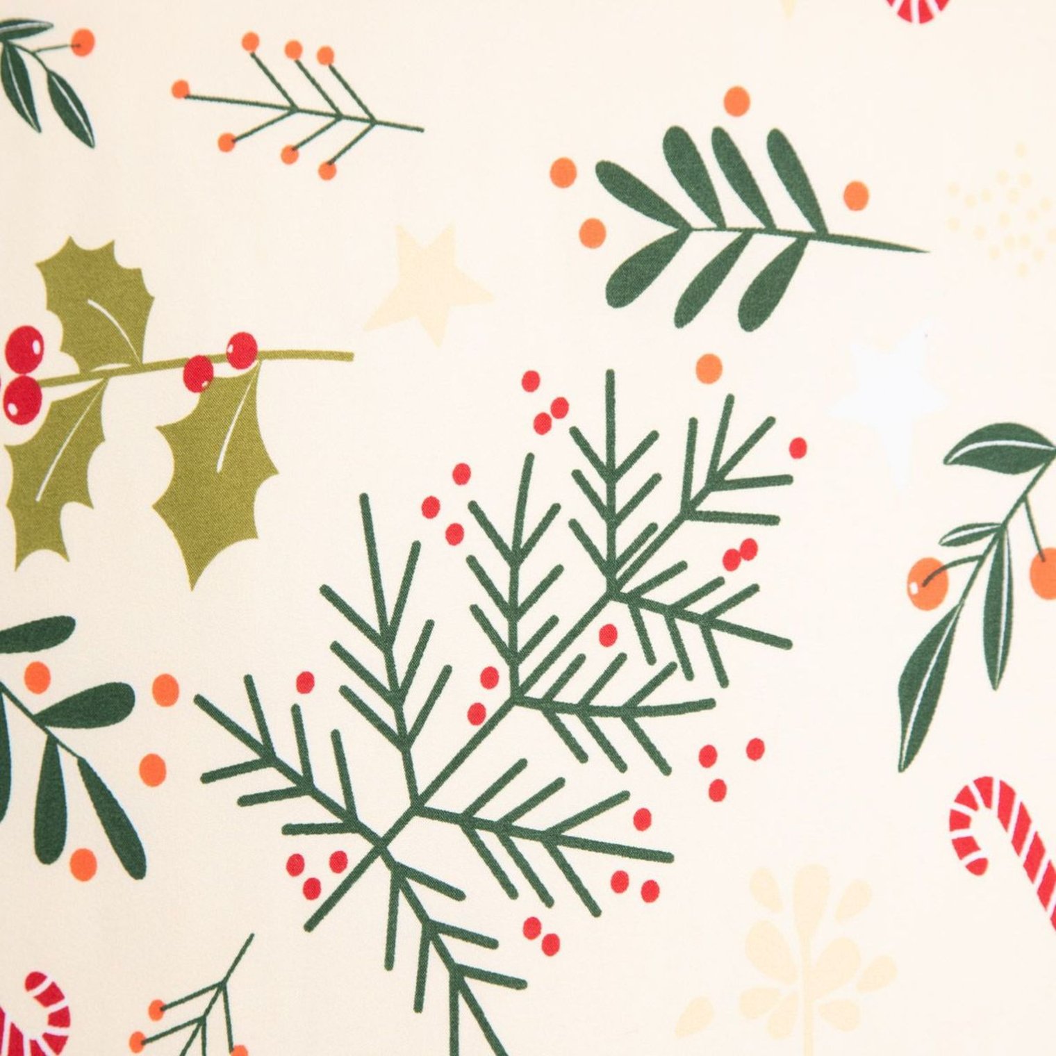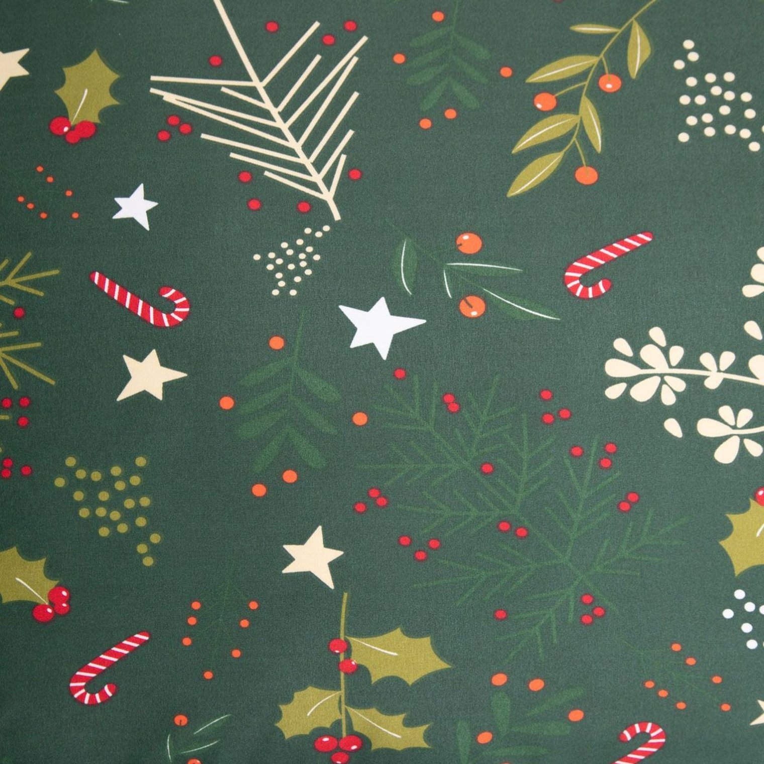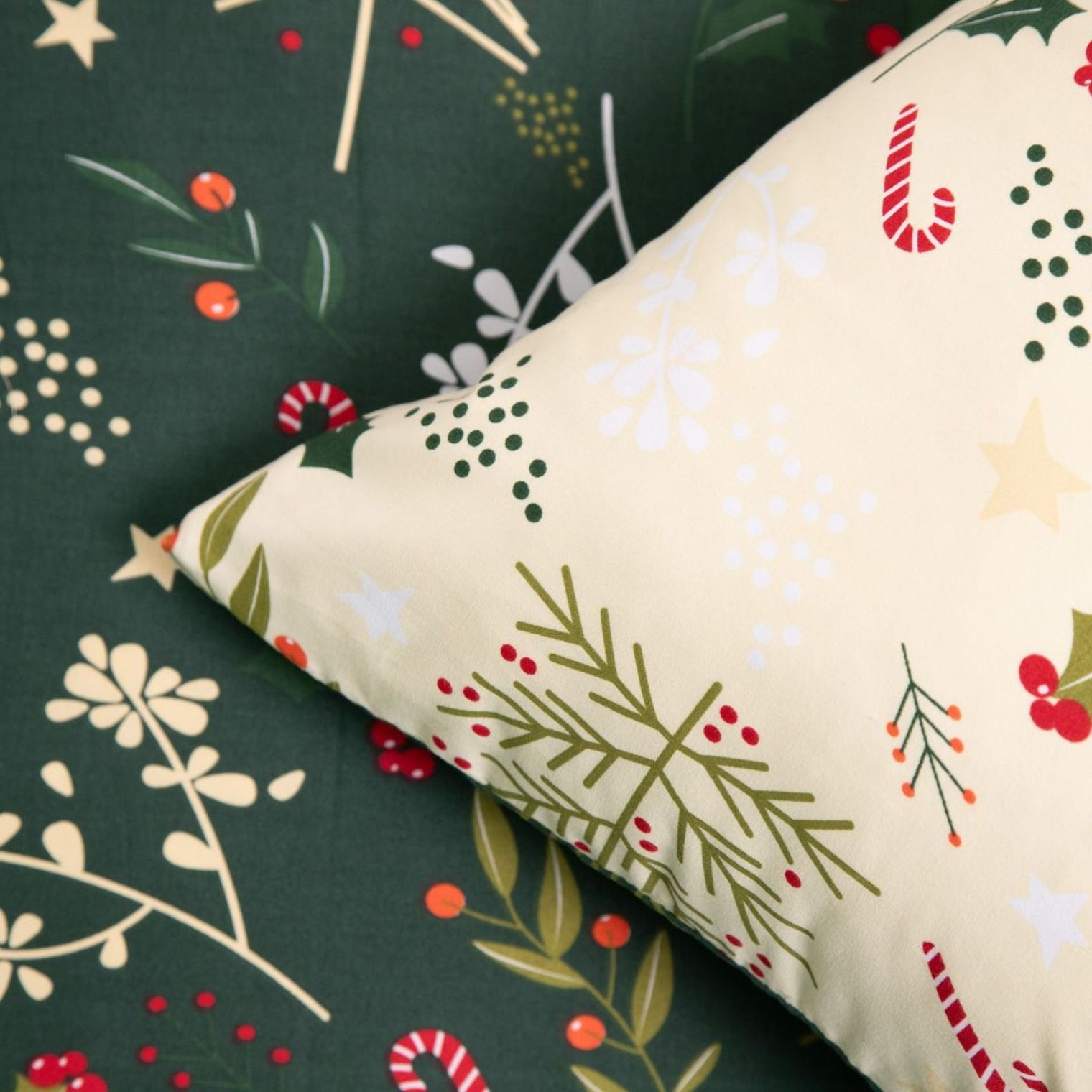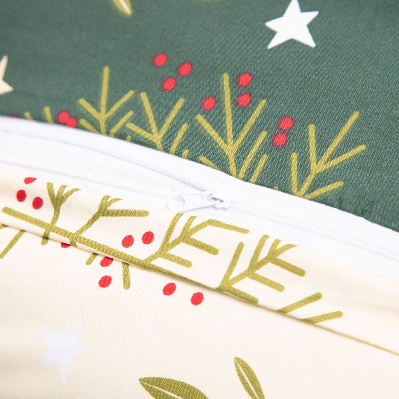 Рождественский комплект постельного белья GODIS состоит из пододеяльника размером 220 х 200 см и двух наволочек размером 70 х 80 см. Красивый рождественский узор с изображением сосновых шишек, листьев падуба и омелы идеально гармонирует с двусторонним фоном: светло-зелёным с одной стороны и тёмно-зелёным с другой.