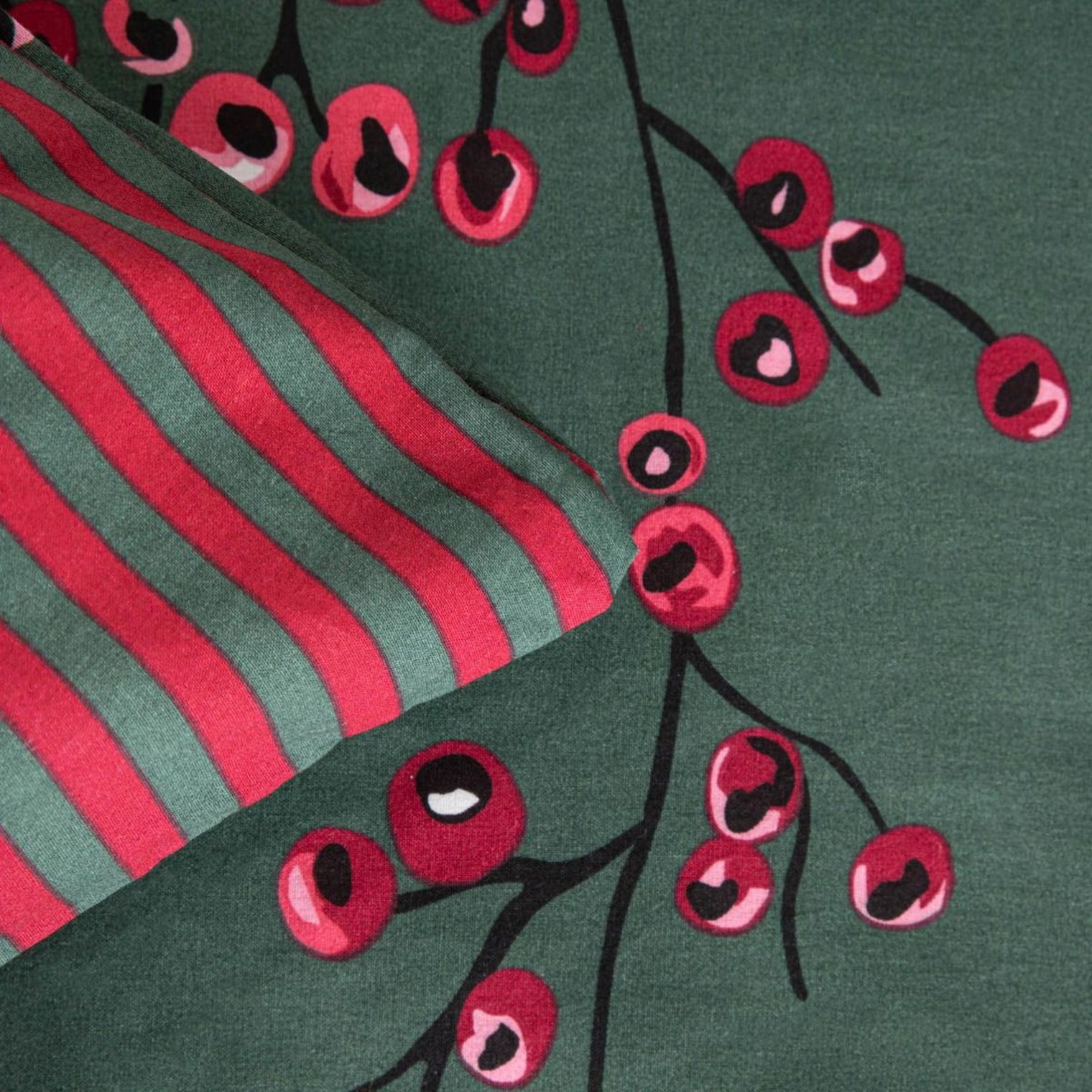 Этот двухсторонний пододеяльник украшен ярким праздничным узором: одна сторона украшена веточками падуба на зелёном фоне, а другая — зелёными и красными полосками. Красный и зелёный — вечные праздничные цвета, которые идеально дополнят любой праздничный интерьер. Хлопковый пододеяльник с праздничным узором станет прекрасным дополнением к вашей спальне.