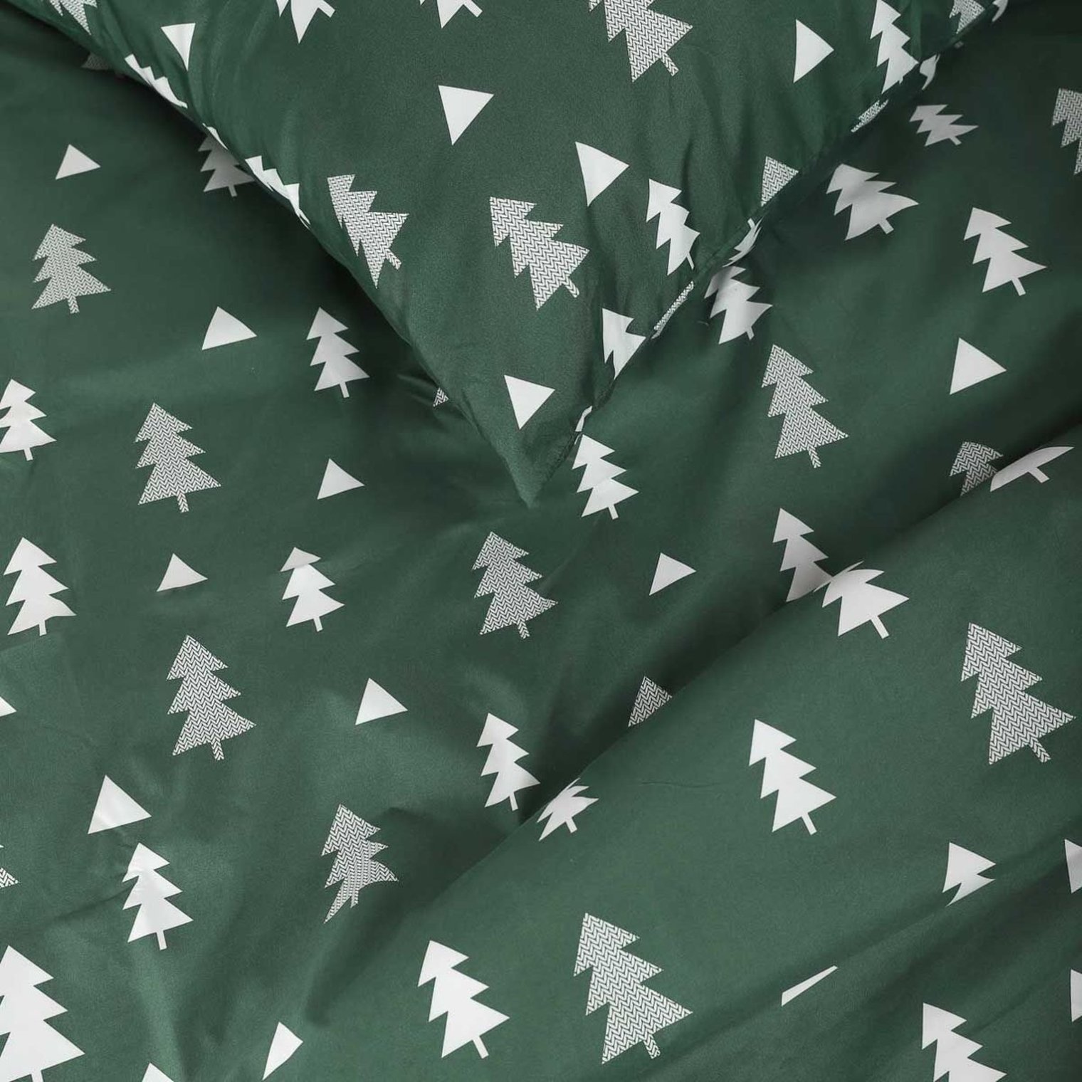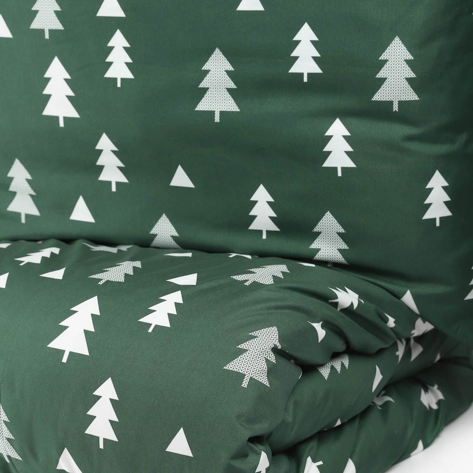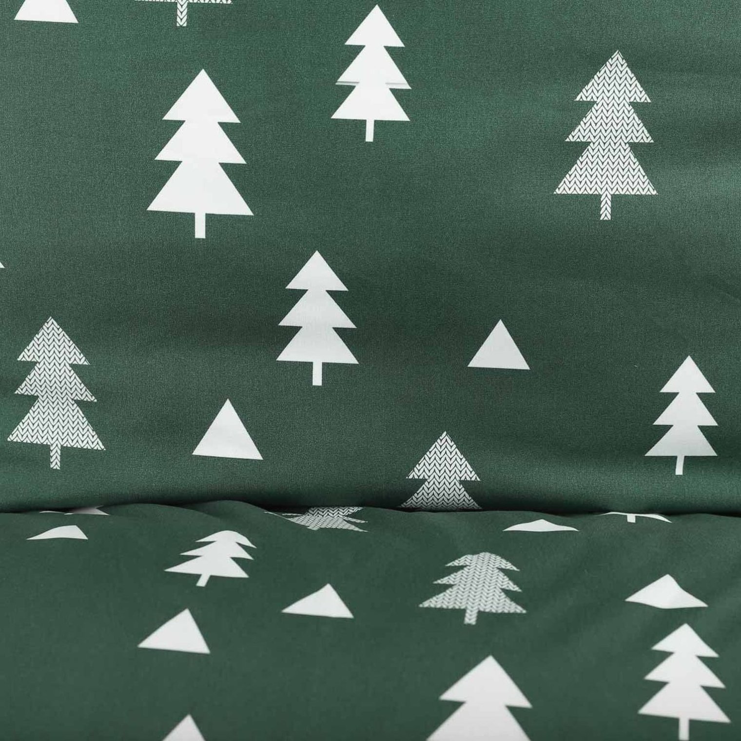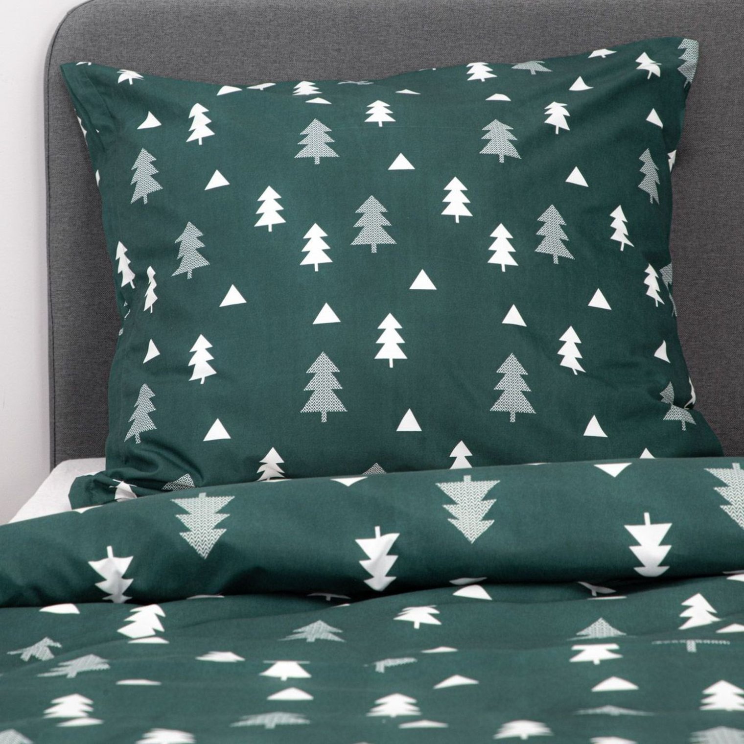 Комплект постельного белья PEMA включает пододеяльник размером 160 x 200 см и две наволочки размером 70 x 80 см. Этот комплект добавит праздничного настроения любой спальне благодаря рисунку в виде маленьких белых ёлочек на ярком зелёном фоне. Он прекрасно сочетается с классическим белым и приглушёнными цветами, а также с ярким красным, особенно в праздничные дни.