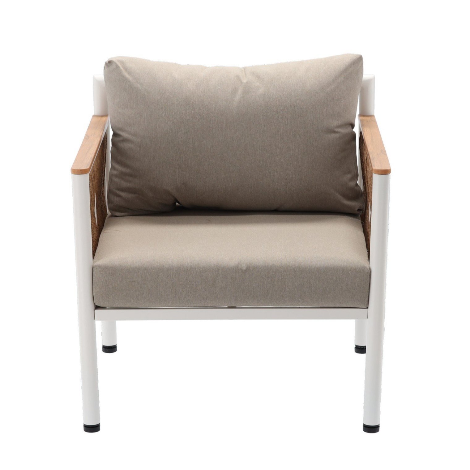 Элегантный и современный комплект алюминиевой мебели, который прекрасно подойдет для террасы, сада или балкона. Минималистичный дизайн и использование высококачественных материалов гарантируют долговечность и комфорт использования. Бежевые подушки и элементы, имитирующие дерево, придают комплекту неповторимый характер.