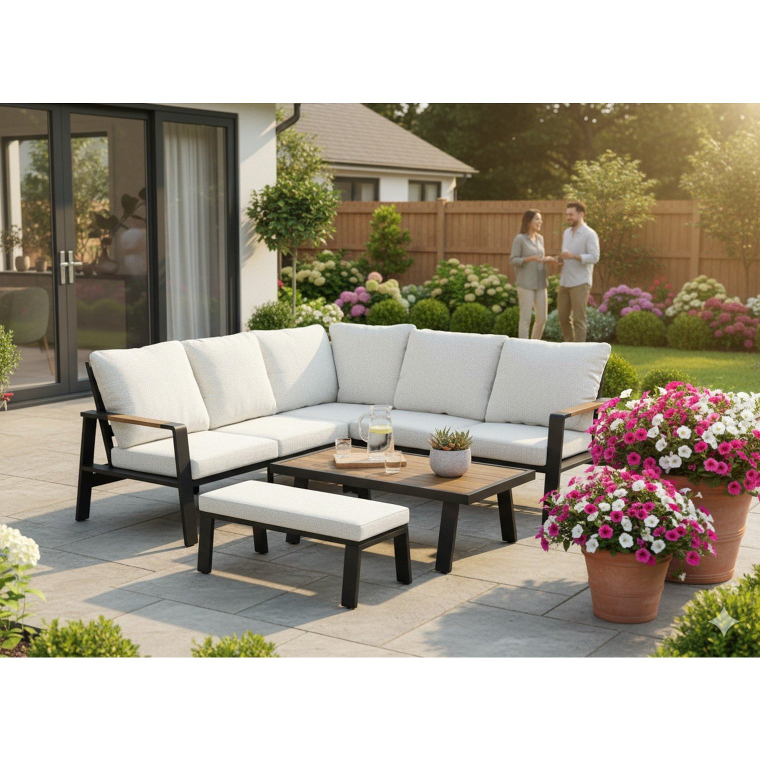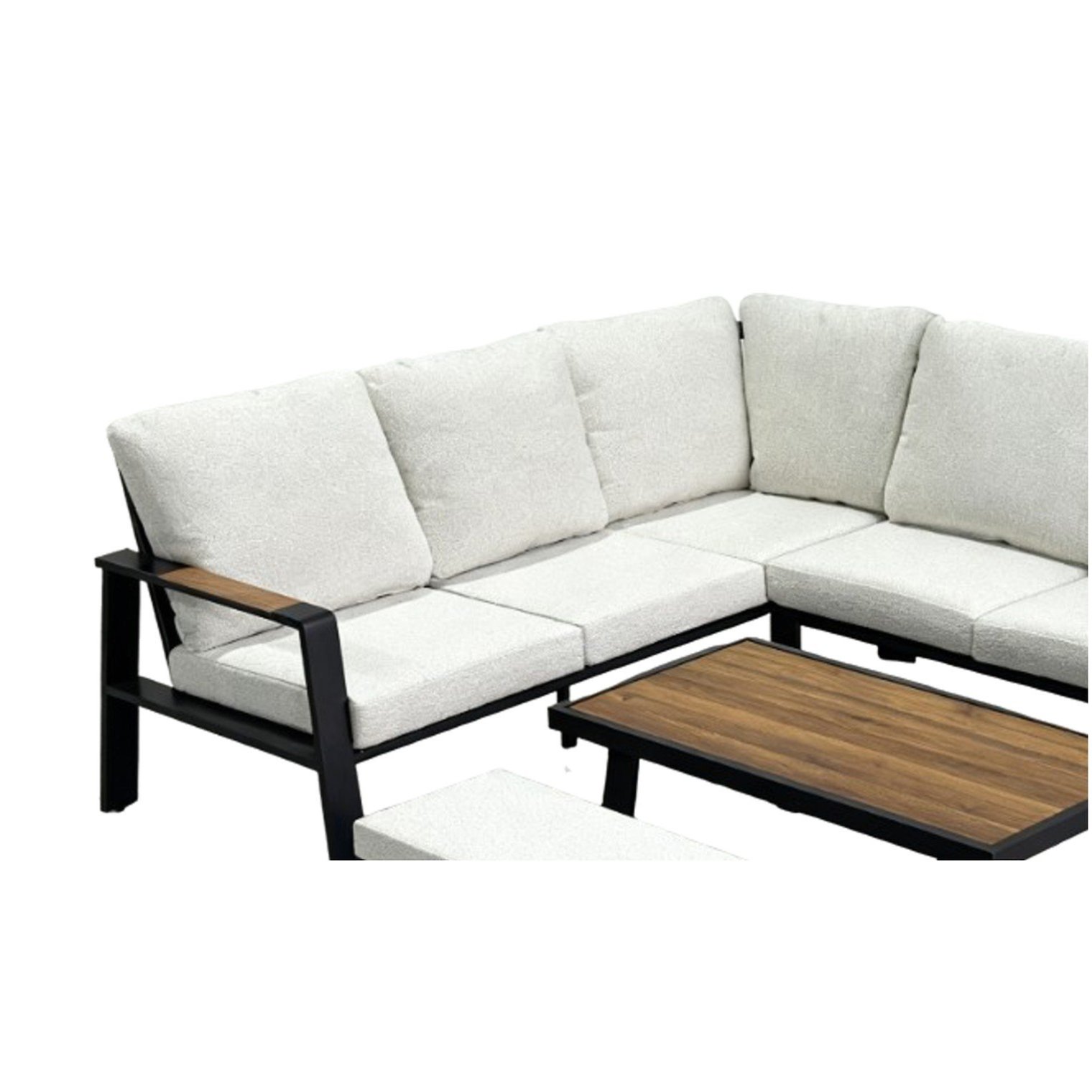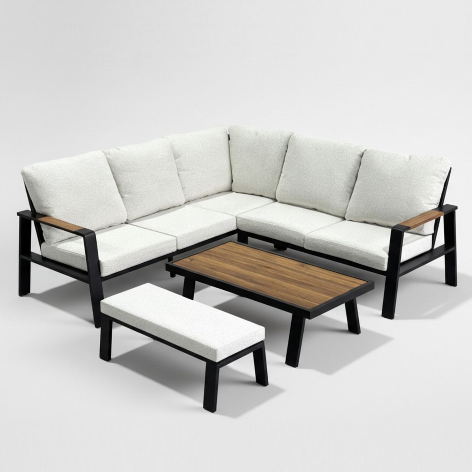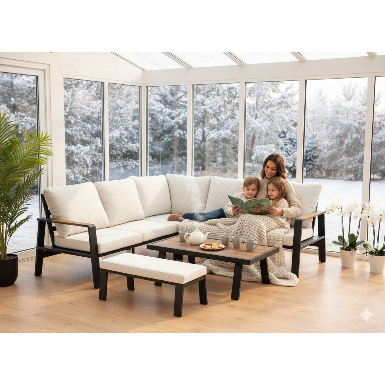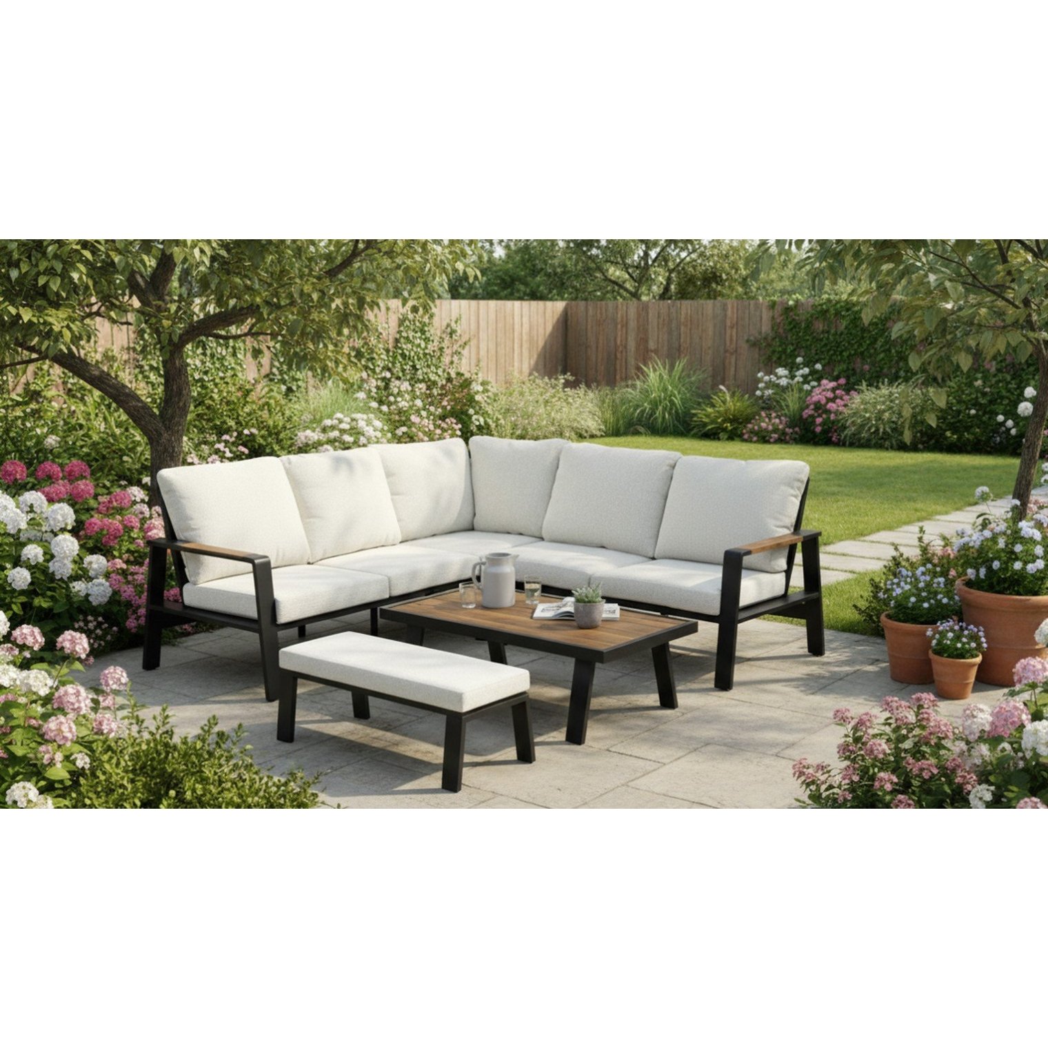 Привнесите в свое открытое пространство сочетание современного дизайна, долговечности и комфорта. Комплект алюминиевой мебели PRISTINA идеально подходит для патио, сада или беседки. Контрастные цвета черного каркаса со светло-бежевыми подушками, а также столешница и подлокотники из гидроизоляционного материала создают элегантное и вневременное целое.