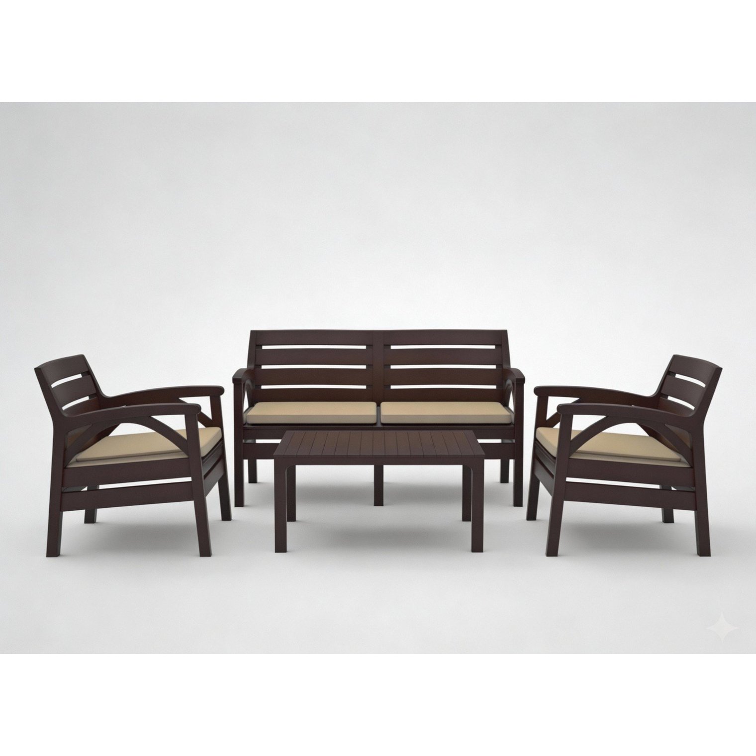 Этот комплект разработан с учетом комфорта и функциональности. Он включает в себя два удобных кресла, двухместную скамью и практичный стол , создавая гармоничную и эстетически привлекательную зону отдыха.