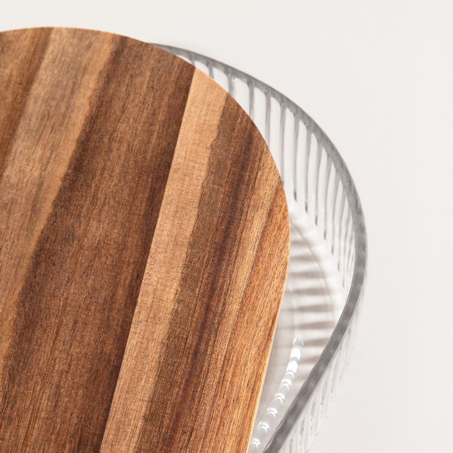 Контейнер изготовлен из высококачественного стекла, а крышка — из прочной древесины акации. Стеклянные элементы можно мыть в посудомоечной машине. Не подходит для использования в микроволновой печи.