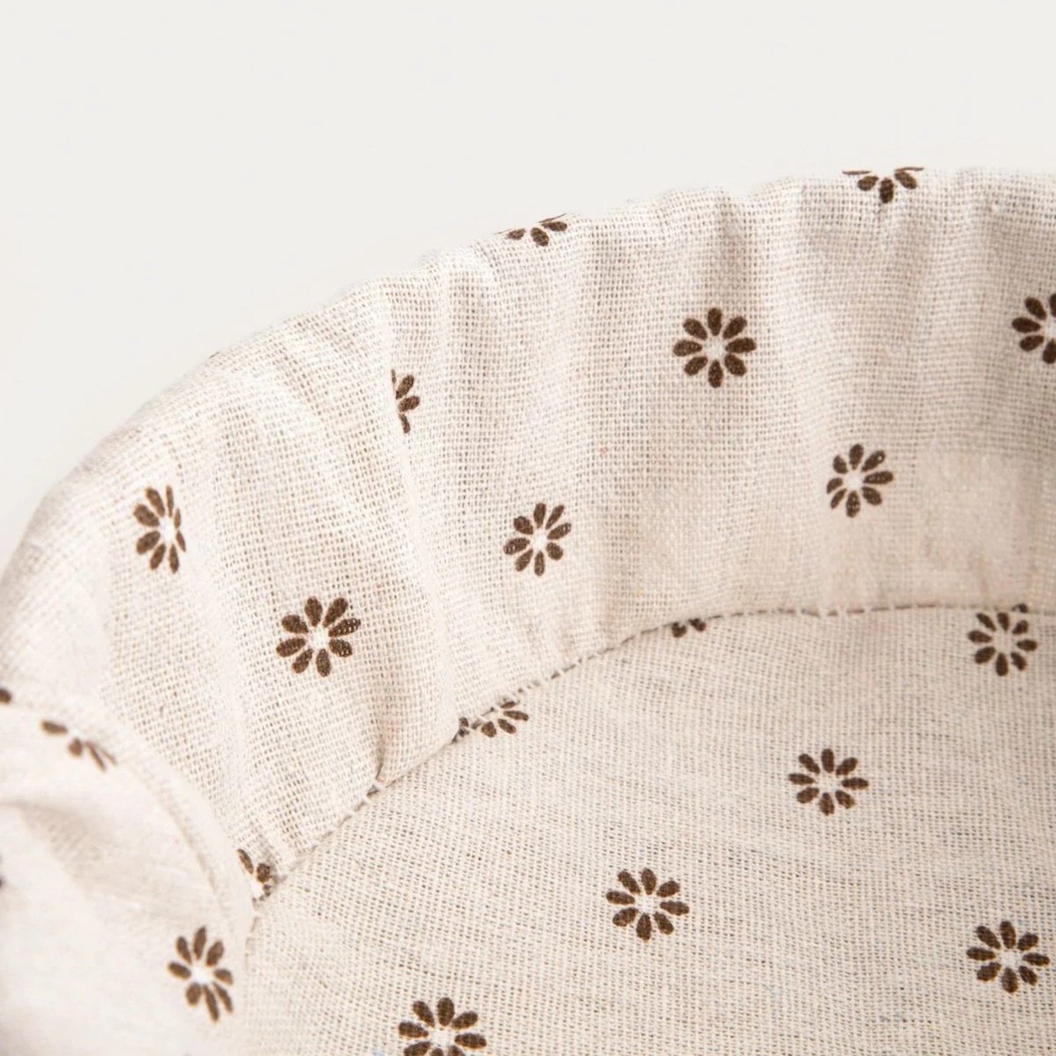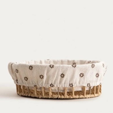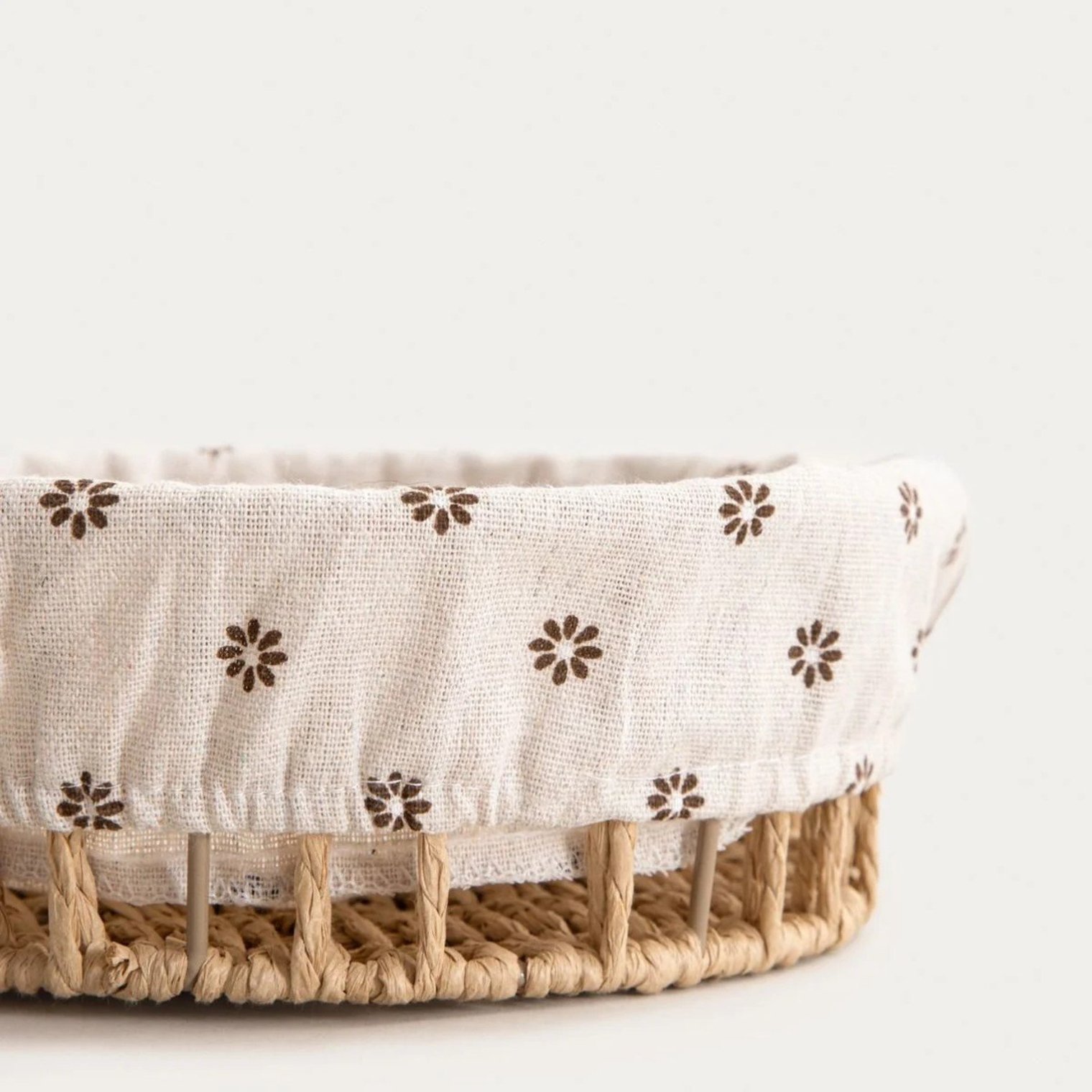Корзина NORSO — это стильный и практичный аксессуар, который прекрасно дополнит любую сервировку стола. Ее натуральный плетеный дизайн элегантно сочетается с легкой тканевой вставкой. Нежный цветочный узор придает ей легкость и уют. Она идеально впишется в интерьеры в стиле рустик и скандинавском стиле.