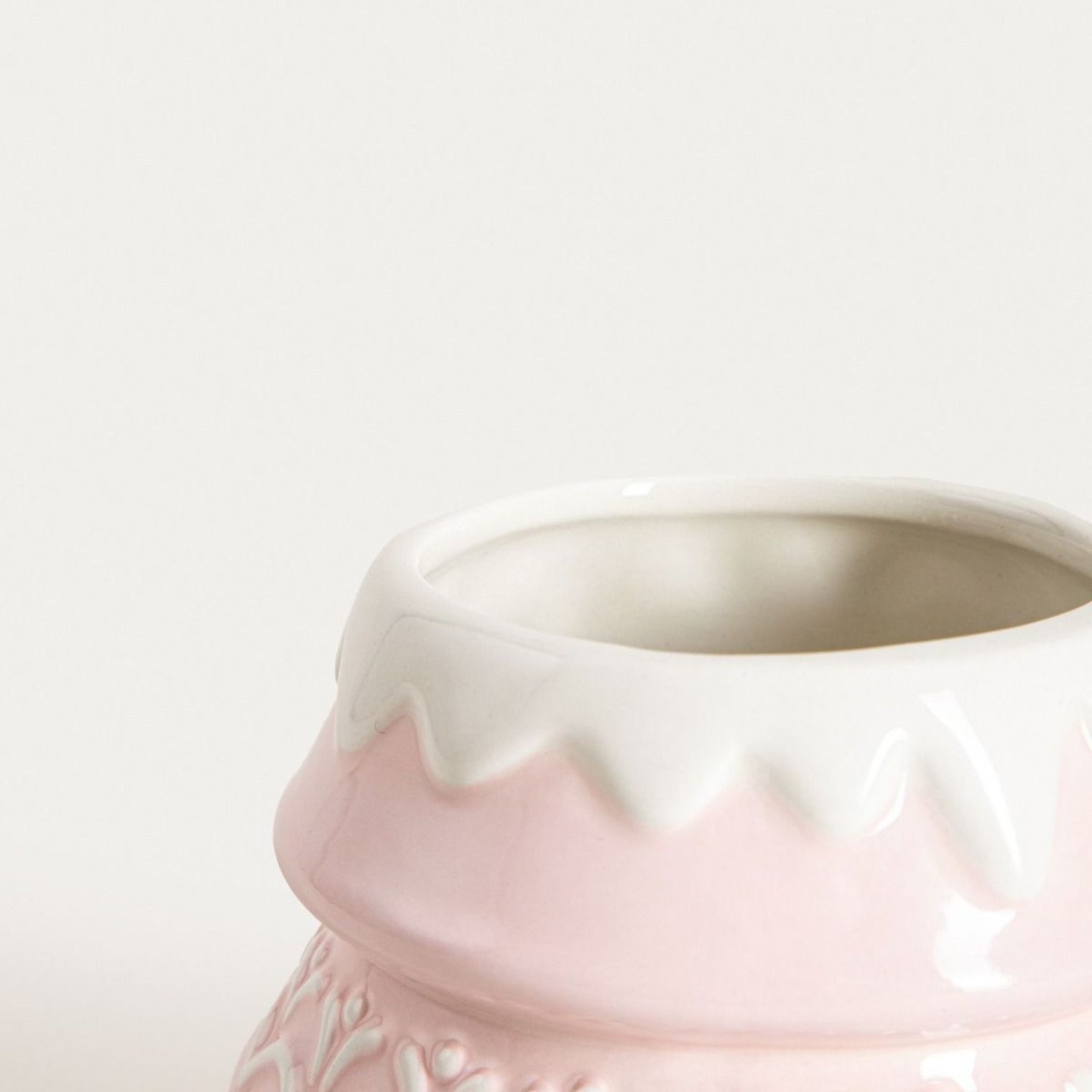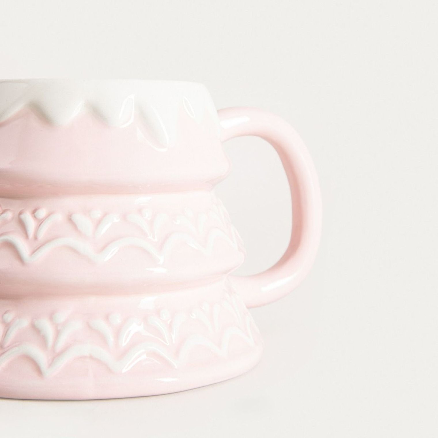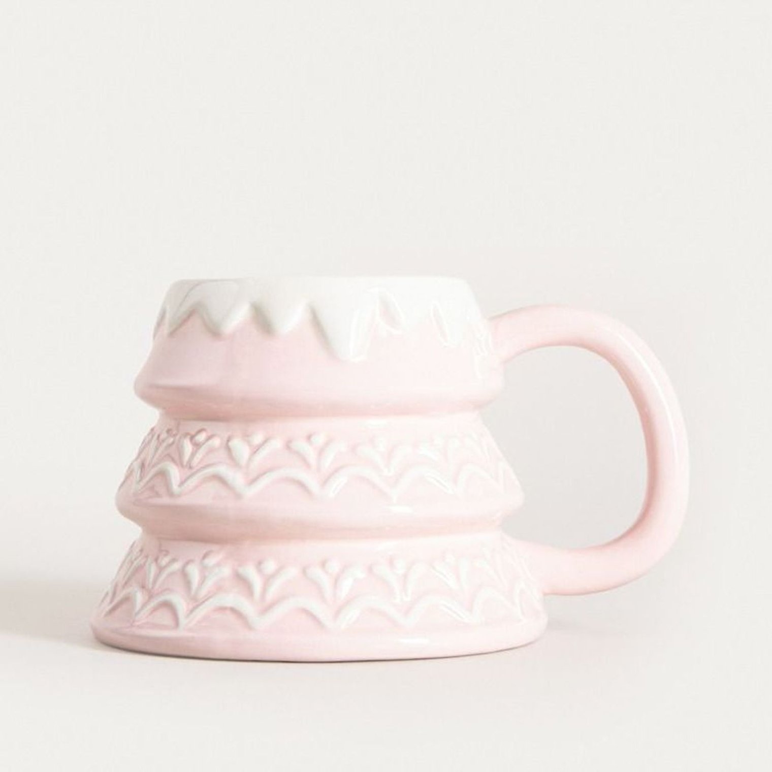 Эта кружка в форме рождественской ёлки очаровательного пудрово-розового цвета украшена изящным узором, напоминающим глазированный торт. Она идеально подходит для горячего напитка, который согреет вас зимним вечером.