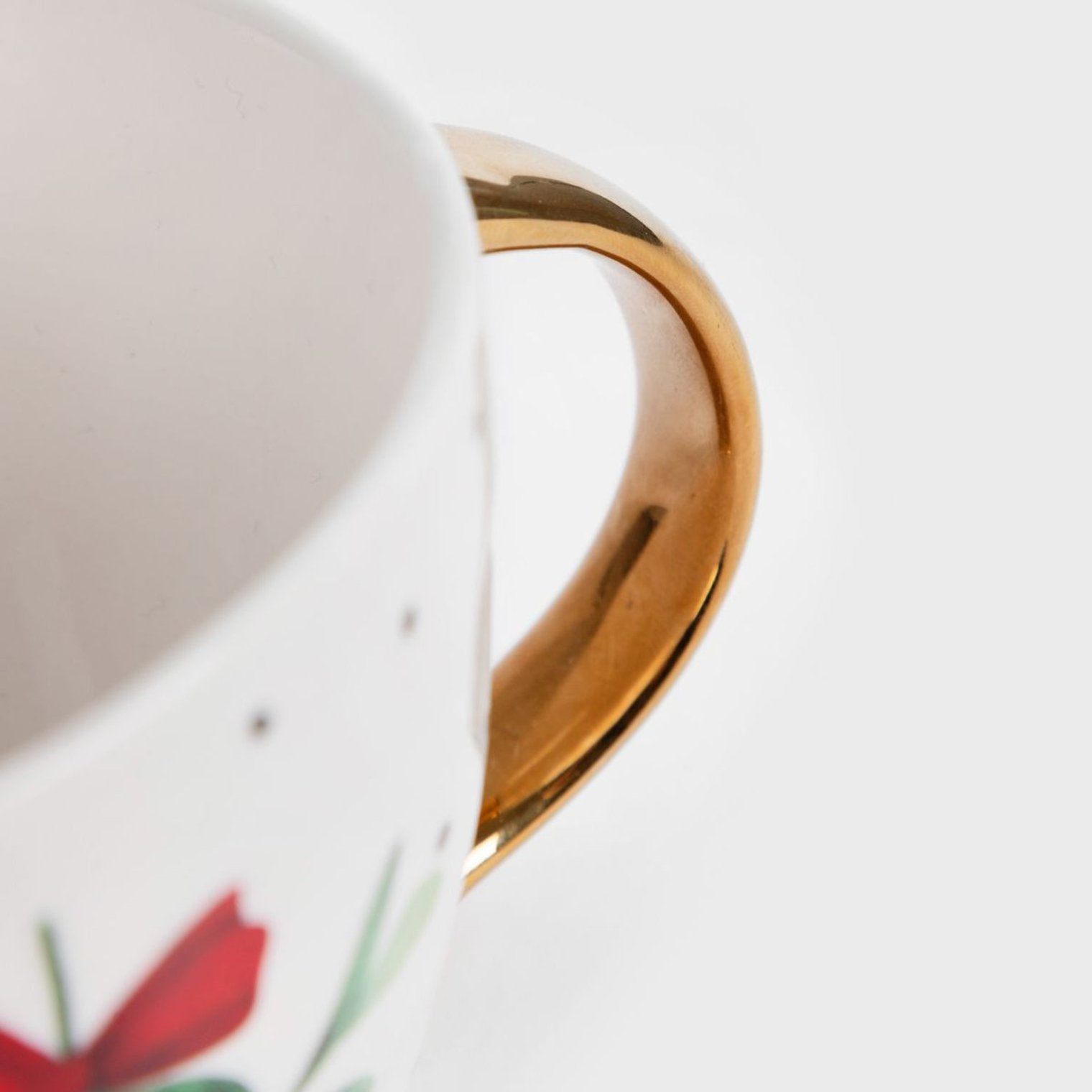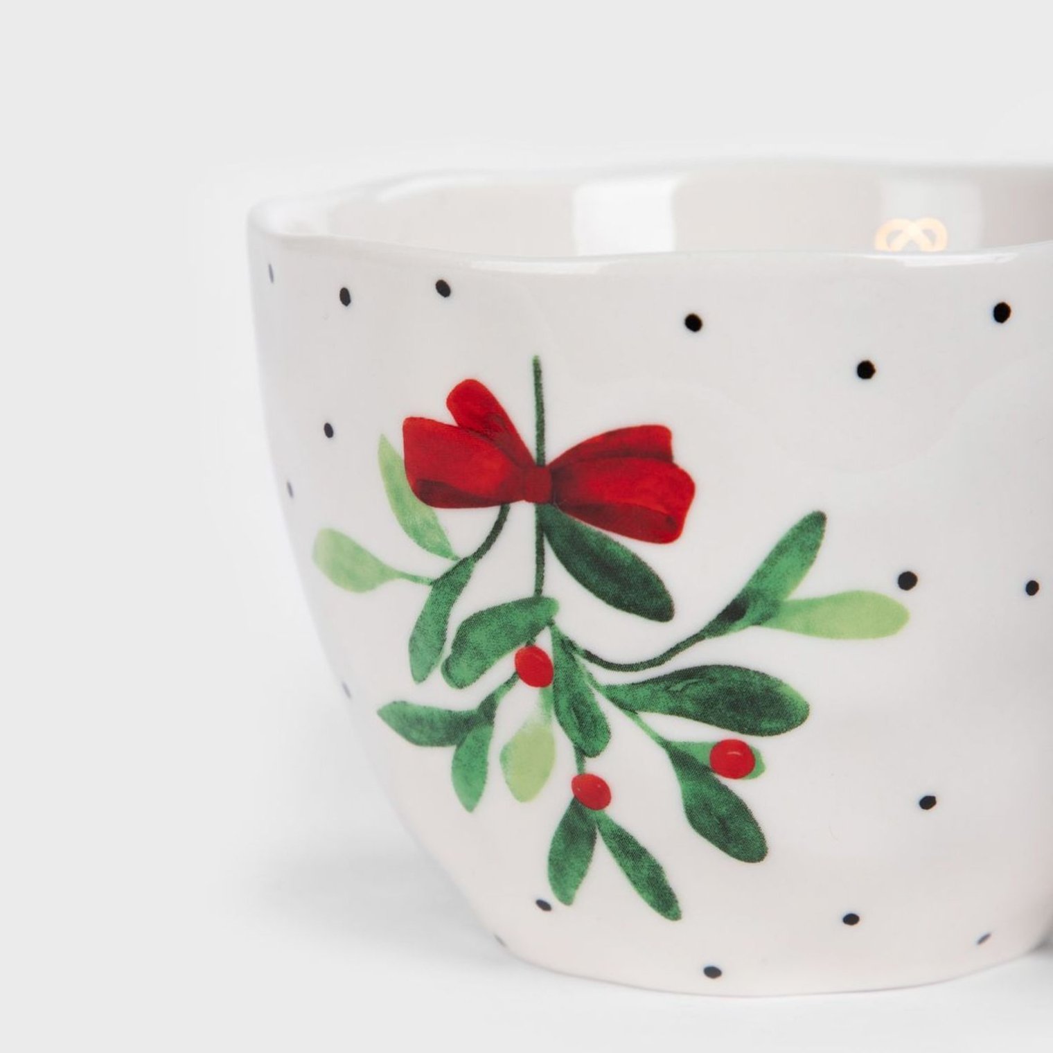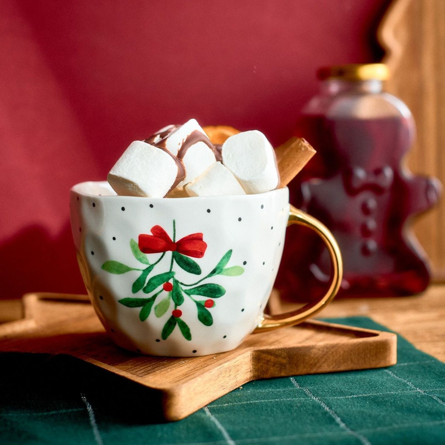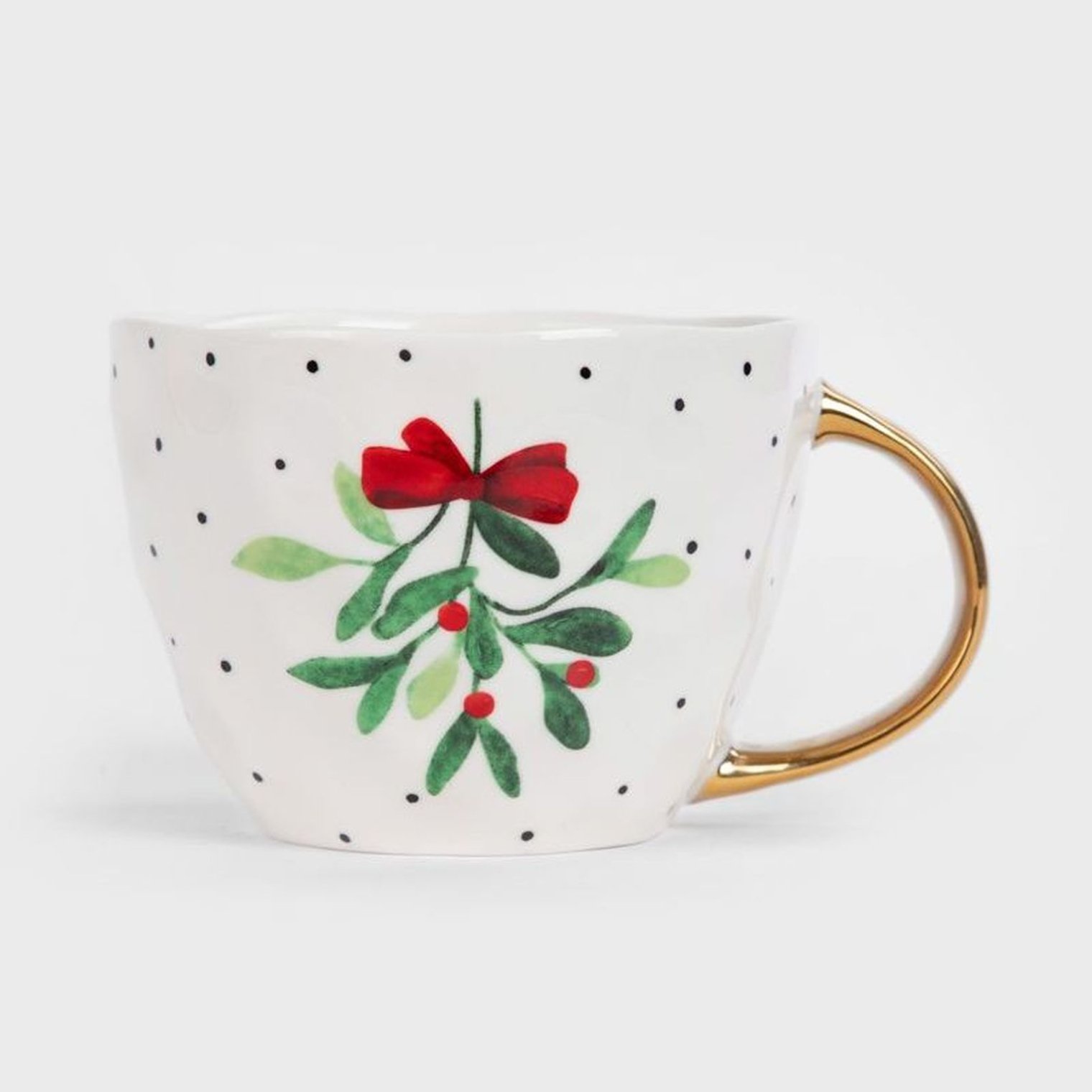 Эта рождественская кружка — идеальный сосуд для горячего кофе или чая, идеально подходящий для зимы. Её поверхность украшена нежным узором из омелы и чёрных точек. Элегантная золотая ручка кружки прекрасно контрастирует с белым фарфором.