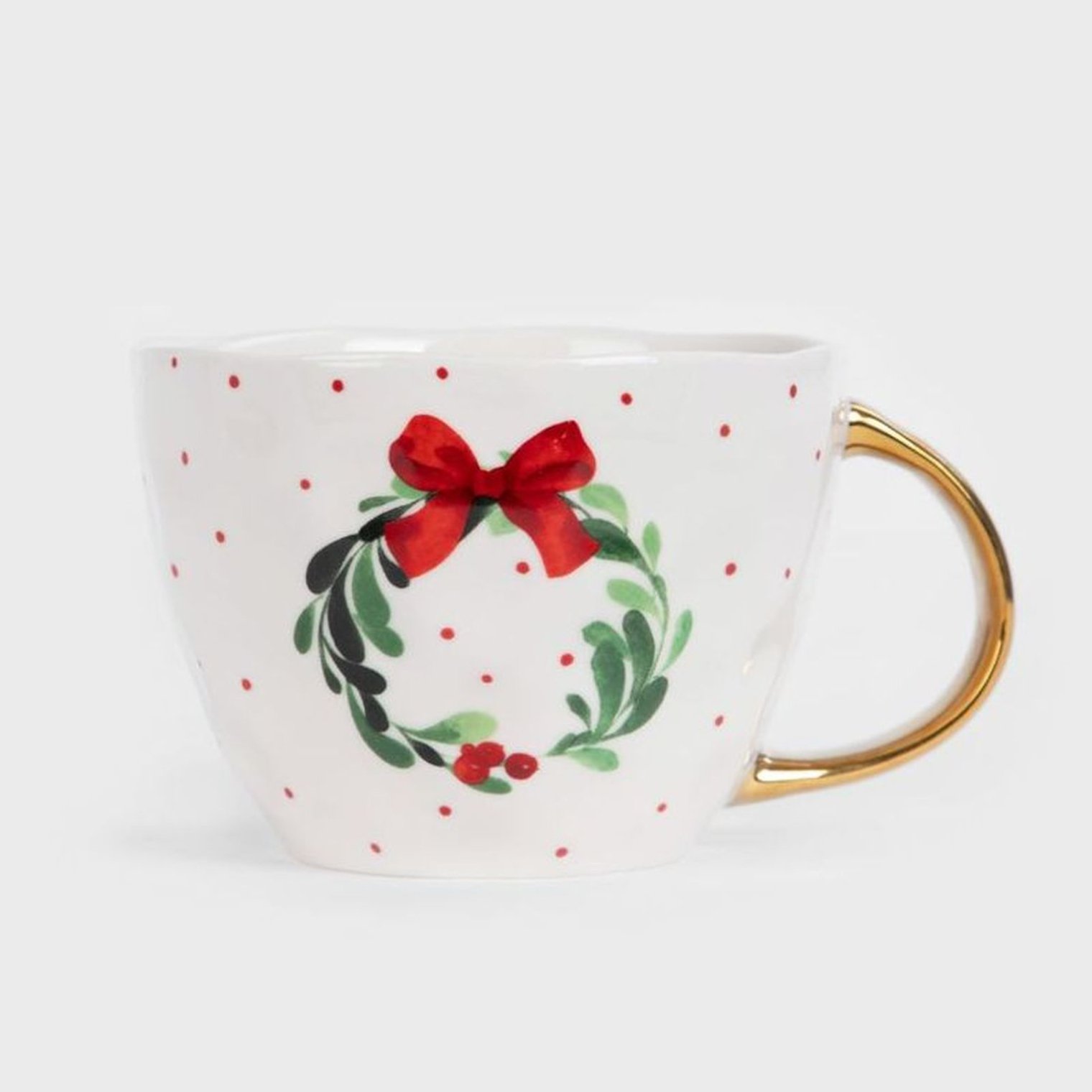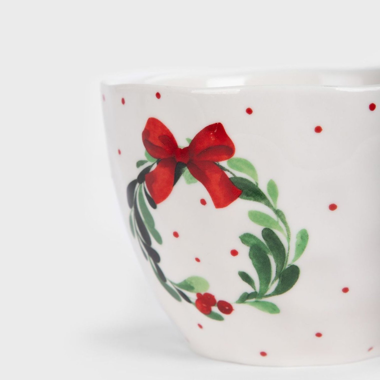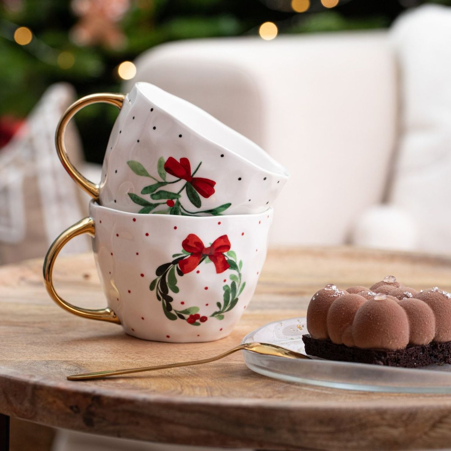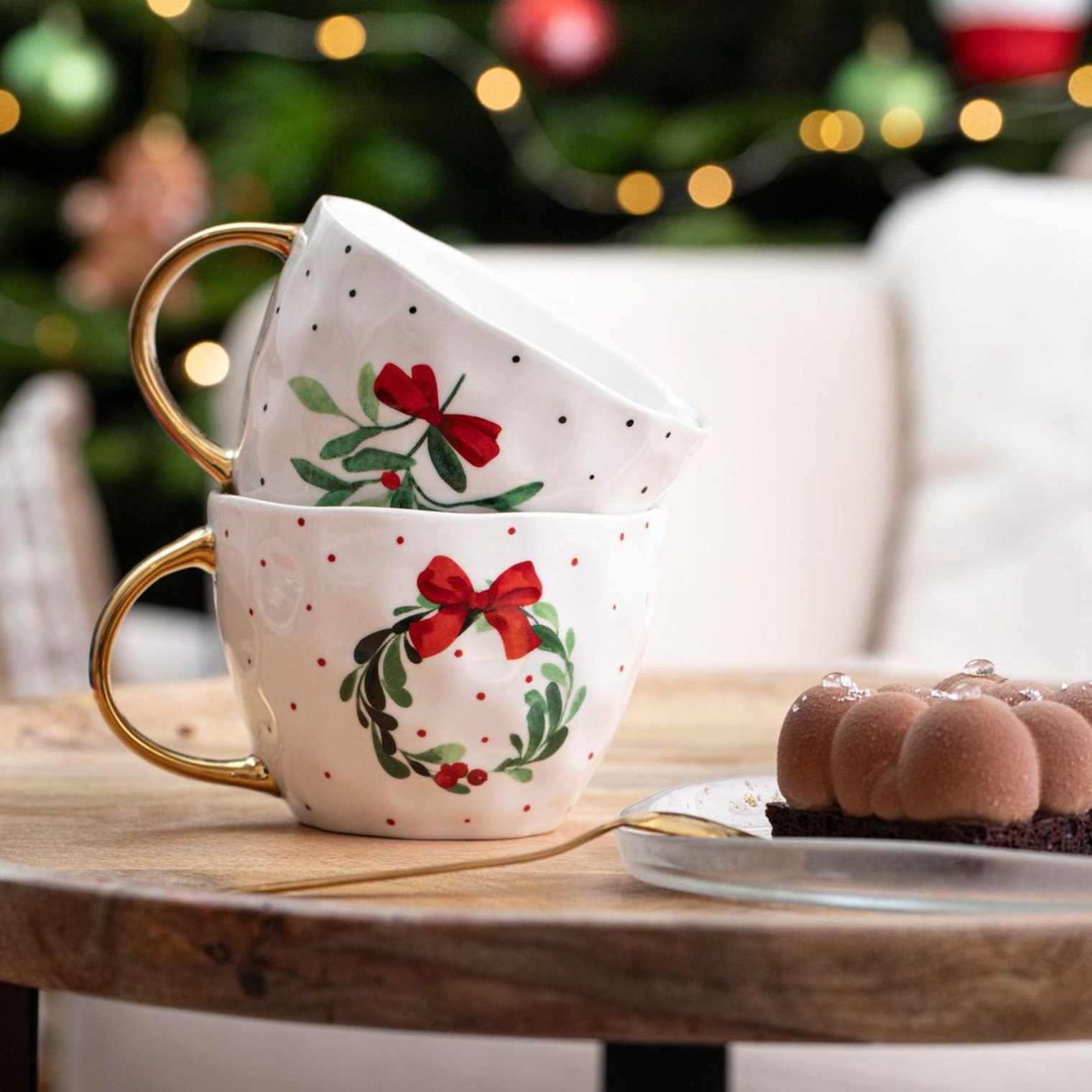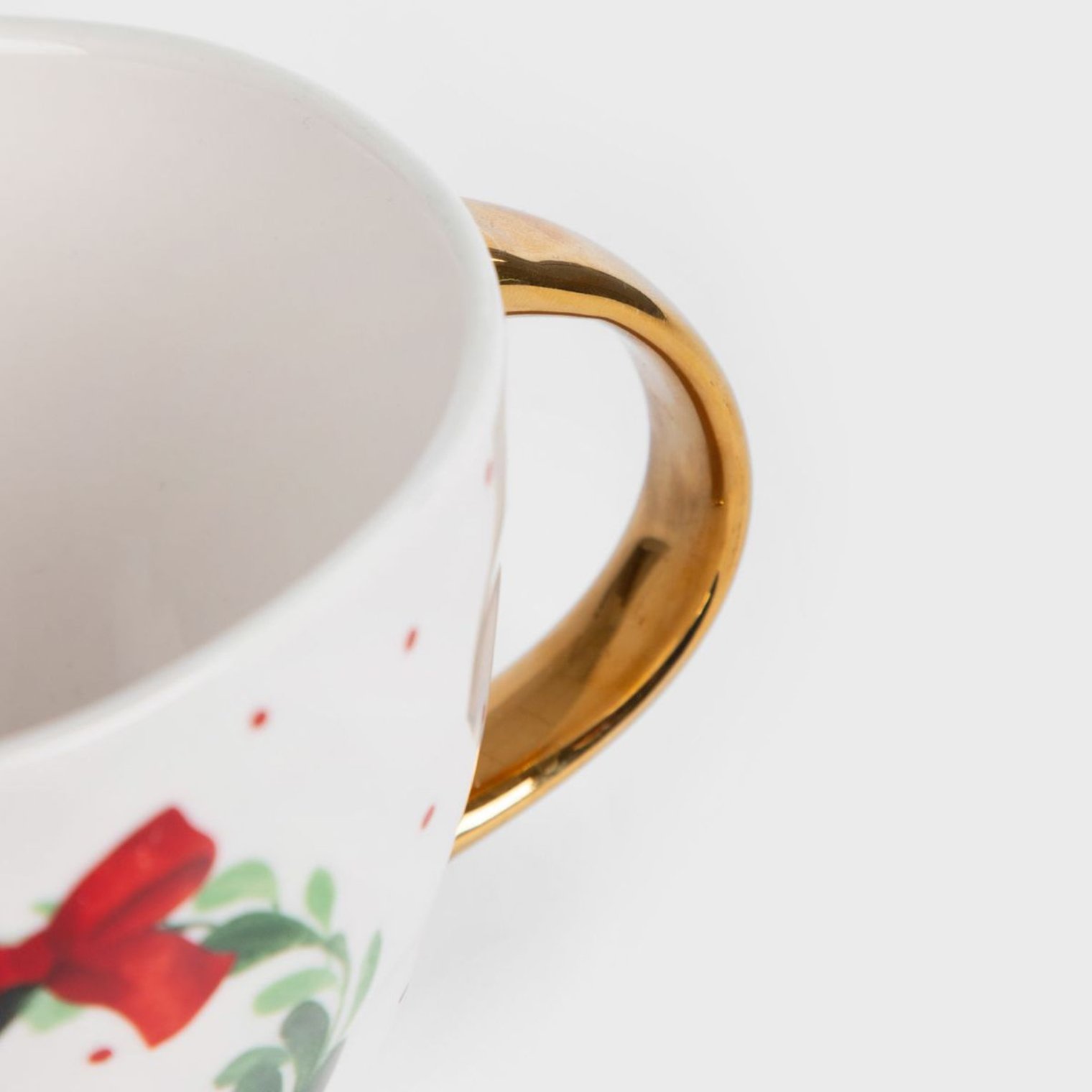 Эта рождественская кружка — идеальный выбор, чтобы добавить капельку волшебства в повседневные моменты с любимым чаем или кофе. Её поверхность украшена нежным узором в виде венка, украшенным красным бантом и листьями падуба. Маленькие красные точки, разбросанные по всей кружке, добавляют очарования. Кружка имеет элегантную позолоченную ручку, которая прекрасно контрастирует с белым фарфором.