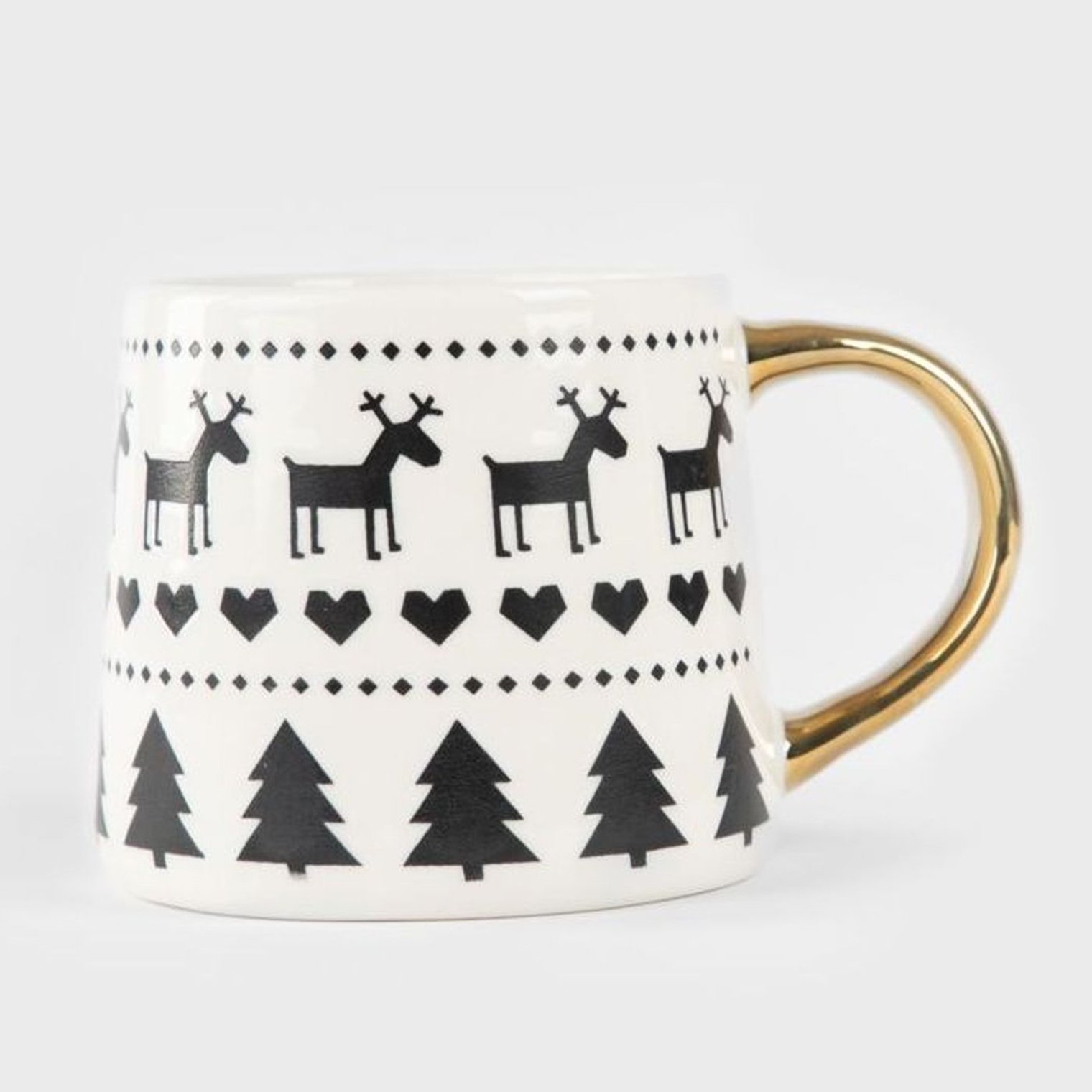 Кружка LICOLA уникально сочетает в себе индустриальный дизайн и изысканную элегантность золотистой ручки. Узор с чёрными оленями и рождественскими елками на белом фарфоре придаёт ей минималистичный, но праздничный вид. Благодаря большому объёму 450 мл вы можете приготовить большую порцию кофе или любимого чая.