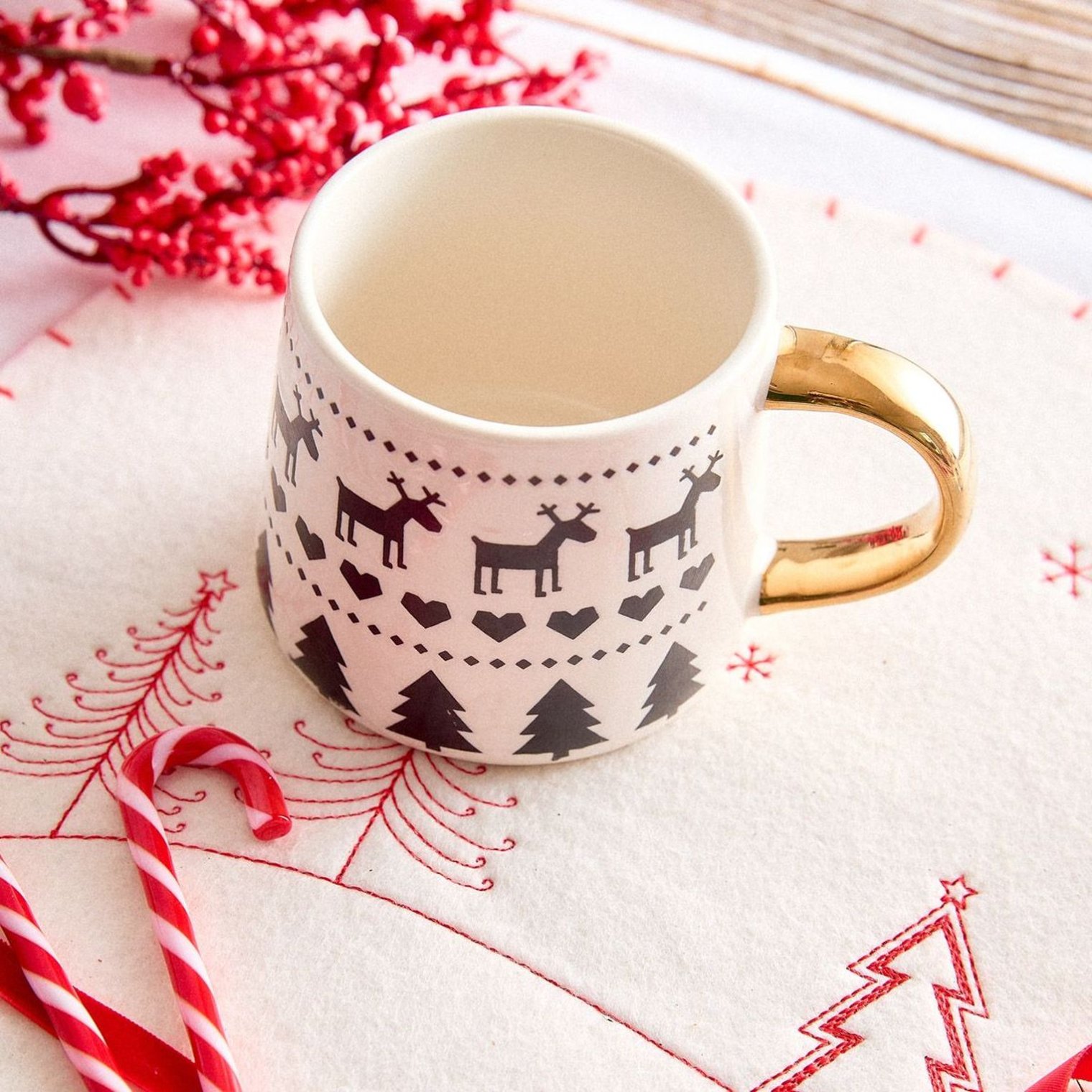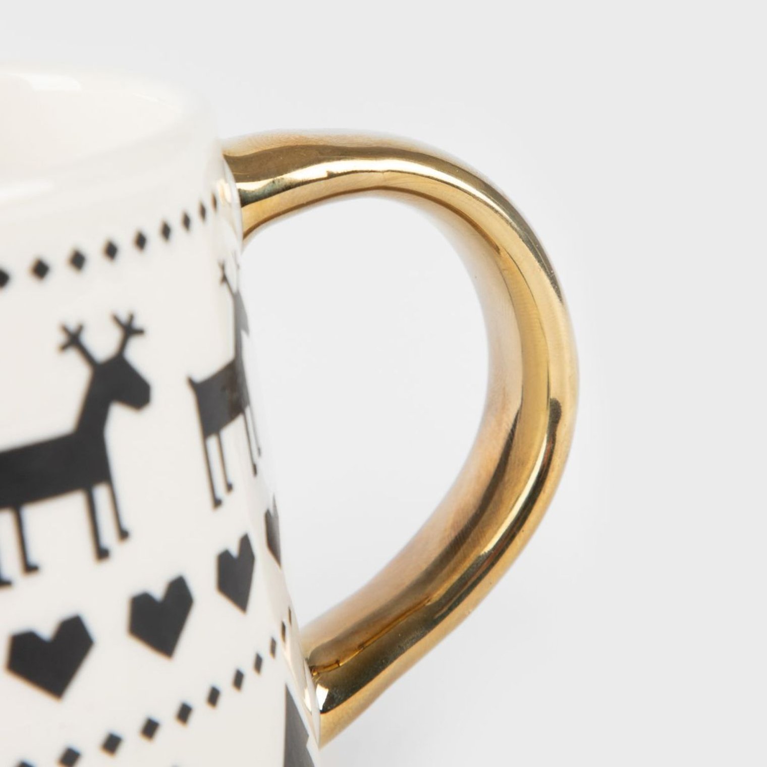 - Золотистая ручка контрастирует с индустриальным узором в виде оленей и рождественских елок