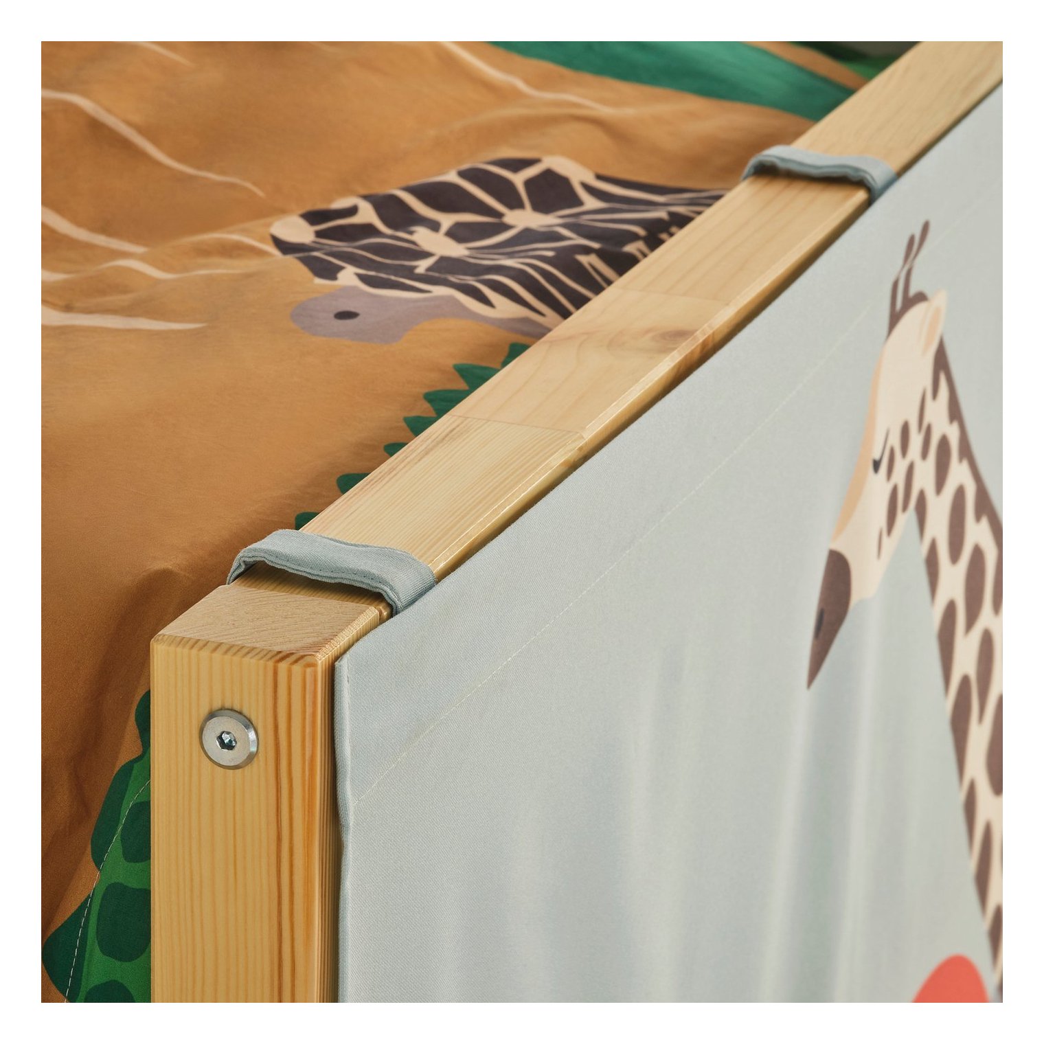 Он состоит из трех частей, которые легко подвешиваются на край кровати с помощью металлических крючков.