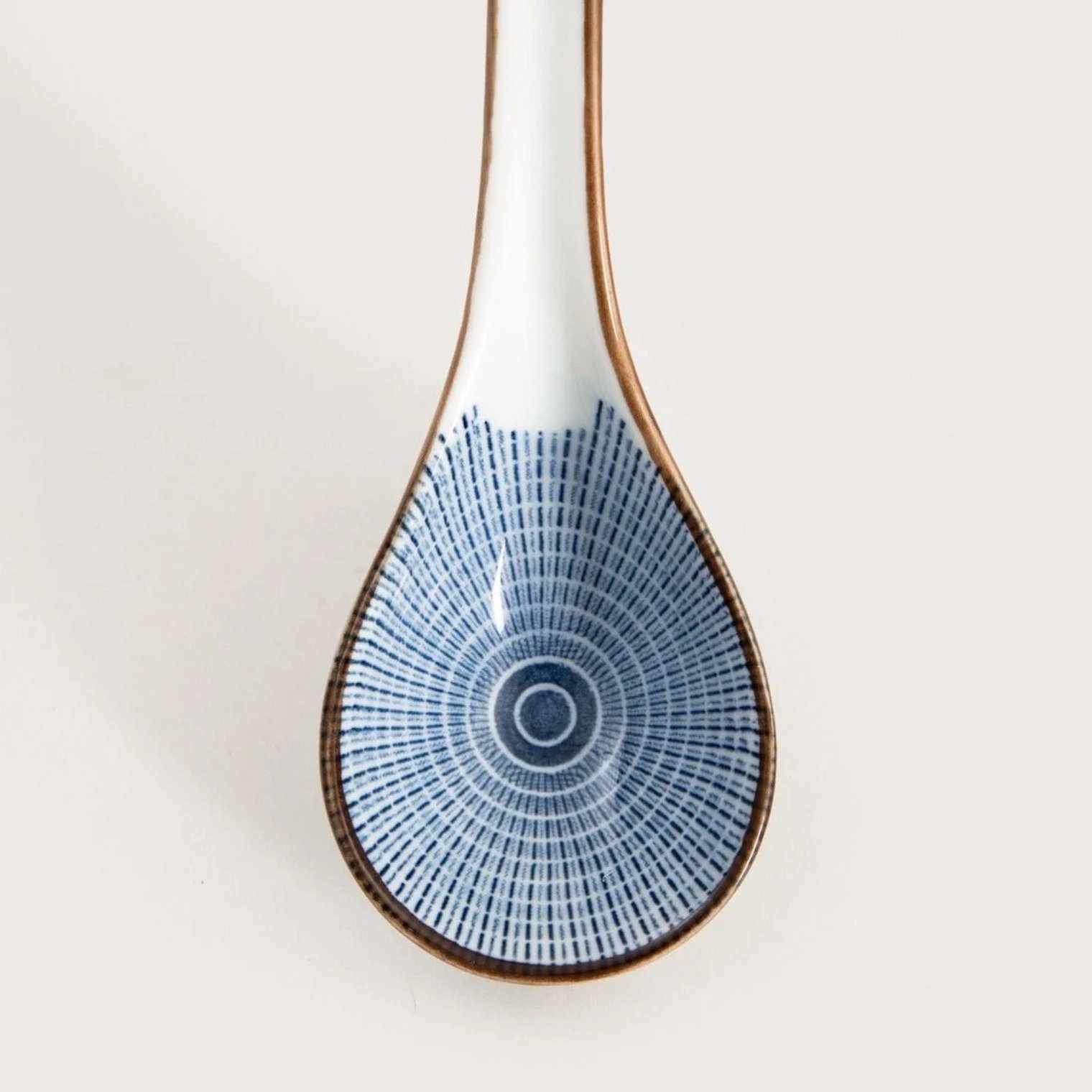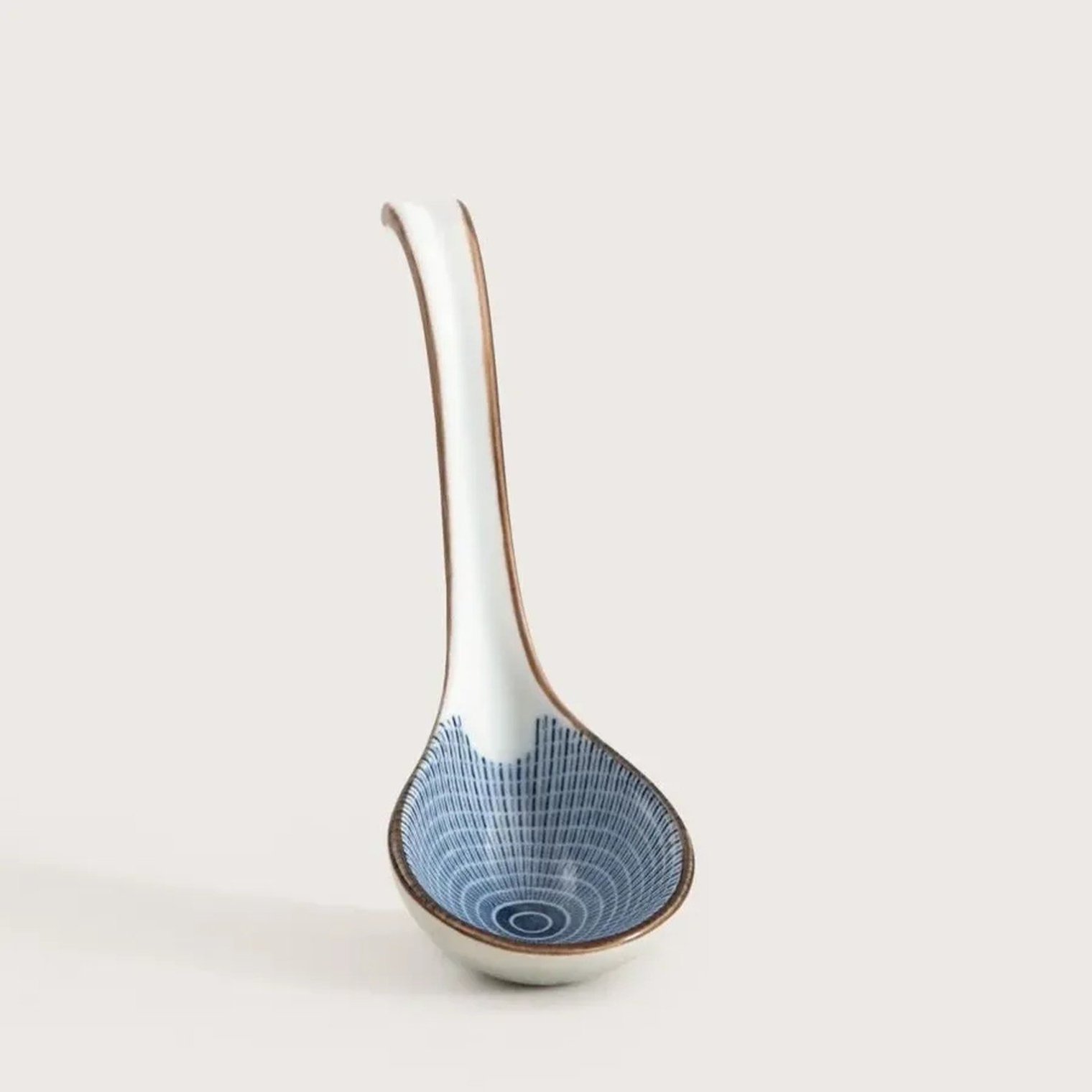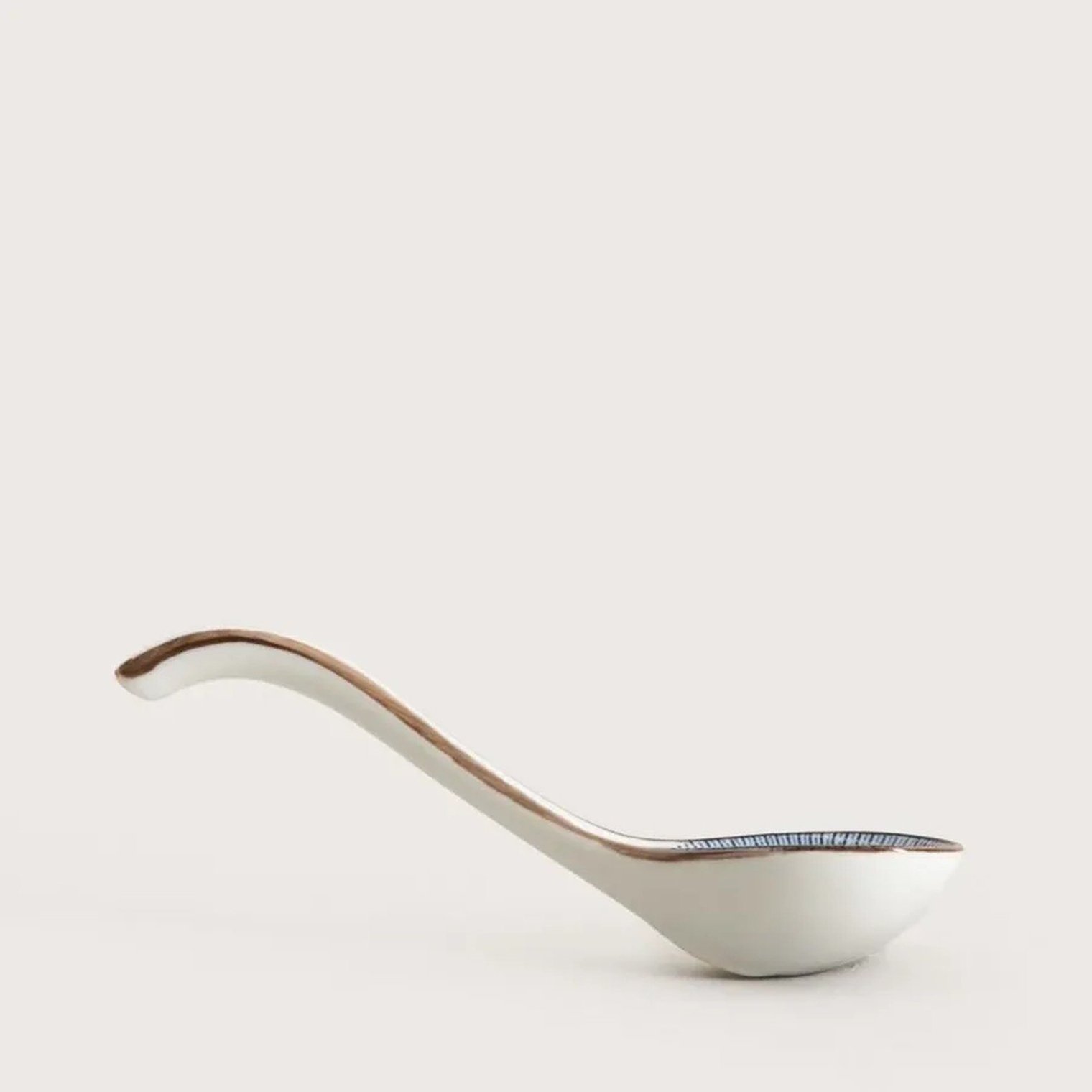 Ложка для рамена SALADO диаметром 16,5 см с полосатым узором и коричневым ободком изготовлена из фарфора , что делает ее удобной для горячих блюд. Гладкая поверхность облегчает зачерпывание бульона и позволяет легко поддерживать ее в чистоте.