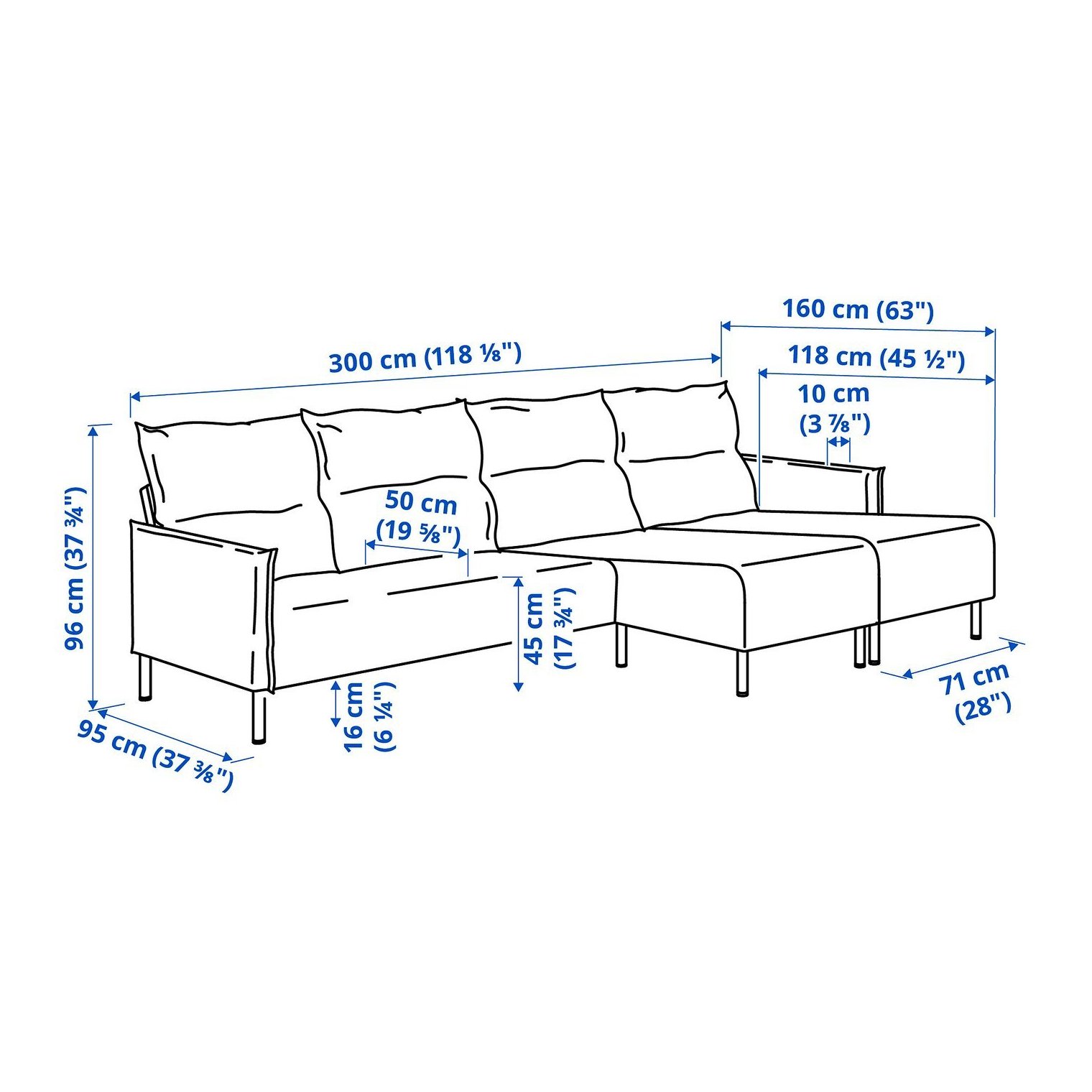 Высота с подушками спинки: 96 см